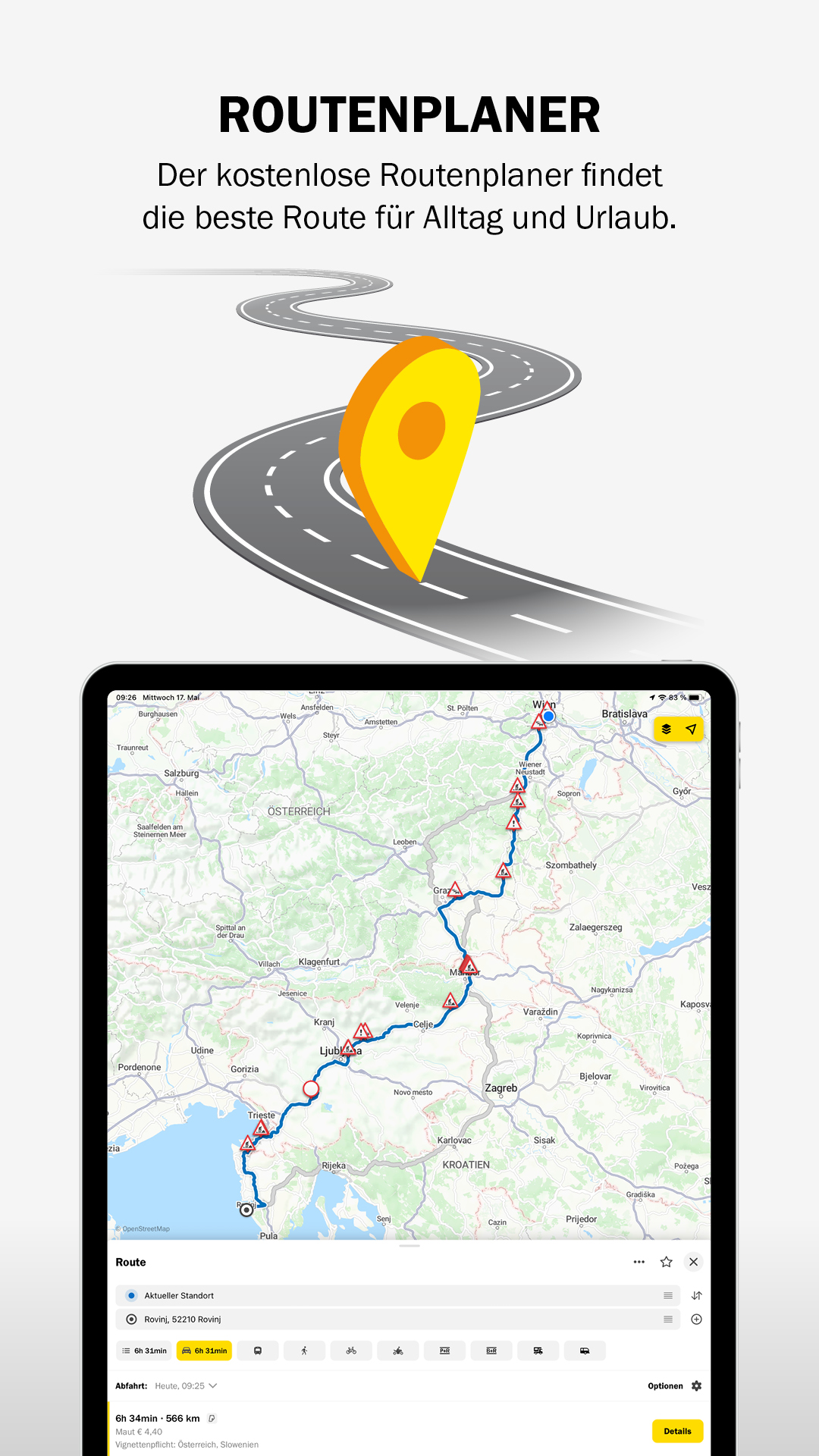 It doesn't matter whether you drive across Europe or take public transport to work. Now, for the first time, it is also possible to calculate routes abroad, including exact toll and vignette prices and detailed information on entry and traffic regulations and much more information. In addition, Traffic Alert, the smart ÖAMTC commuter service, informs you about the current traffic situation on your route or delays in public transport.
