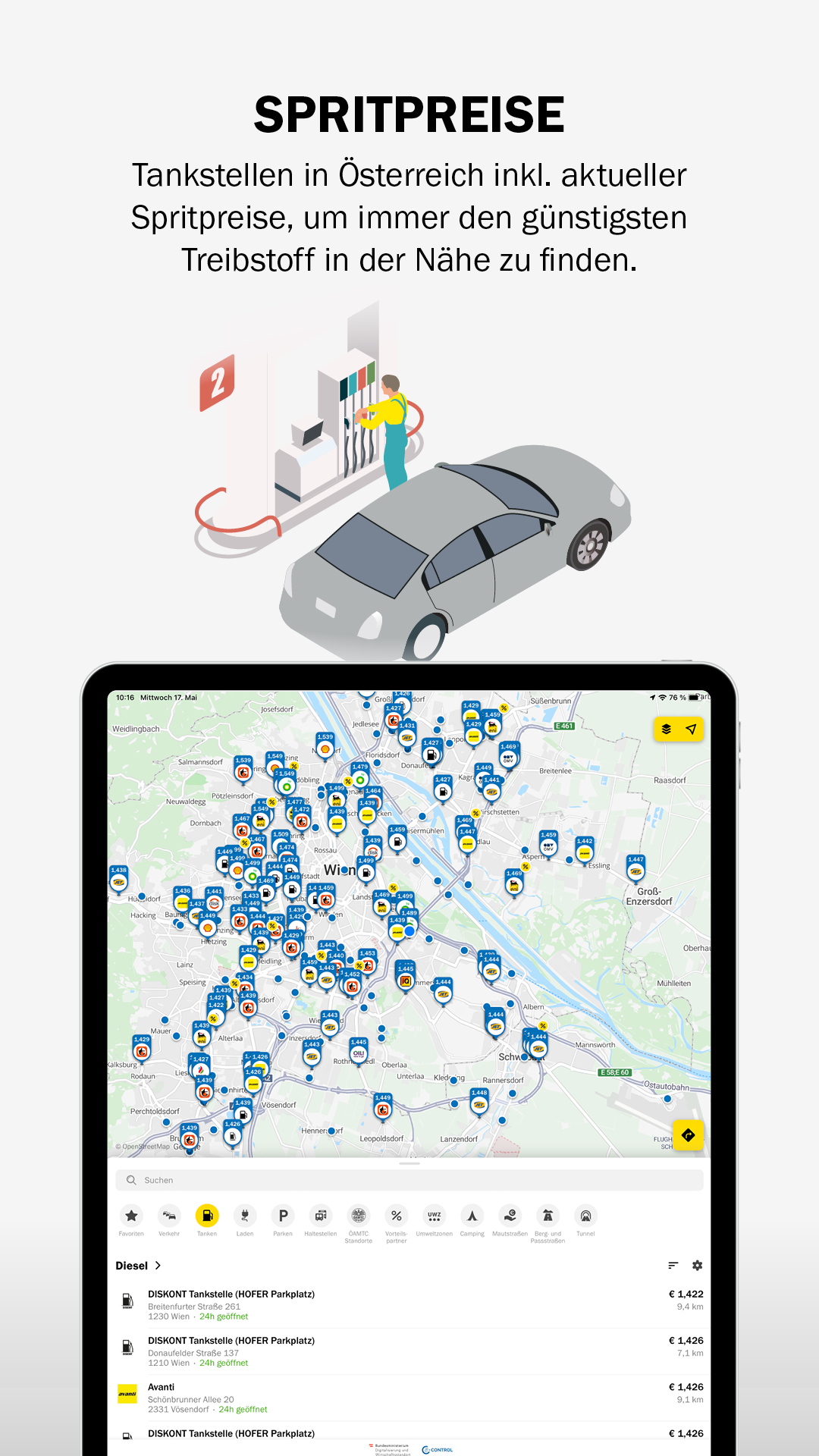 Fill up: Find the cheapest gas station under "Fuel" or watch the prices of your favorite gas stations in the favorites and always find out at which gas stations you can save money as an ÖAMTC member.