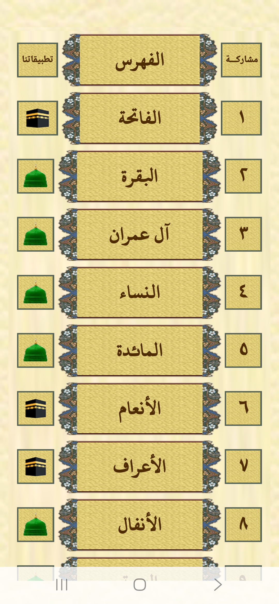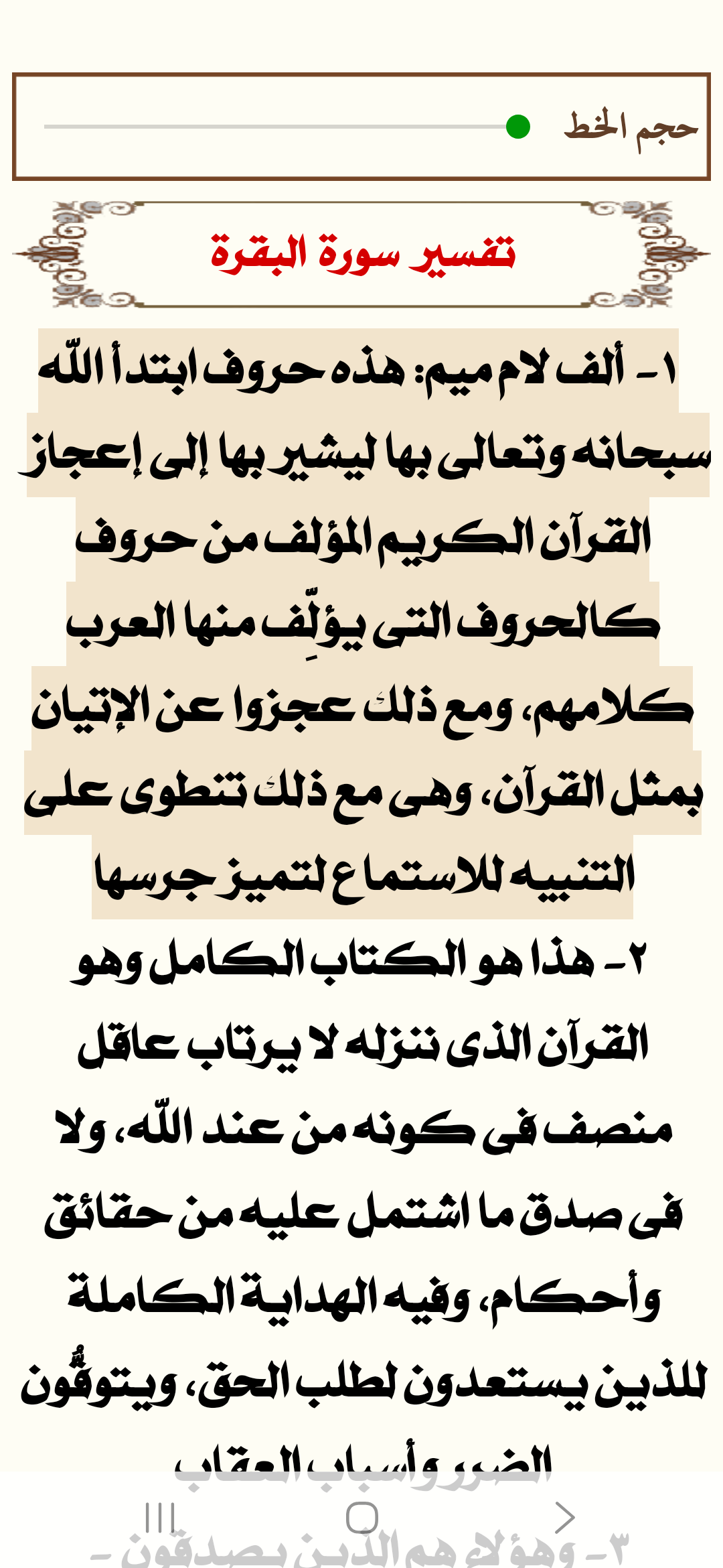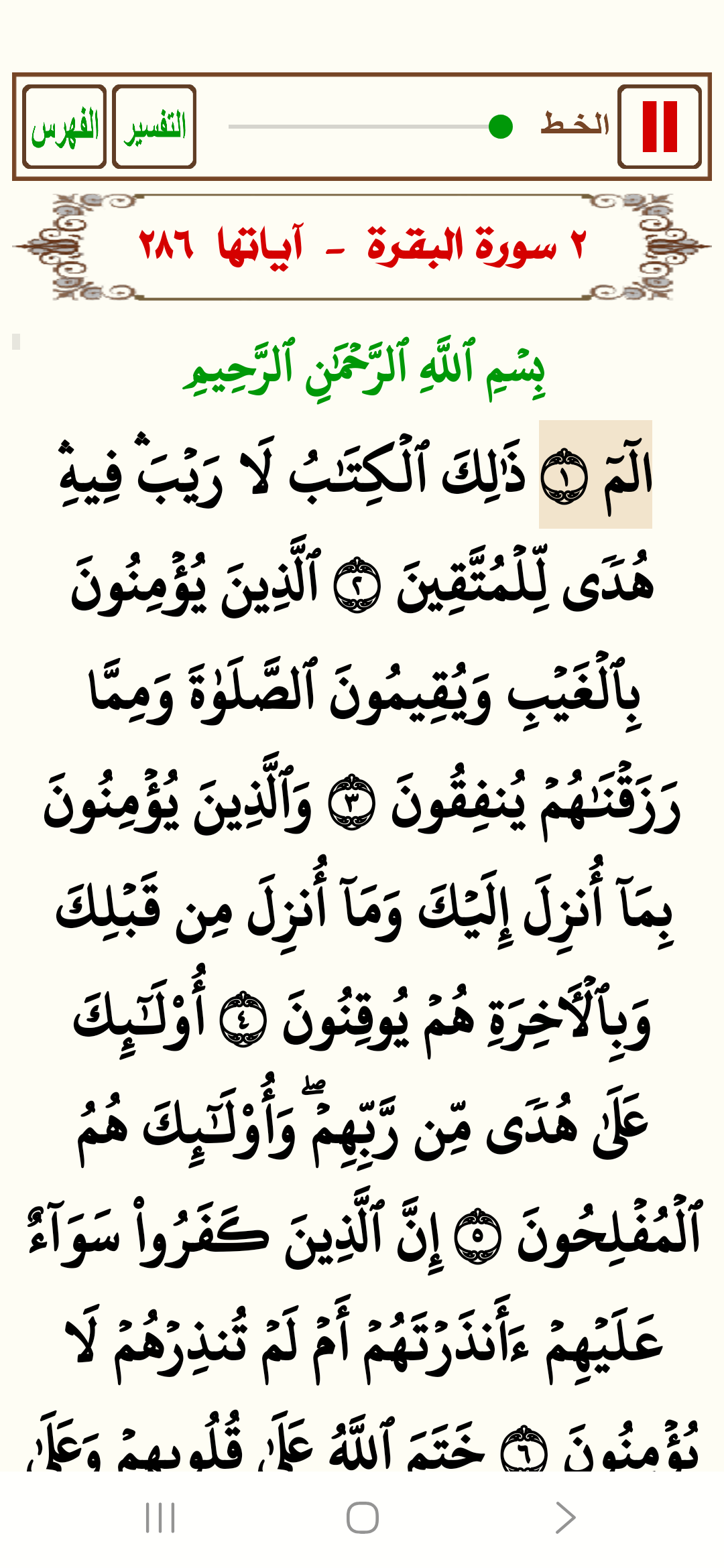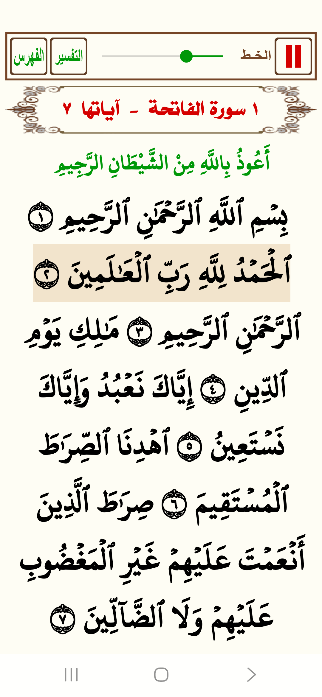 The Holy Qur’an with audio and Uthmani calligraphy accompanying the recitation - does not require an Internet connection after downloading it from Google Play Synchronization between reading and writing Shading the verse during recitation When you stop listening, you can return to the last verse you listened to Move to any verse easily by clicking on it Hear any verse repeated by clicking on it again Copy the verse by long pressing and share it anywhere Synchronize interpretation with verses via the interpretation button on the reading page Possibility to enlarge the font or switch to a larger font size in landscape mode The feature of searching for a word in the Holy Quran