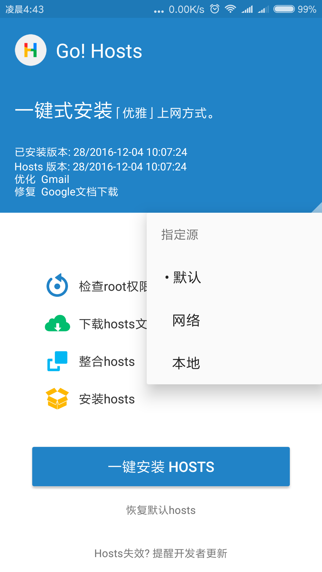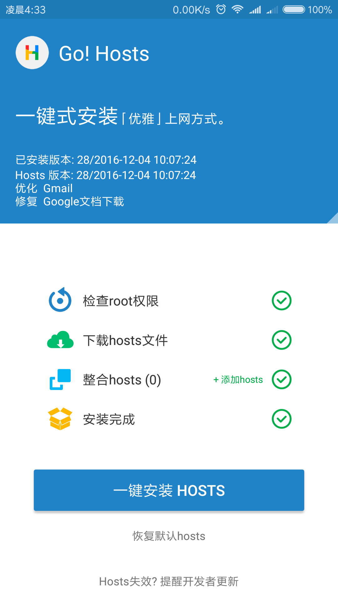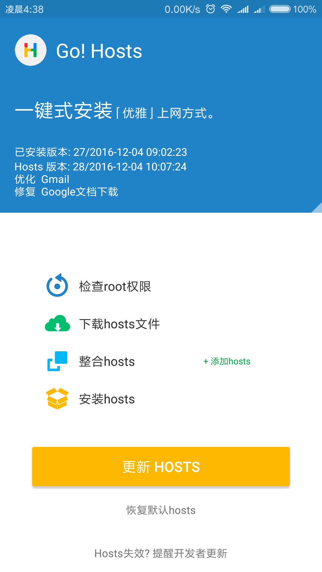 一键 Go Hosts (Package Name: com.lerist.ghosts) is developed by Lerist. and the latest version of 一键 Go Hosts 1.1.5 was updated on January 1, 2017. 一键 Go Hosts is in the category of Tools. You can check all apps from the developer of 一键 Go Hosts. Currently this app is for free. This app can be downloaded on Android 4.1+ on APKFab or Google Play. All APK/XAPK files on APKFab.com are original and 100% safe with fast download.