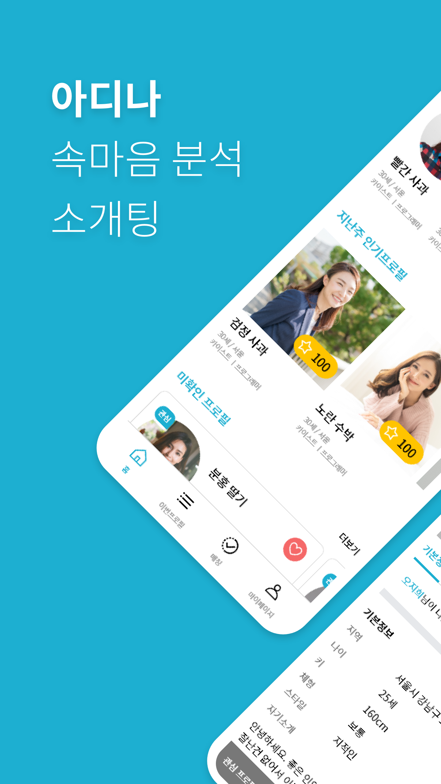 다른 소개팅앱에서의 수익 활동인 프로필 정보 열어 보기, 관심 표현하기의 활동은 모두 무료입니다. 과금 없이도 아디나 서비스를 이용하실 수 있어요.