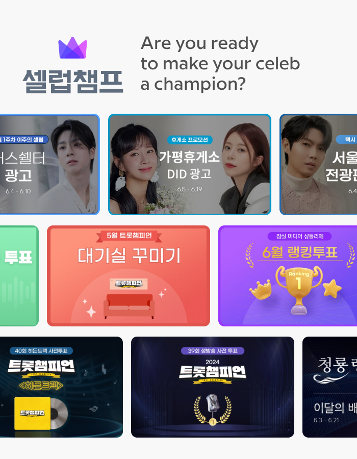 - You can support your celebrities with various benefits only available at Celeb Champ, such as subway ads, outdoor ads, magazine ads, and YouTube ads.