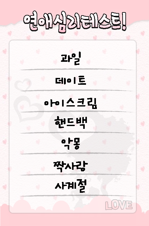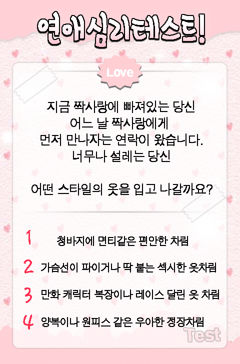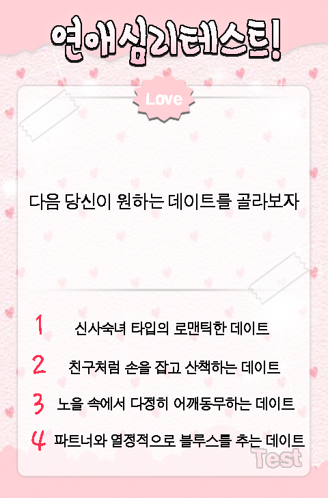 초간단 연애,사랑심리테스트! 아직 솔로이신분들이나 짝이 있으신분들까지 남녀노소 누구나가 쉽게 할수있는 정말 간단한 심리테스트입니다. 과연 나의 연애성향,심리는 어떨까요? 정말 간단한 테스트를 통하여 확인해보세요^^
