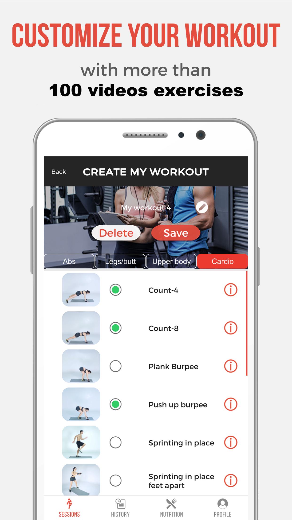 Sessions specially created by our professional coaches with a focus on all body parts. 101 Fitness adapts to you and gives you a personalized training program with bodyweight exercises, the right number of sessions/week, level and goals.