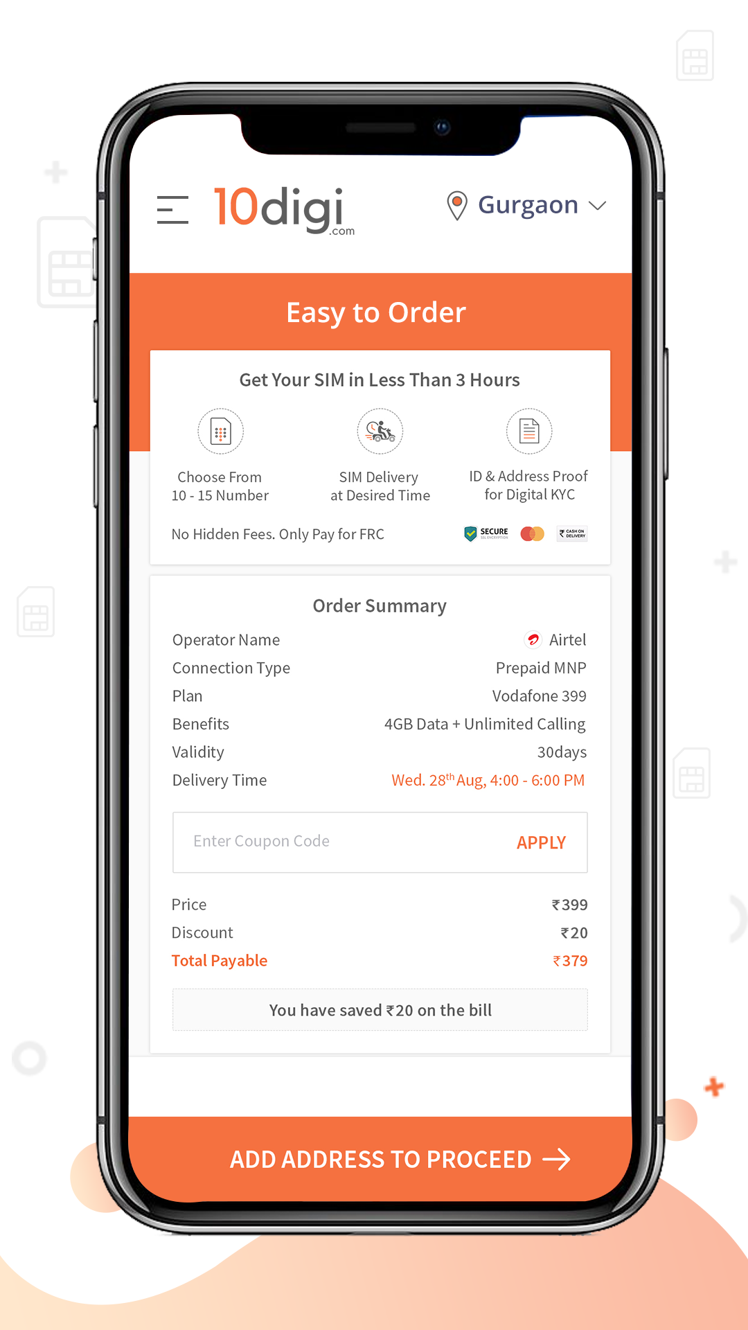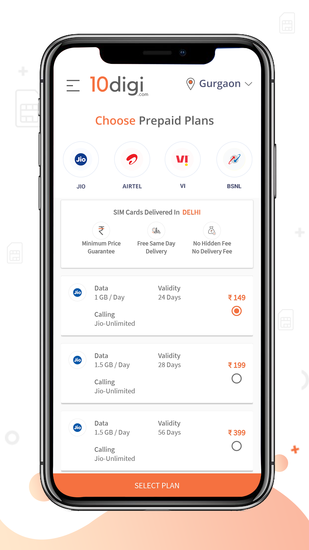 Need a new SIM or wish to port your number? Use 10digi.com to get your SIM delivered home with free delivery and instant activation. Using the 10digi app, you can order a new SIM connection (from any available operator) or port your number online. We have all these options listed on the app so that you can conveniently choose your connection type and get it delivered at your location. At 10digi, we have SIM connections from all the top providers. Here is how 10digi makes life easier for you: Get a new connection: Remember how you bought your SIM connection? Things have changed now. 10digi is the new way of buying SIM online. You can choose from: Airtel Postpaid connection, Airtel Prepaid connection, Vi Postpaid connection, Vi Prepaid Connection, Jio Prepaid connection or BSNL Prepaid Connection. Choose a plan (Prepaid or Postpaid) of your favourite telecom operator in your desired location. We are present across various parts of India. Port your number: Now you don’t have to tolerate the call drops and low data troubles. You can easily port your number sitting at home. Download the app and select the network that you wish to port to. You can port to Airtel/ port to Vi, port to BSNL, port to Jio with 10digi.com. Select your plan: For both new connection or mobile number portability, you can choose a plan that fits your requirements. Compare the benefits from all the operators at just one app and select the best for you. Transparent pricing: Pay only for the plan that you choose. There are no additional charges involved for your order. We don’t charge for delivery, taxes or SIM cost (like most of the retailers do). The billing process is transparent and involves only the plan you choose. Super fast delivery: Get delivery in just 1 hour or at a time slot of your choice. We are committed to deliver your SIM connection at your selected time slot. Our delivery executives, whom we proudly call as our SIM-MEN are present across Delhi-NCR to deliver you SIM and help you in the activation process. Live order Tracking: You can see the exact location of our delivery executive and get live updates of your order. Get total control of delivery in your hand. Pay on delivery: Don’t worry about payments. Pay when our delivery executive reaches your location with your new SIM connection. Get your new connection or port to any connection sitting at home with 10digi. Install 10digi now and get FREE DELIVERY for your new connection or to port your number. We deliver SIM in the locations like: Delhi, New Delhi, Gurgaon, Noida, Mumbai, Pune, Bengaluru, Hyderabad, Jaipur, Mysore, Chennai, Bhopal, Ahmedabad, Nagpur, Nashik, Mangalore, Hubli, Gulbarga, Meerut, Bhubaneswar and many more cities to be added soon.
