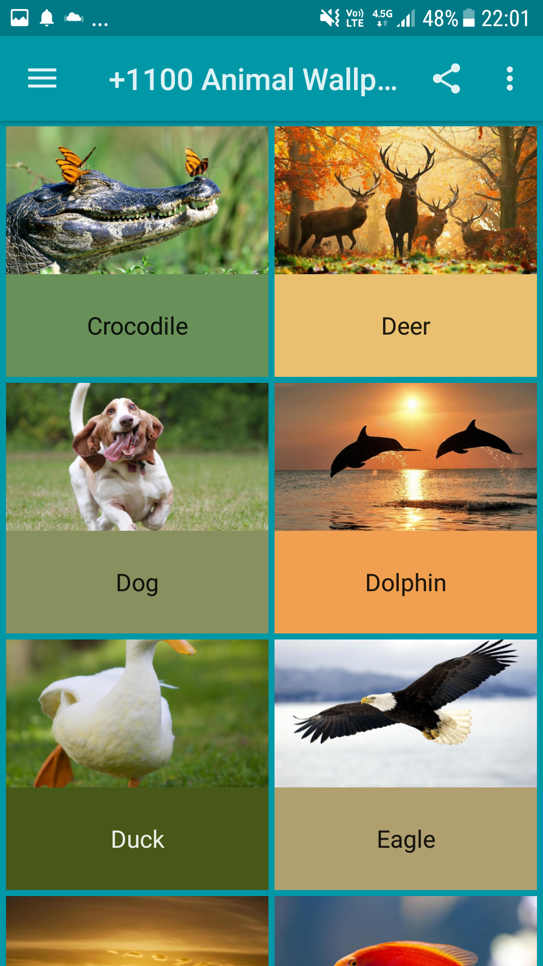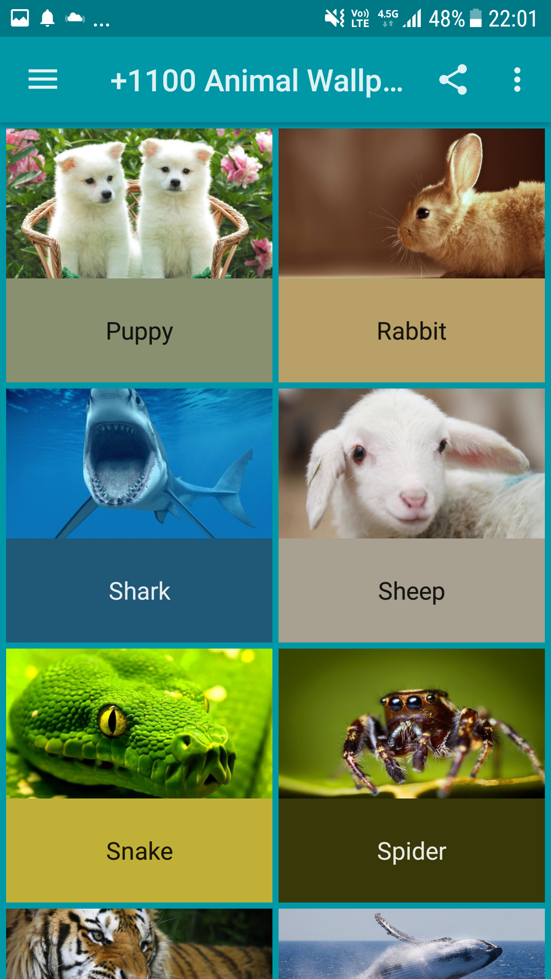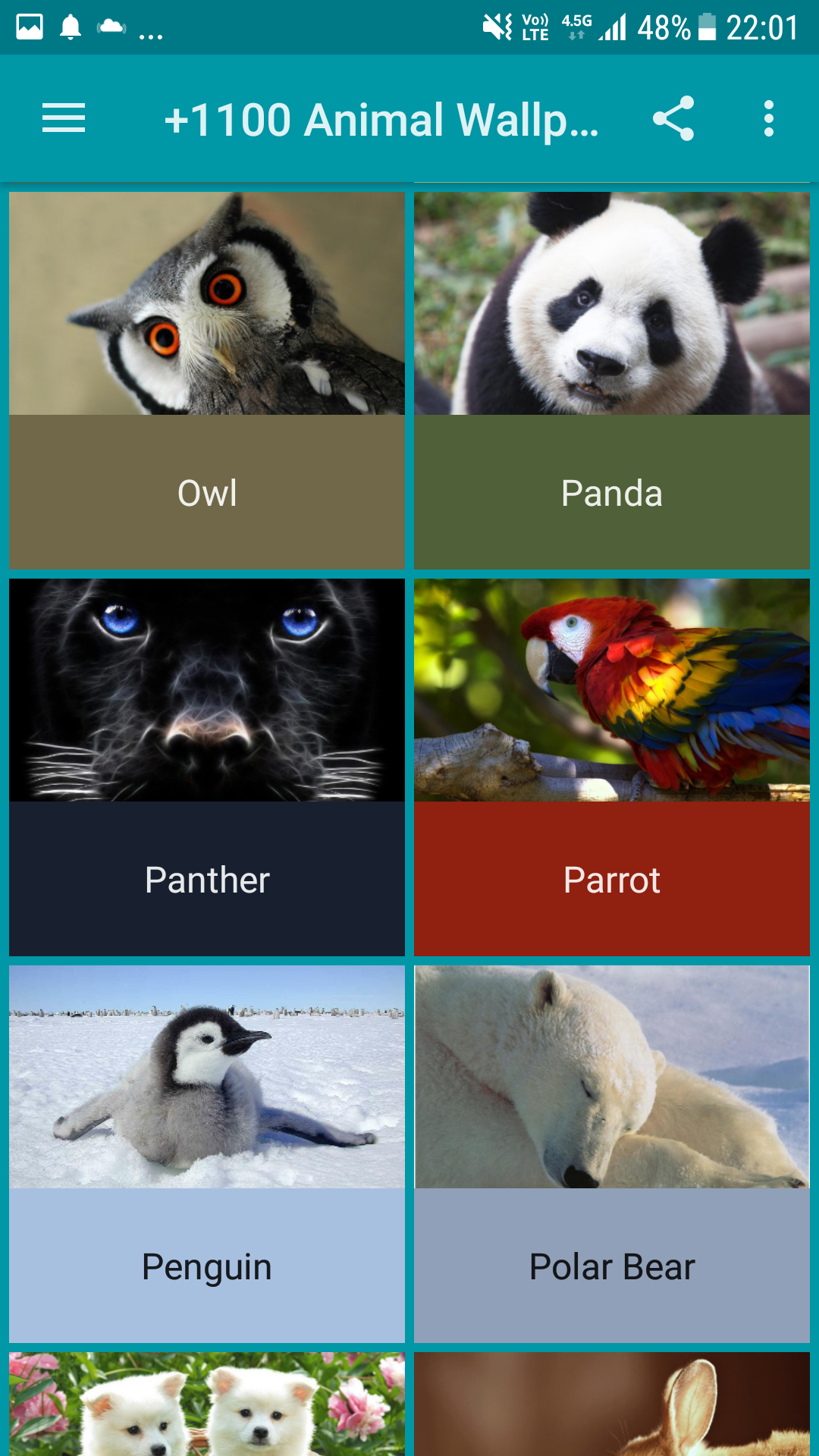 This app contains wallpapers of various animals. You can view and use more than 1100 wallpapers by means of this app. Here are the animals which are included in our app: Bear, bird, butterfly, cat, cheetah, cow, crocodile, deer, dog, dolphin, duck, eagle, elephant, fish, fox, goat, horse, hamster, jaguar, kitten, ladybug, leopard, lion, monkey, owl, panda, panther, parrot, penguin, polar bear, puppy, rabbit, shark, sheep, snake, spider, tiger, whale, wolf and zebra. You need internet connection in order to view the animal images.