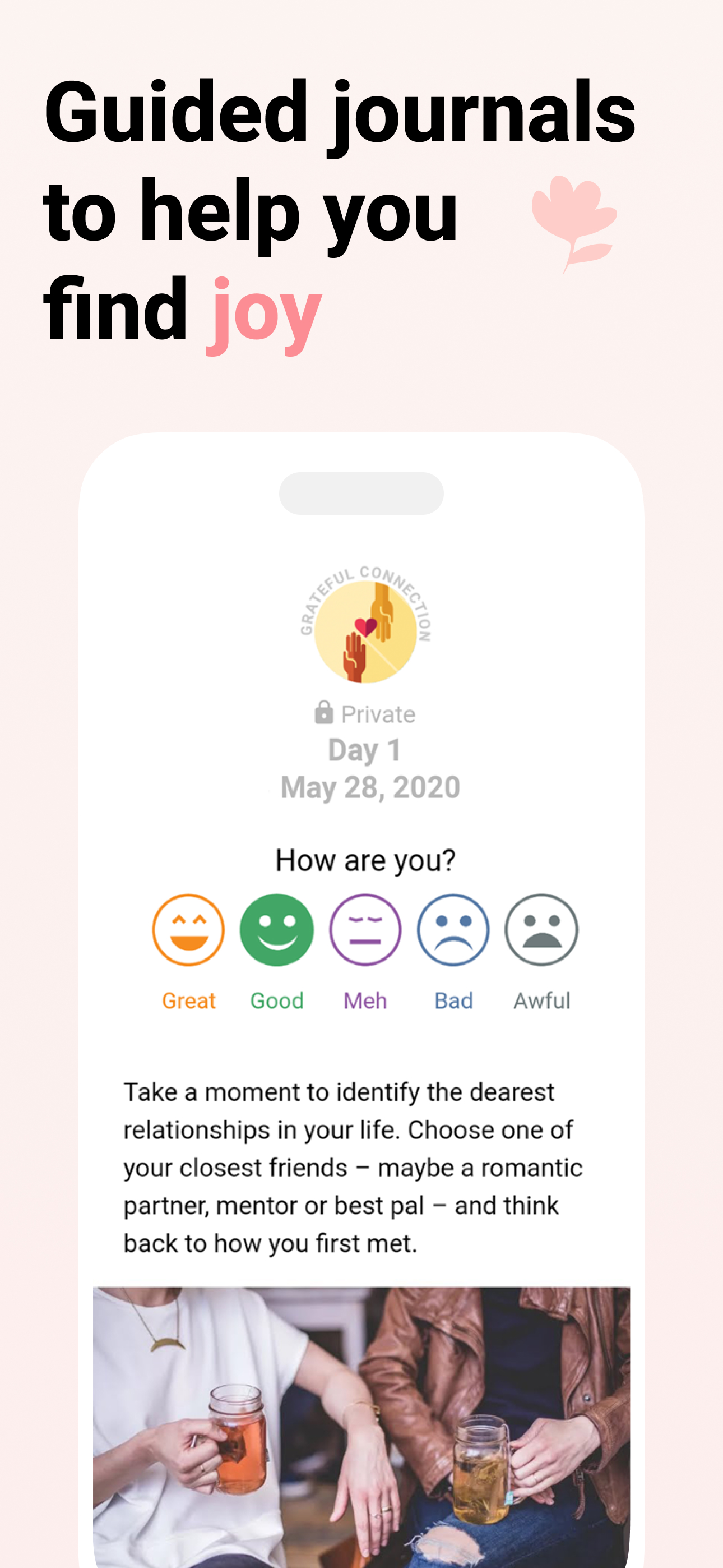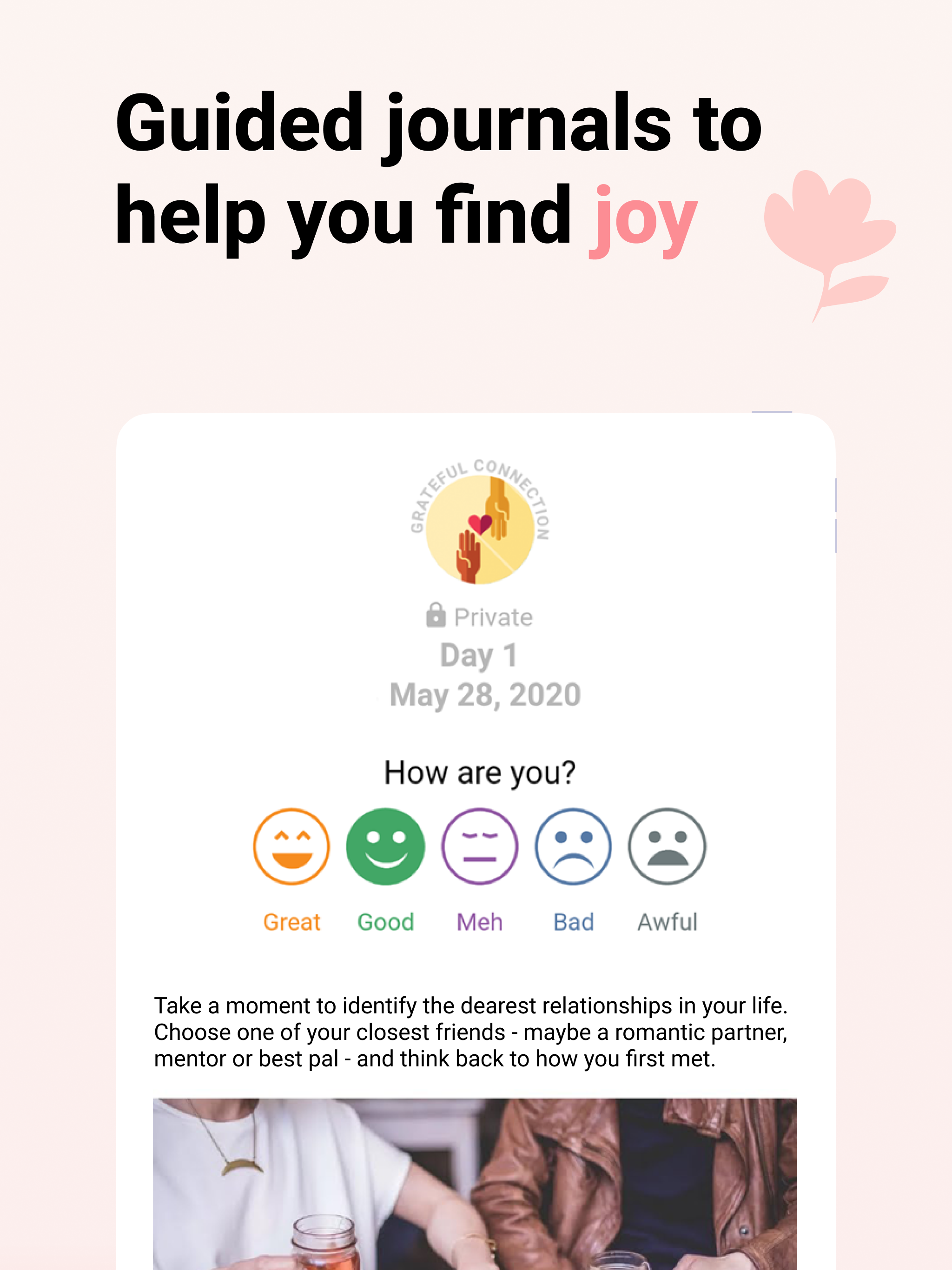 GRATITUDE JOURNAL 365 - MORE THAN A JOURNAL 365 Gratitude is a science-backed gratitude journal that makes self care fun! Receive daily stories, affirmations, and journal prompts that teach life-changing lessons about self improvement and self growth! Boost your happiness and mental health using 365 Gratitude. This free gratitude journal helps with self growth. *It's not really an 'app'. It's a family of gratitude warriors that want to improve their lives and I know it has helped to save mine many times over. Beyond wonderful.* Shannon Dohr-Andersen *Making a gratitude list is one thing, and having journal prompts to guide your writing is a whole different level! This is where 365 excels. The journal prompts are thoughtful and thought provoking.* Tony Fuentes *With insufficient time for therapy sessions, I took a chance on this Joy chatbot. I was deeply impressed by its level of understanding towards my emotions, the precision of its responses, and its capacity to offer meaningful advice, and healing.* Grace Thompson Use our Gratitude Journal as a personal growth mentor and Self Help Coach for anxiety relief and improving your mood. A very useful mood journal. This Gratitude Journal is a community. The largest gratitude community in the world focused on self growth and self improvement. Rely on each other for motivation. A true companion for selfcare. 365 Gratitude Journal is a happiness coach. Our self growth AI will guide you with interactive CBT Therapy and mindfulness exercises for stress and anxiety relief and improve your relationships and overall mood. Find the happier version of yourself. 365 Gratitude Journal is a daily affirmation guide - unlocking your limitless potential for self growth using a self help plan developed by experts. Unlock the benefits of positive affirmations. Meet your ultimate free self care journal, free self help companion! Enjoy the benefits of positive daily affirmations. 365 Gratitude Journal acts as a guided self growth, self-help journal that focuses on positive experiences, fostering gratitude, and nurturing overall well being through daily affirmations and gratitude journal prompts. By regularly recording things you are grateful for, you can shift your mindset towards self growth, increase self esteem, and cultivate a more positive outlook, practice more self love. 365 Gratitude is your mental health companion for Self Improvement and Personal Growth! ## TOP 5 REASONS YOU SHOULD TRY 365 GRATITUDE JOURNAL 1. Get self-help for stress and anxiety relief, improve mental health, and find your healing. 2. Replace negative thinking and toxic self-talk with positive daily affirmations and self love journals. 3. Connect with like-minded people for self growth and selfcare. Use the gratitude journal together. 4. Deal with stressful situations, cultivate self control and find solutions for life challenges with our self healing courses. 5. Cultivate self confidence, self care, self love and foster stronger relationships. Remember, the journey of self healing, self control and self help is just a click away! Practice manifesting to attract the positive things you want. In just five minutes a day, you can change the way you think about yourself and the world with this powerful-yet-simple practice of self care, kind of like a 5 minute journal. Change your attitude – and change your life! – with 365 Gratitude Journal