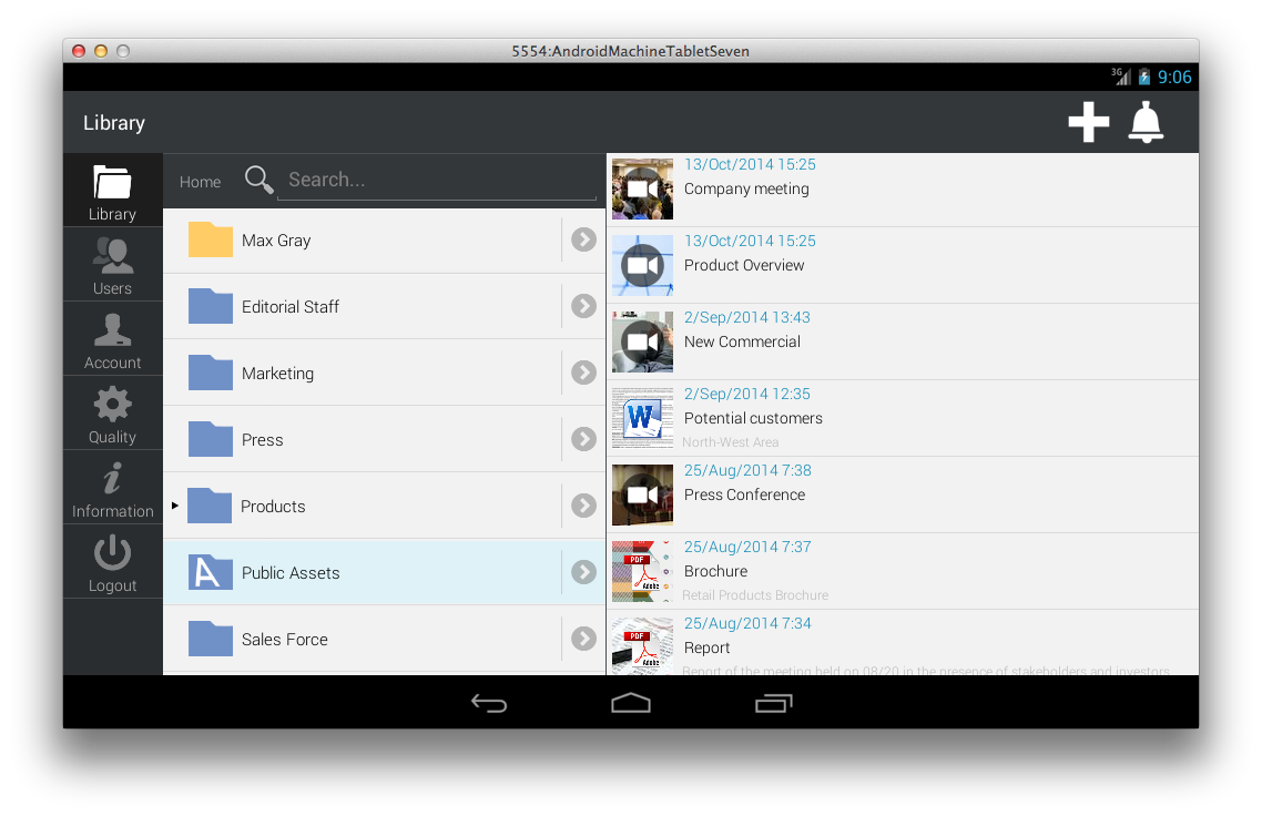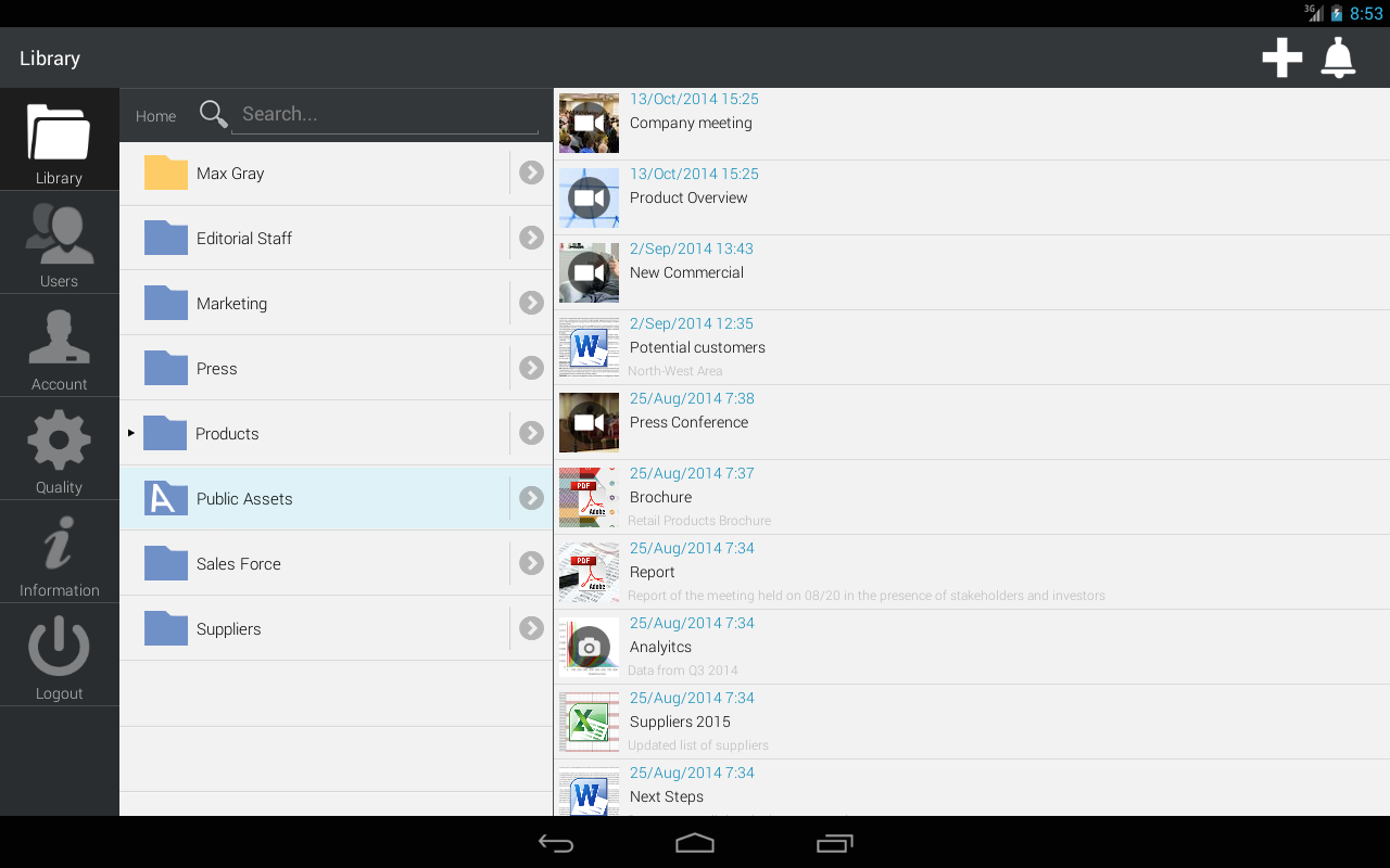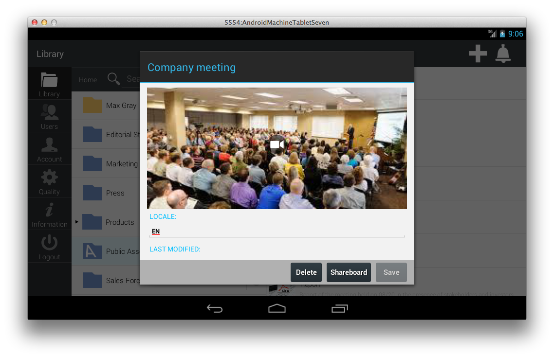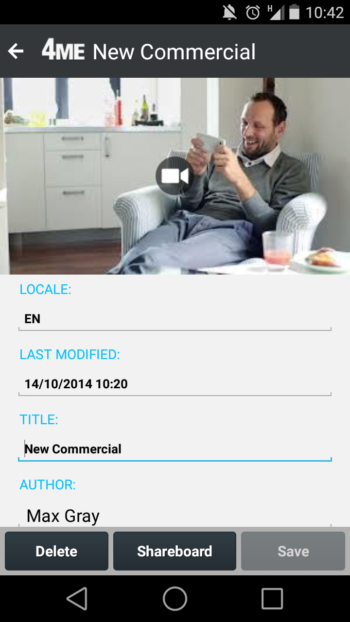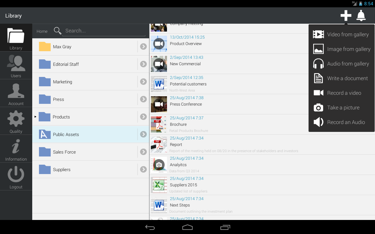 4ME is the most innovative App you need to control all digital contents in your company. The app allows you to take advantage in your smartphone of the potential that the platform 4ME offers to your business. 4ME is the platform to ease the way companies manage, share, publish content and keep track of their use. It helps make better decisions and to focus on business instead of spending time for the administration of content on multiple platforms. With 4ME you centralize the management of your digital content through a single platform, share them with co-workers, partners and customers, publish them on multiple channels. You don't create copies anymore and you now have complete control. You know where your content is published, who has access to it and for how long in order to make effective decisions. 4ME integrates with existing platforms in your company and it automatically manages content through plug-ins and dedicated connectors. 4ME allows you to distribute your content across all channels (web, social networks, intranets, digital signage, etc.). It keeps track of their distribution in a simple dashboard. Highlights ---------------------- 1. You can upload content, manage them, publish and share them with a simple dynamic system of shared folders. You can freely manage any type of document (video, images, audio, files, etc..) and keep track of how the content is used. 2. Self provisioning Live Streaming, real-time push Notifications, native client and mobile app. Exhaustive rights management system with workflow process management, audit control and certified compliance with legal standards. 3. Developers can leverage all features using API, SDK and ready-to-use Widget Library all available in the 4ME App Center. Accelerator is the plug-and-play appliance for intranet and LAN acceleration and optimization, live and on demand interchange Main features ---------------------- - address book. - content creation and metadata management. - content archiving. - content organization with personal folders (inbox) and shared folders. - groups control and workflow. - cooperative chat system through single or group chat rooms. - a powerful recorder with markers to enhance multimedia contents creation. - upload audio notes, videos and pictures directly from in-app. - a shareboard to let you know where your contents are shared at any time.