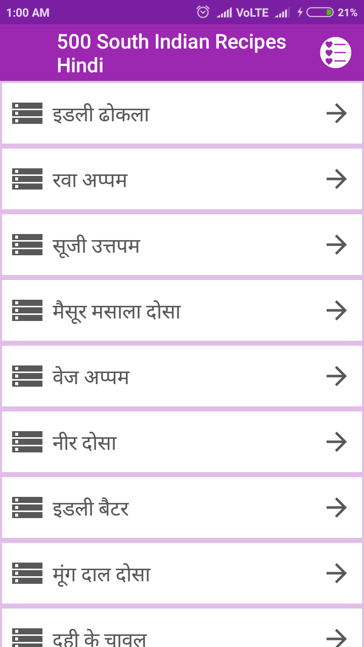 South Indian cuisine is much-loved across India, especially its wide spread of breakfast treats like Idli , Dosa and uttapas. However, there is much more to South Indian cuisine, including a large variety of rice dishes, one-dish meals, main course dishes like Sambhar , Rasam , etc., accompaniments like chutneys and salads, as well as preserved foods like podis (powders) and pickles. This app helps you explore a large goldmine of recipes from all over South India, ranging from the satiating Keralite dishes like Appam , Avial and Kadala Curry, to spicy Chettinad delicacies, tongue-tickling Karnataka delights like Rava Idli, Andhra Pradesh specialties like Pesarattu and Tamil Nadu recipes like Adai , Sambhar and Chakra Pongal . You will discover the authentic ways to prepare your favourite dishes, as well as lesser-known treasures from the cuisine of southern India. You will also be able to identify and appreciate the common characteristics of this cuisine, such as the position rice holds as the staple food, the abundant use of lentils and coconut, traditional ways of tempering, and so on. Your masala box needs to be equipped with mustard seeds, fenugreek seeds, cumin seeds, coriander seeds, sesame seeds, red chillies, broken urad dal and chana dal, as these are frequently used in South Indian cooking. Take your pick from these recipes, and serve them on a banana leaf, to recreate a perfect south Indian meal-time! Features of the app are: # Display of your favorite South Indian dishes with images. # Low Calorie foods -South Indian type dishes with Oats # Step by step explanation # Choose your recipe Vegetarian or Non Vegetarian # All contents are in hindi # Free and offline app