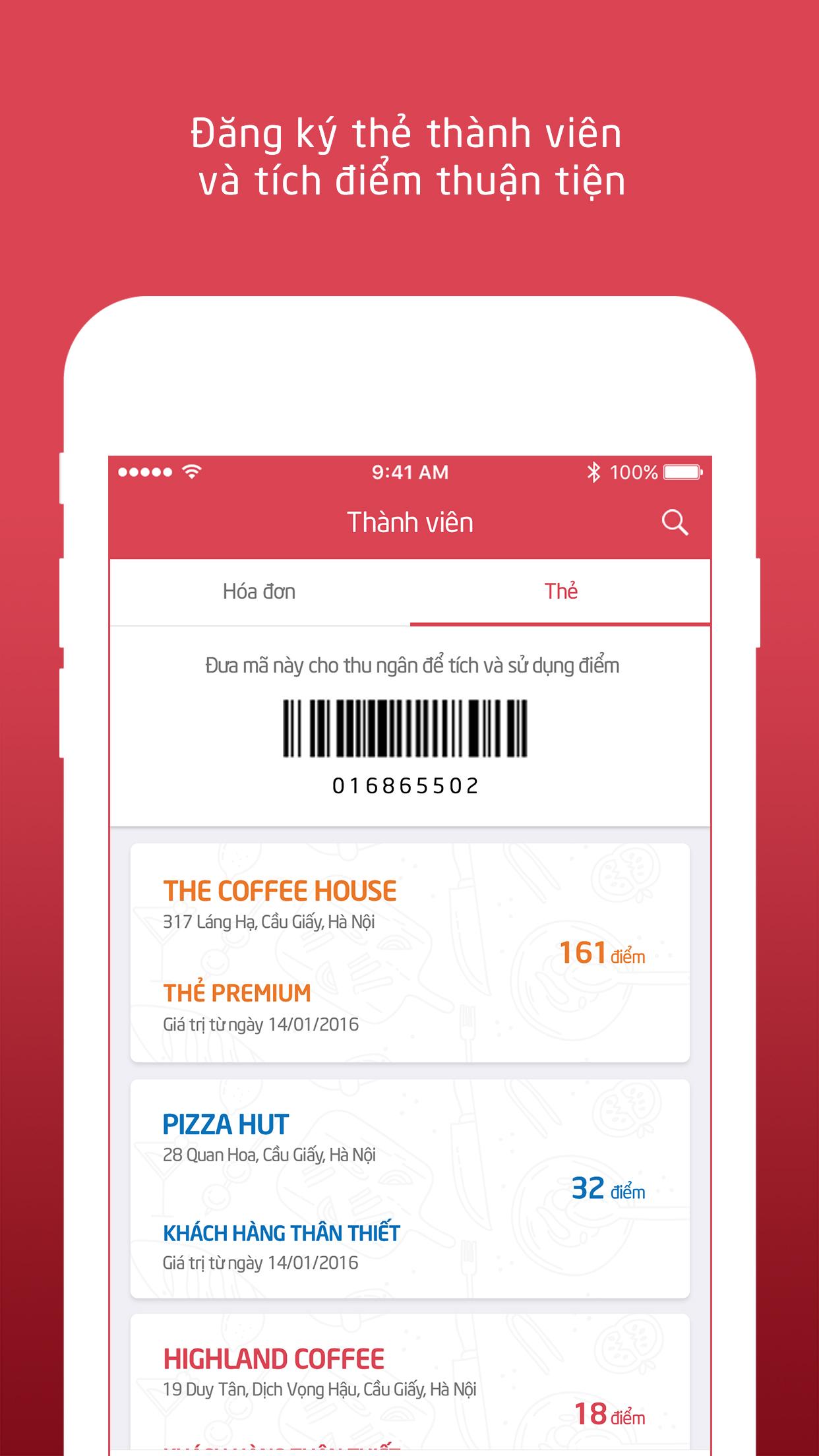 - Lưu trữ toàn bộ thẻ thành viên nhà hàng trong 1 ứng dụng, không còn mối lo khi phải mang quá nhiều loại thẻ trong ví.