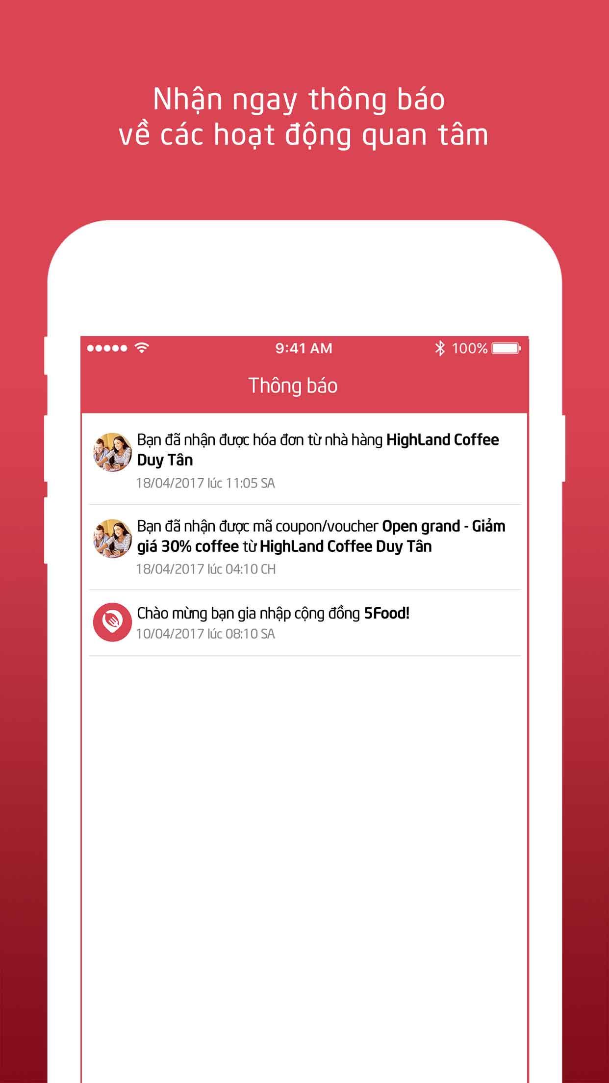 - Hóa đơn dùng bữa tại các nhà hàng trong hệ thống 5Food sẽ được gửi tới điện thoại bạn ngay khi hoàn tất khâu thanh toán.