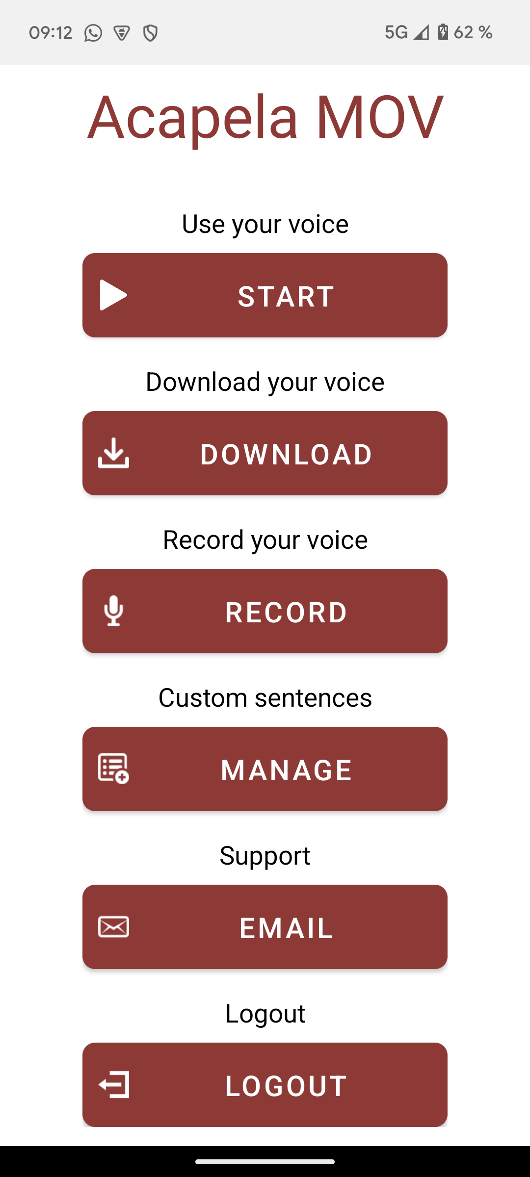AcapelaMOV is an application available with the My-Own-Voice service that allows you to record and test your personalised digital voice just created on a specific offline device. Specifically for users at risk to lose the ability to speak, , enabling them to keep this essential part of their identity. Record your voice. Once your digital voice created you'll receive a confirmation notification will be sent by e-mail. You can then download and test the voice within the application. You will need to use your my-own-voice credentials for this. Once the digital voice is installed, it will be accessible, free of charge, for 3 months. After the test period, you can re activate/re download your digital voice if you purchased/subscribed to the service or if the service was subsidised and ordered by an organisation.
