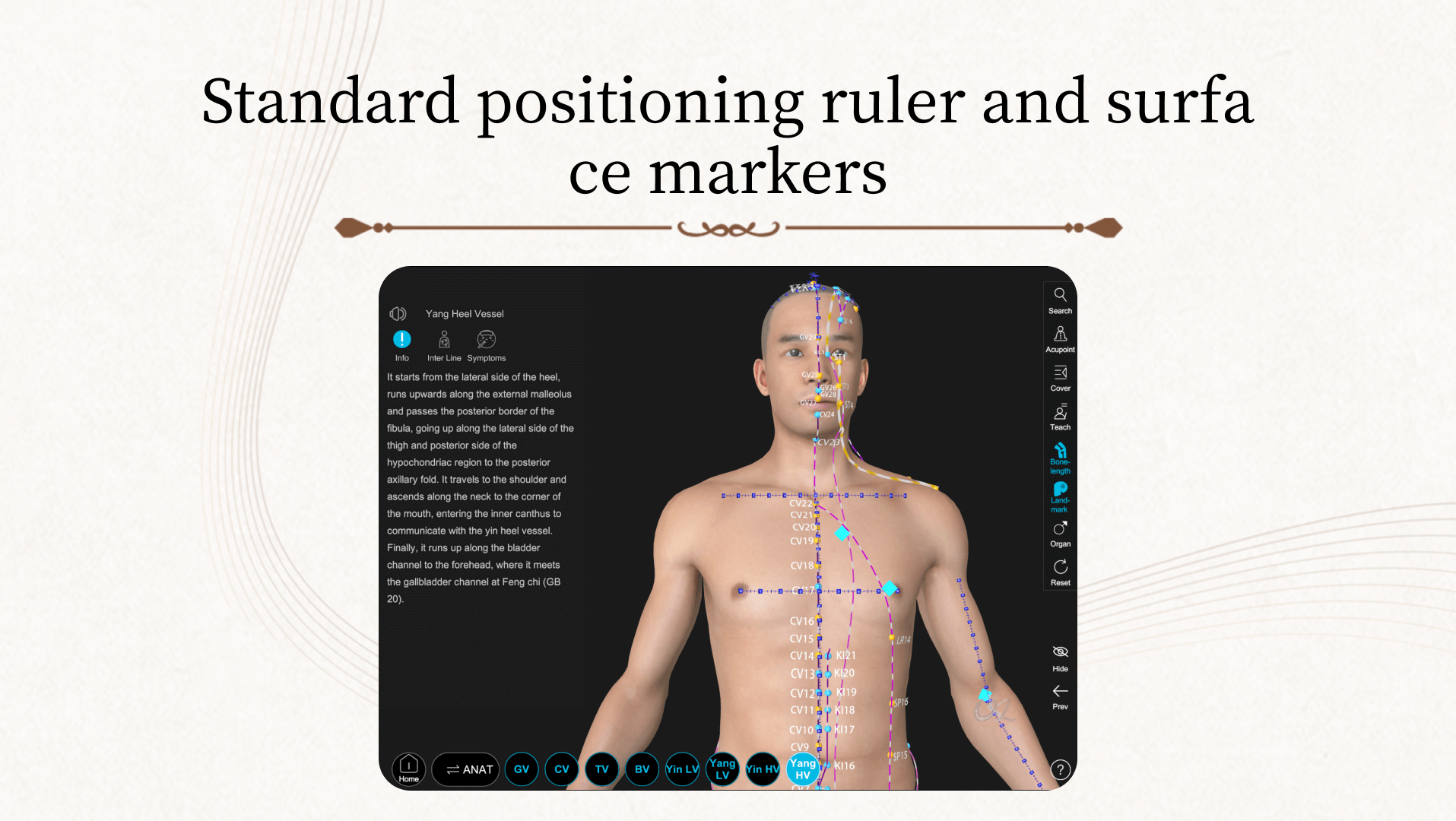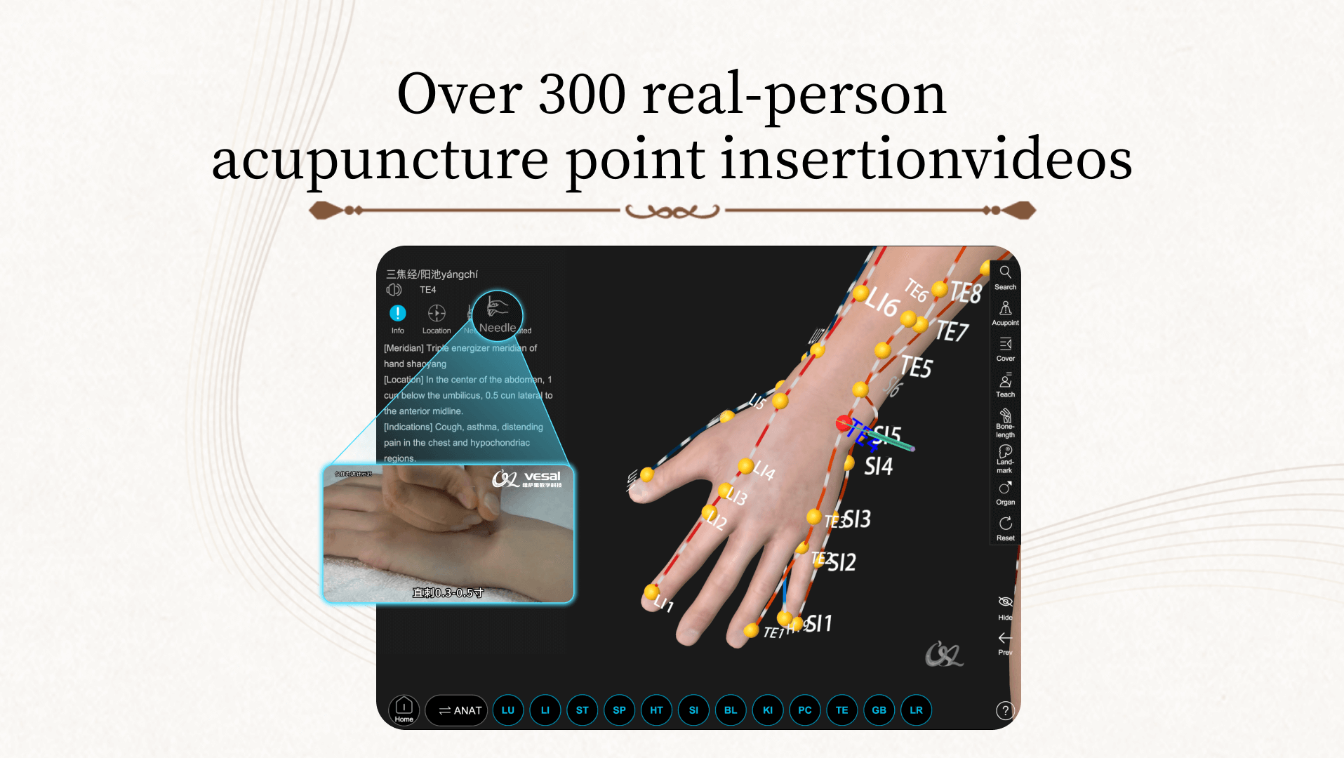 This platform helps you view the meridians and acupoints of the entire human body anytime, anywhere, systematically and comprehensively learn knowledge of meridians and acupoints, observe the angle and depth of needle insertion clearly and stereoscopically, and also provides the anatomy structures around acupoints to help you understand the anatomical levels of needling and the relationship between needles and surrounding structures, effectively avoiding accidentally puncturing some dangerous human structures during acupuncture.