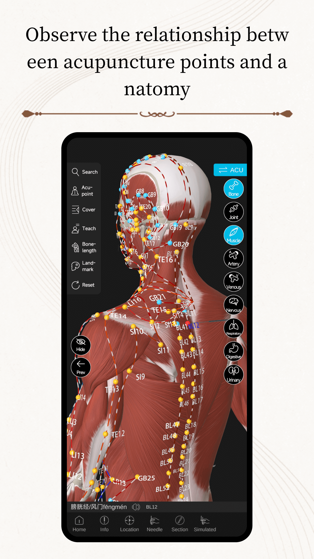 ● Fine acupoint anatomy: with one click, switch to the human body acupoint anatomy mode, the anatomical structures beside each acupoint and the anatomical layers where the needle tip pierces are clear and easy to understand, effectively avoiding the problem of accidentally piercing into dangerous organs during acupuncture.