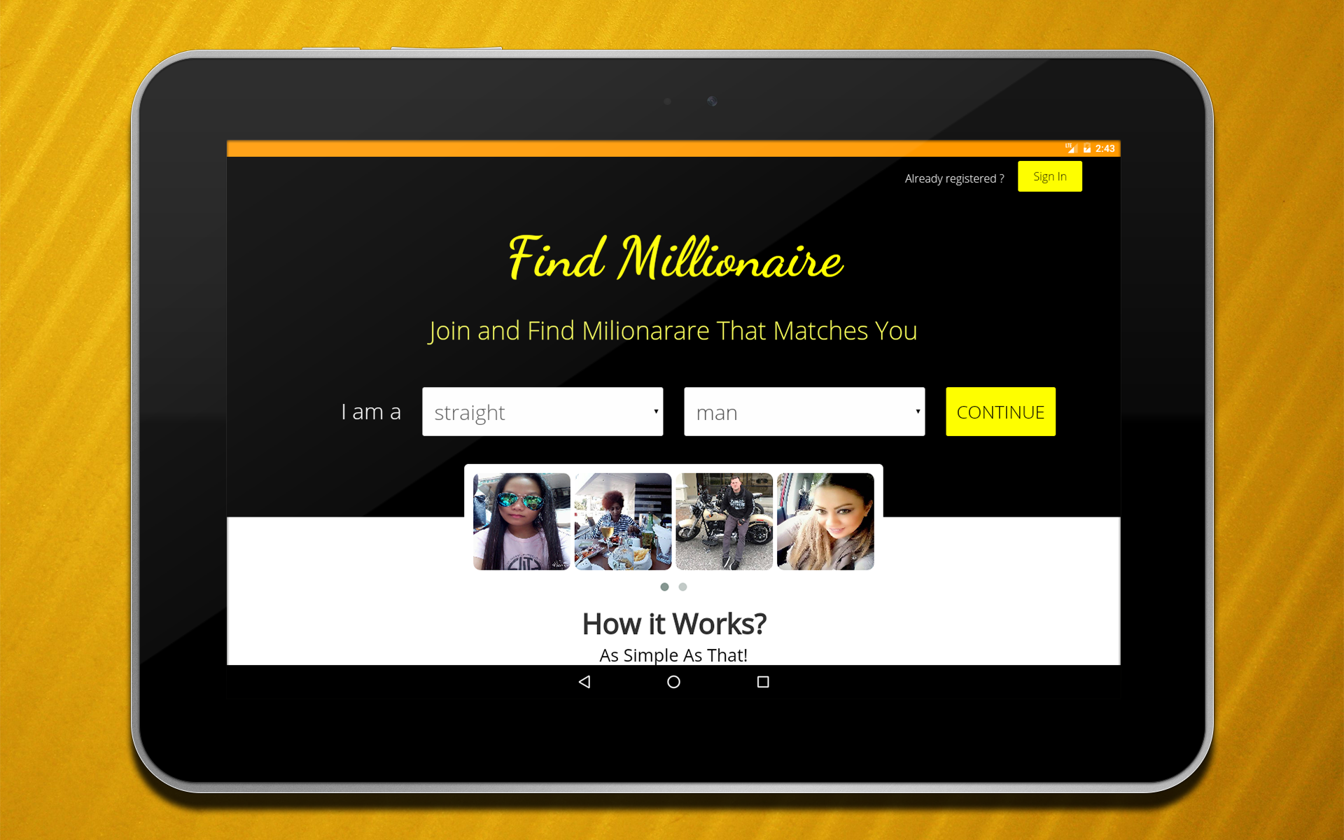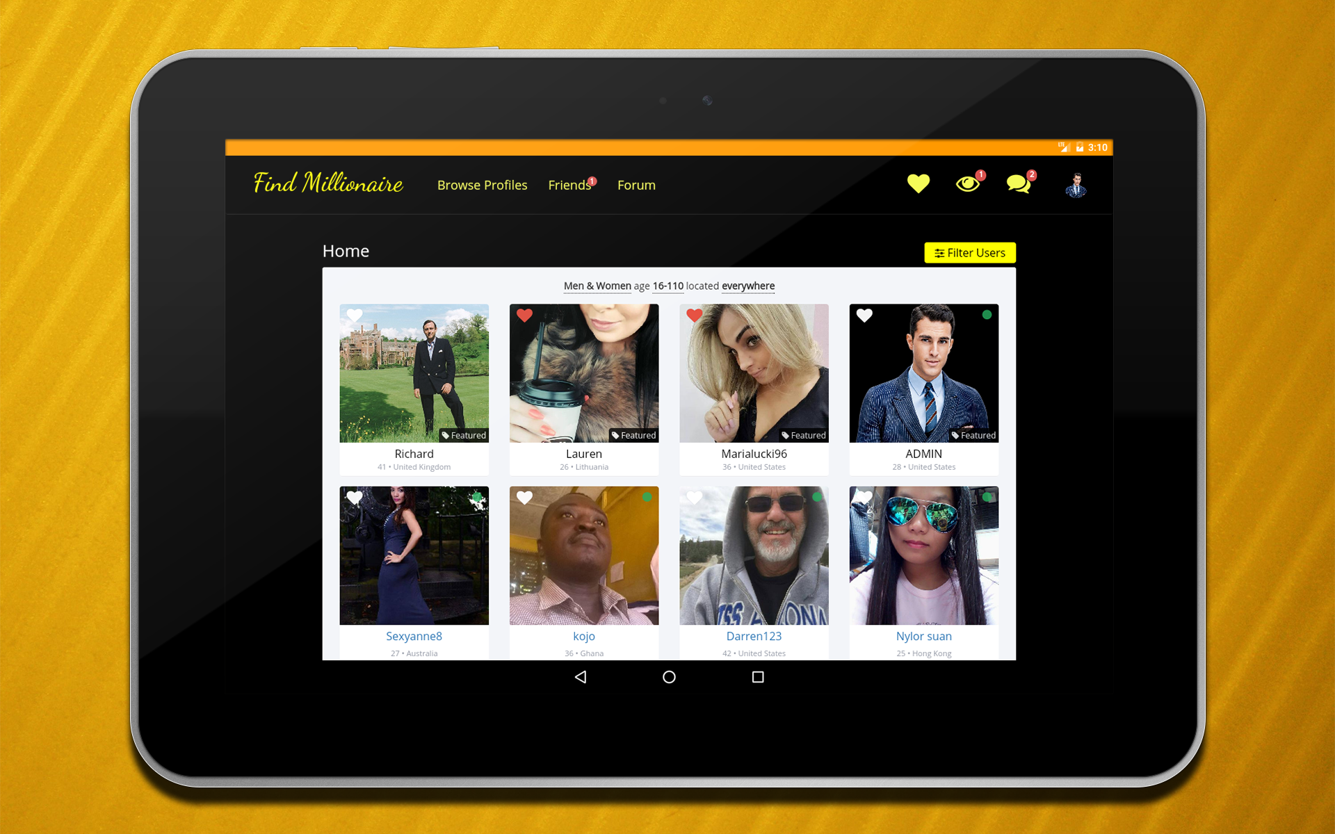 Yes you read right, our app Online Dating - FindMillionaire don’t have in app purchases! Everything in our app is 👍FREE👍! No hidden costs. We hope you will enjoy using our app!❤️ Online Dating - FindMillionaire is a place for wealthy and attractive singles to meet, chat, and date. Our members have included CEOs, Athletes, Doctors, Lawyers, Investors, Entrepreneurs, Beauty Queens, Fitness Models and Hollywood Celebrities... Everyday 1000+ new registrations. In our app you will not see hidden costs — free chat! Our goal is to give people a free adult dating service and help you really connect with real people and real millionaires. Online Dating - FindMillionaire is an elite matchmaking app for successful and attractive singles. You can meet, chat with millionaires and date quality singles on our app using the following features: ✔️ No Vip`s! No hidden costs! ✔️ Discover real successful - attractive millionaires near you ✔️ Connect with certified millionaires ✔️ Free Chat with wealthy singles online ✔️ Improve your matches by answering questions about yourself. ✔️ Nice Friends System ✔️ Facebook login|sign up|connect|disconnect ✔️ Profile loves ✔️ Profile guests function ✔️ Instant support ❤️ And much more! Online Dating - FindMillionaire helps you find millionaire matches based on what you really care about… and it’s 100% FREE. That’s why Online Dating - FindMillionaire is a popular Millionaire app offering a slick, sleek and sophisticated experience for people who want real conversations, real dating, and meaningful connections. Meet real millionaires you actually like with Online Dating - FindMillionaire. And best of all — It’s free! Community & Safety Rules The dating app is free to download and don’t have in app purchases. This app is 18+ (not for teens). Our target audience is adult people; same-sex people are welcome too. No nudes allowed to be sent to strangers. Inappropriate sexually explicit content can be banned. Using porn pictures as profile photos is prohibited. We do not allow content that promotes or requests sexual acts in exchange for money, gifts, or any compensation (transactional intimacy). Hope you’ll enjoy using our dating app.