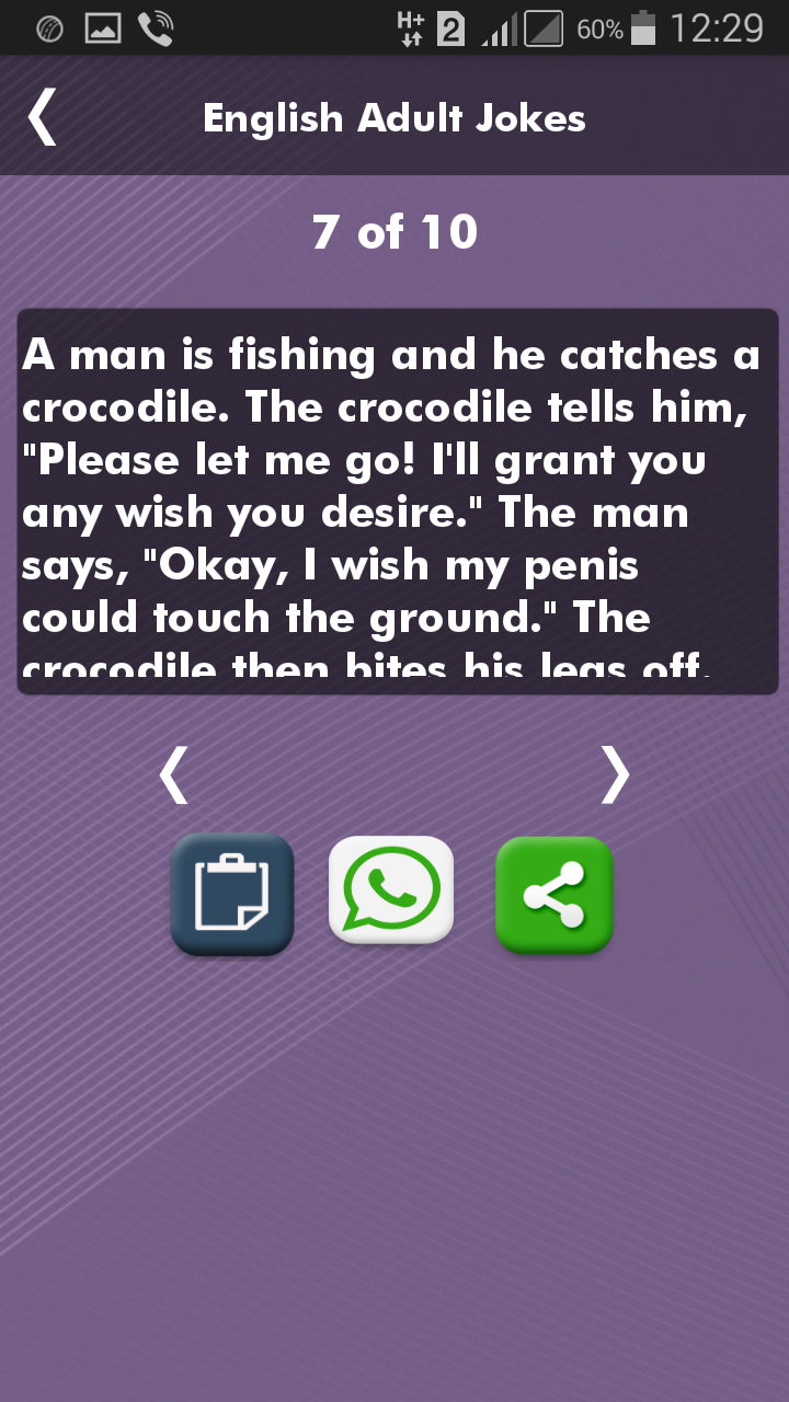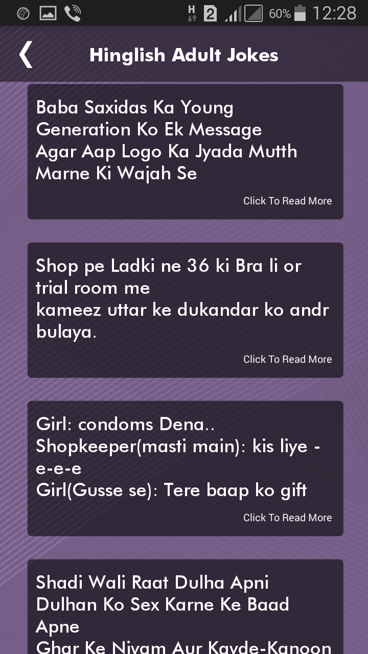 Adult Hindi Non-Veg Jokes is best app for adult and non veg jokes.Here you will find all types of best and latest Adult/non veg jokes.Below are features of this app:- * Big database of adult jokes. * Best and smooth design so you can read without any problem. * you can share non veg jokes with your friends via whatsapp or facebook. * One click share to whatsapp, facebook and many other sharing platforms. * download now and enjoy reading and sharing adult and non veg jokes.