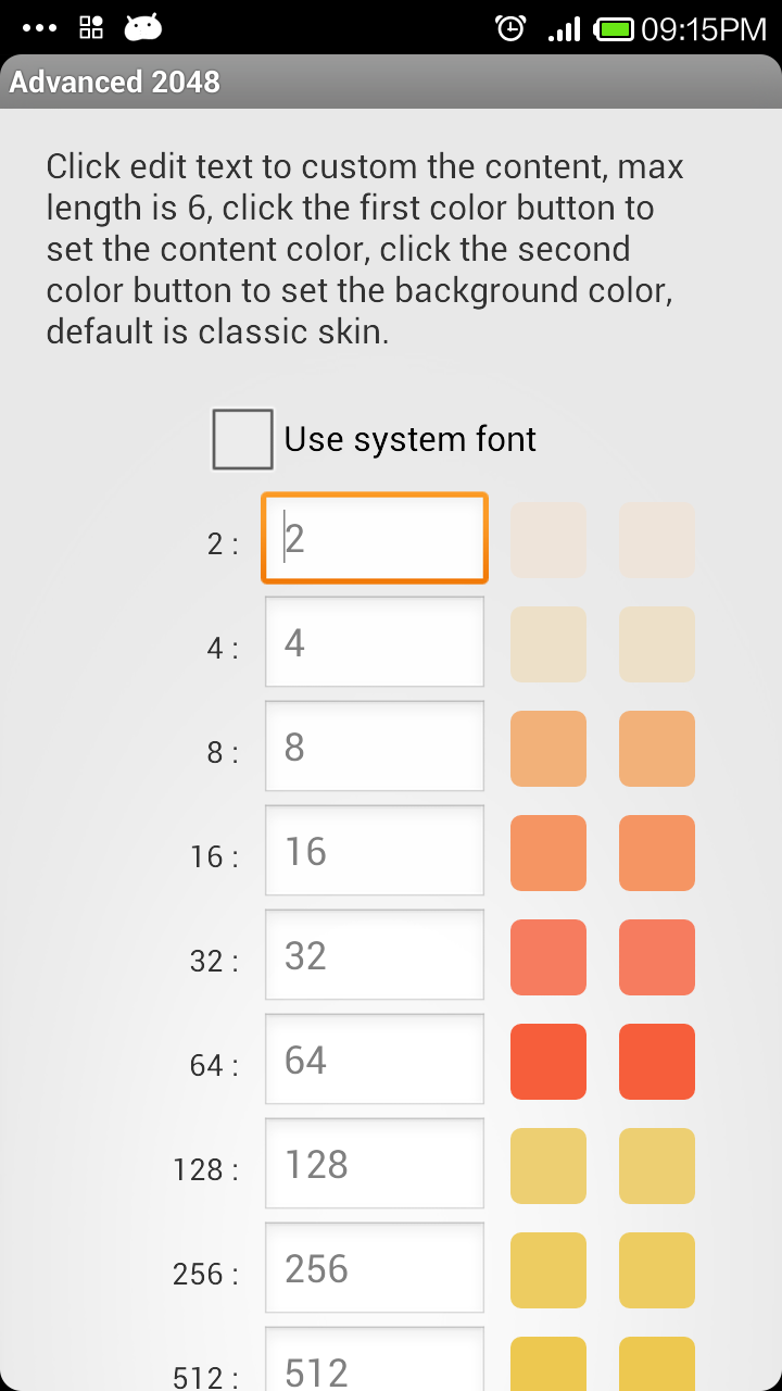 Advanced 2048 is a popular Numbers game. Advanced 2048 add 3x3, 5x5, 6x6, 7x7, 8x8 mode except for 4x4. default is 6x6 mode. with the senior 6x6 mode, you can get to 2048 easily, but the challenge is how high number will you get to? Add custom skin to modify the tiles content, it is so cool. Add "auto move" mode, if you don't want to with your finger to swipe the screen, you can click "auto move" in settings, the game will auto run, you can stop it after click "stop" in settings. and it will stop if your screen locked for power saving. Advanced 2048 will auto save your game progress after it exit. You can change play mode when you playing, it will keep your current score and progress. Click Restart button to restart a new game. Click Undo button to back one step. Click Grid button to select different size grid. Menu button: Auto Move, Share, Leaderboard, Settings Settings contains: - Swipe tile mode: Continuous sliding moving only once or moving more several times - Sound: on/off - Gravity mode - Auto move mode: Corner, Swing, Swirl, Random - Auto move speed: Slow, Medium, Fast, Very Fast - Skin: Classic, Chemical elements, Chinese dynasties,Custom - Custom skin: custom the tiles content and front and background color. - Rate APP - Feedback Feature: - six mode: 3x3, 4x4, 5x5, 6x6(default), 7x7, 8x8. - Auto move - Auto save - Undo - Different skin - Custom skin - Gravity mode HOW TO PLAY: Use your finger move the tiles. When two tiles with the same number touch, they merge into one! If you have any problem, please feel free to feedback to us.