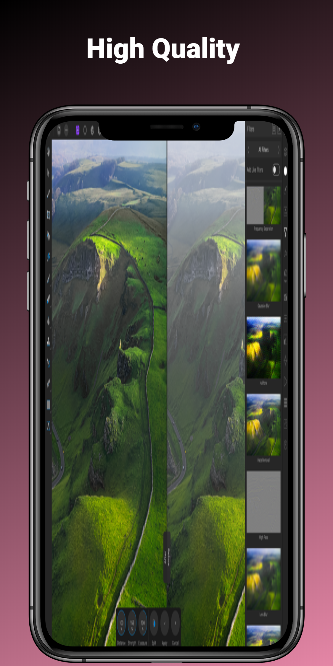 - Swipeable split or mirrored screen always available for before and after views