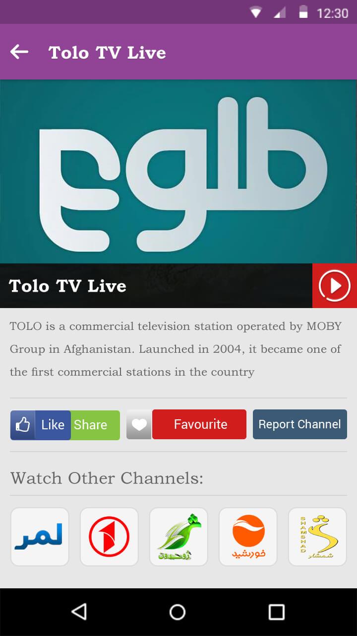 Watch Afghan Live Tv Channel in HD Format All Over The World Totally Free. Tolo TV, Lemar TV, 1 TV, Ariana TV, Shamshad TV, Khurshid TV, Maiwand TV, Mitra TV, Zhwandoon TV, Arezo TV, Ariana News, Jahan TV, Javan TV, Afghan Time TV, AMC TV, Bahar TV, Hazara World TV, Kabul TV, Negah TV, Naween TV, Noor TV, Payame- Afghan, Tamadon TV, Zarin TV and Much More... ~ Added Some More Channels & Fixed Some Bugs