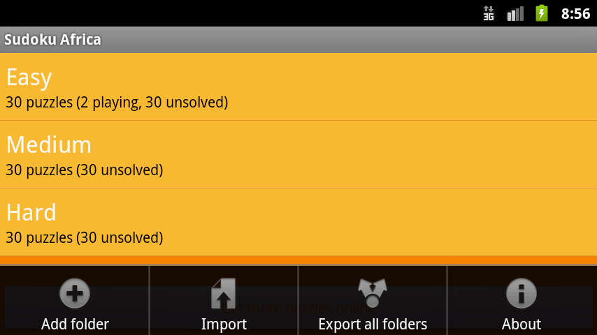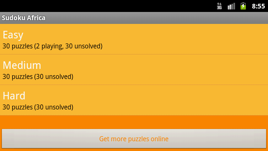 Sudoku Africa has been polished to perfection and boasts an intuitive, touchscreen game board that’s easy to navigate and fun to play! Now challenge yourself to more than 1000 puzzles and 3 levels of difficulty from Easy to Hard! Furthermore, you can always add your own levels of difficulty too, if 3 levels are not enough. Game Features: 1. Totally FREE and No Ads. 2. Download more puzzles online for free 3. 3 levels of difficulty 4. Create your own Puzzles and play them or give to a friend to play 5. Undo/Redo/Auto-save and Resume 6. Puzzle timer 7. Cell highlighting 8. Smart Notes (pencil marks) If you would like to see this game translated in your language, please email us. Game Rules: Sudoku Africa is a logic-based number-placement puzzle. The objective is to fill a 9×9 grid with digits so that each column, each row, and each of the nine 3×3 sub-grids contains all of the digits from 1 to 9.