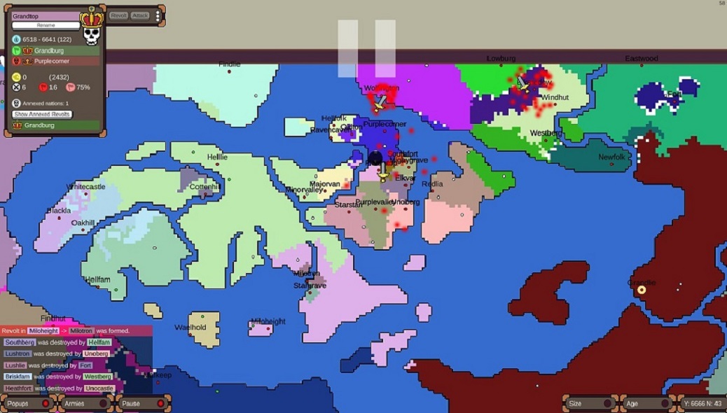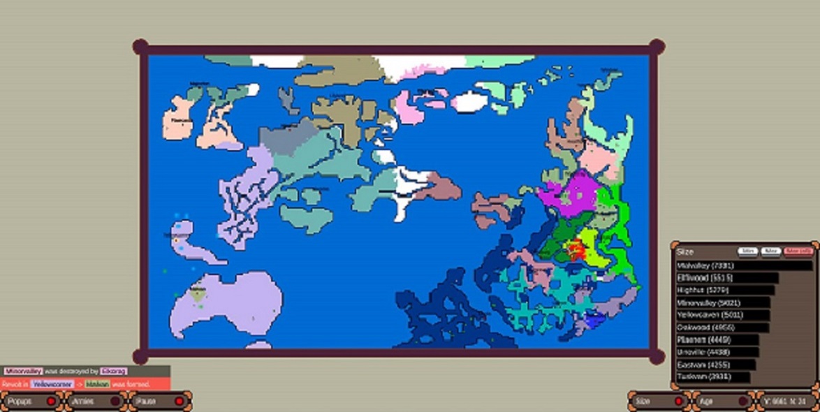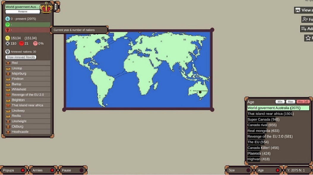 Age of Conflict is an in-development World Map Simulation Game AI-only: In this game you observe randomized nations interact with each other and ultimately try to control the world in a massive free-for-all ! Maps: The game currently has 6 different maps provide interesting layouts for your game, in addition to a Custom Map Painter Session management: You have some control over the initial setup of the world by spawning a select number of nations before randomization. Nation management: You can edit the names of nations you have a particular interest of, even after they have been destroyed. You also have access to God Mode powers World Building: This game can also work as a tool for world building, thanks to its ability to keep track of nations long since passed. The game has some statistics which can help in finding ancient nations and comparing them to each other. DISCLAIMER / Legal Notice about Age of Conflict: It's a mobile adaptation for Age of Conflict created by fans for fans and not an official game from the creators of Age of Conflict If you notice that there is any copyright, contact us, and we will resolve any issue. All rights belong to the developers of Age of Conflict : World War Simulator .