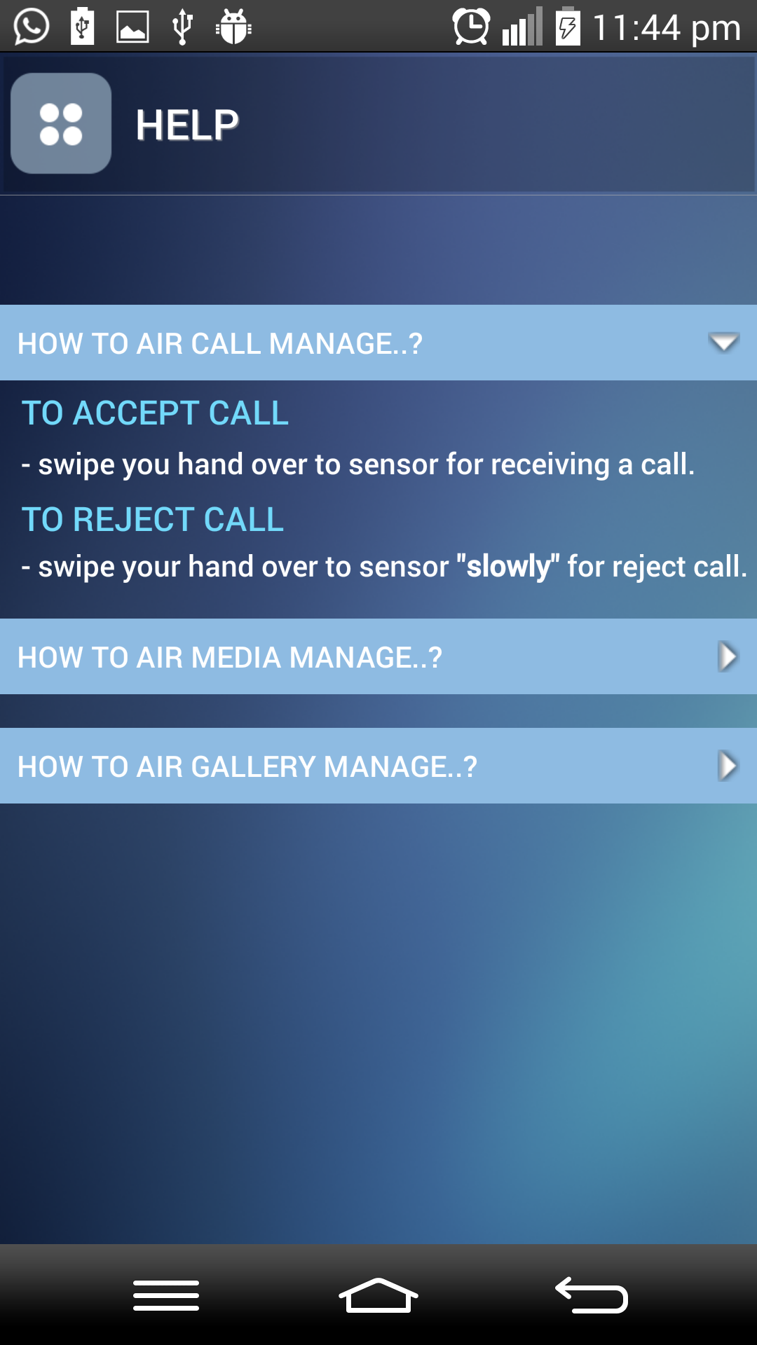 Sometimes you tiered and listening a song, that time if you need to pause the music or next previous music track, at that time Air Media management is useful for it. You simply using this application as air call answer/Air call accept, Air media manager, Air Gallery manager and proximity sensor manager.