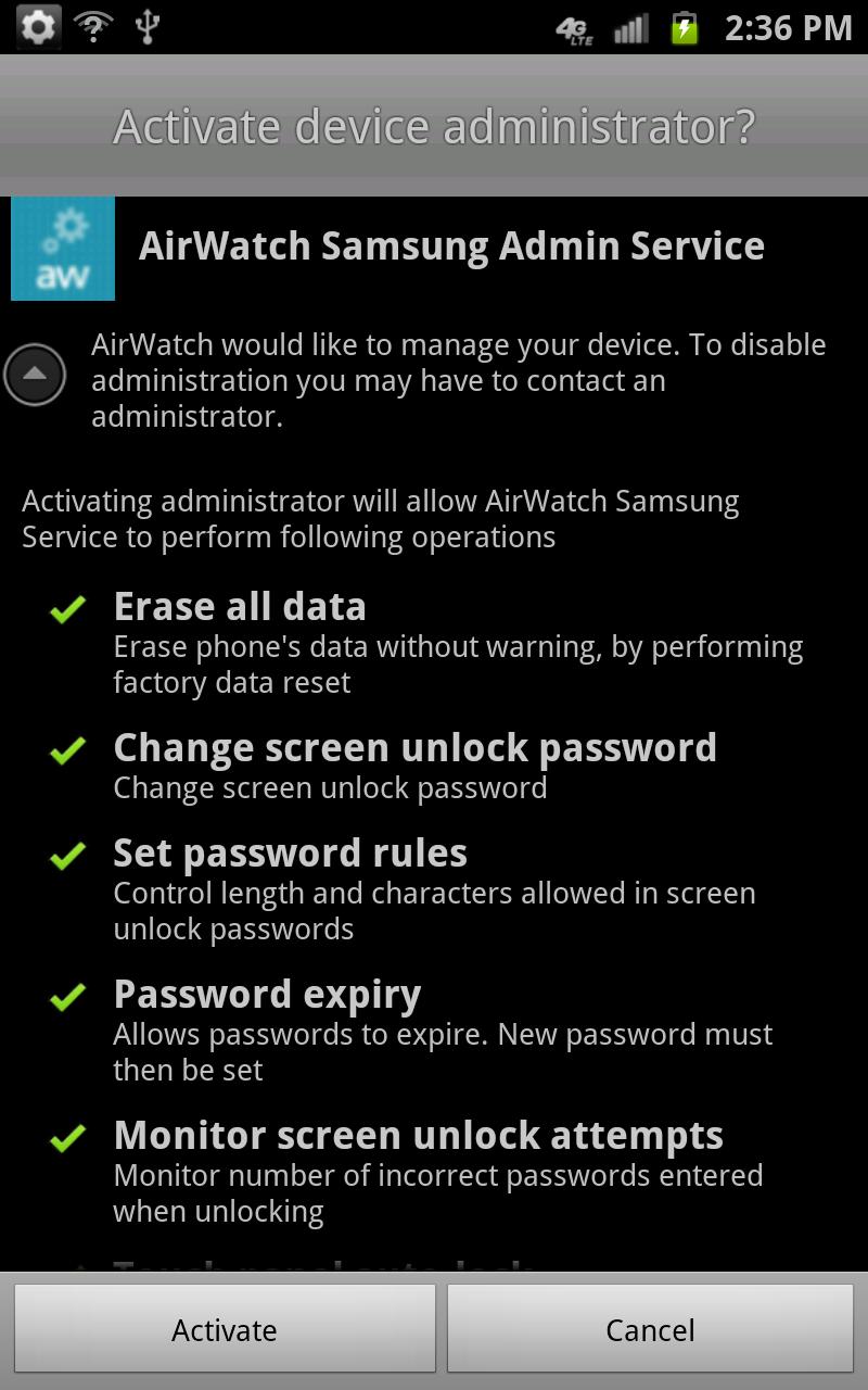 AirWatch introduces a service application for Samsung enterprise ready devices. This application is a “plug-in” application that should only be installed and used in combination with enrollment of the AirWatch MDM Agent. It allows for additional MDM capabilities described below that only pertain to Samsung devices. Depending on the AirWatch MDM console version you are using, please follow these steps to deploy to your Samsung device: If using a 6.1 console or older: 1. You must first download, install, open and activate the Samsung Service 2. Then, download install the AirWatch MDM Agent available in the Google Play 3. You may now enroll like normal and the Samsung features will be activated If using a 6.1 SP1 console or greater: 1. You must download, install the AirWatch MDM Agent available in the Google Play 2. You may now enroll like normal and the Samsung Service will be pushed to your device during enrollment Samsung devices are enterprise ready with enhanced security and management capabilities. Remotely manage settings, policies, applications and functionality on Samsung devices. MDM Features include: 1. Device Restrictions 2. Native Mail Client Configuration 3. Wi-Fi Network Setup 4. VPN Network Setup 5. Certificate Management 6. Application Management a. Blacklisting Apps b. Required Apps