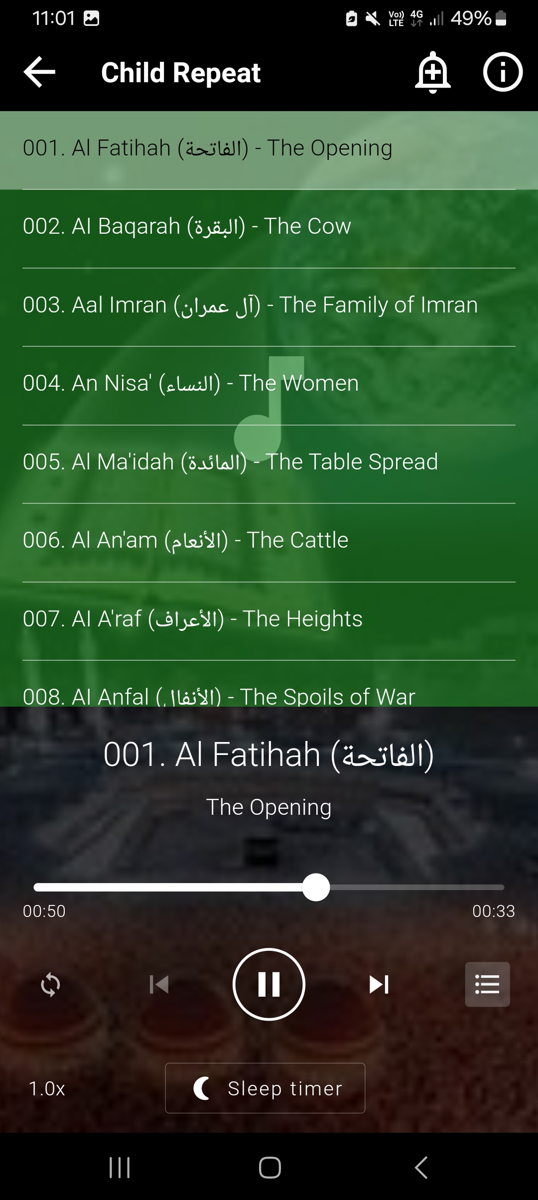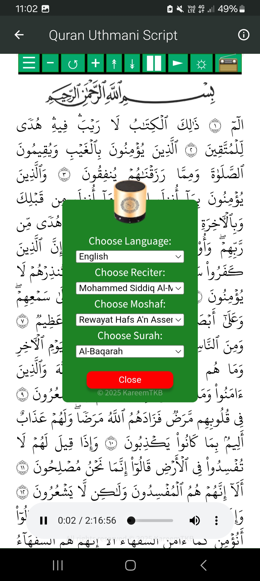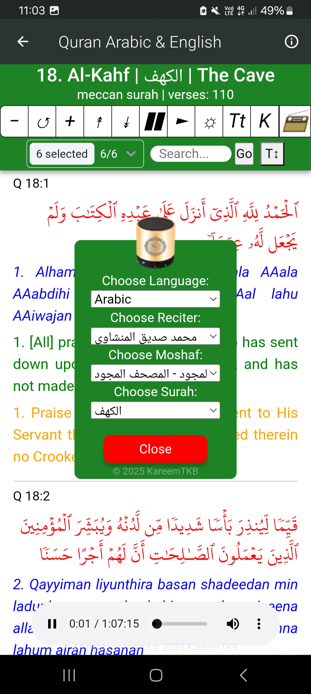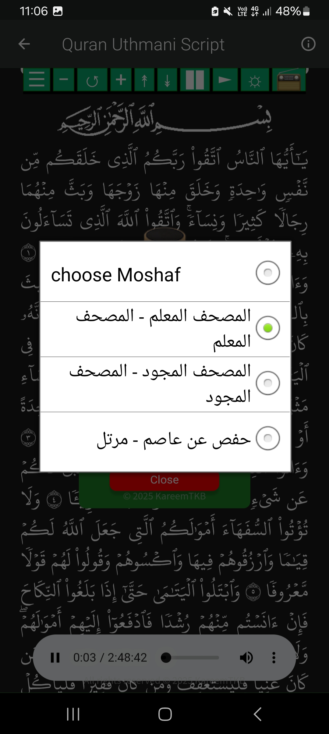 Download this app to listen to Sheikh muhammad al siddiq minshawi complete audio quran with repeat READ AND LISTEN ON THE SAME PAGE. مصحف معلم كامل للشيخ المنشاوي بدون انترنت Qur’an Learning Audio – with Repeat (Sheikh Mohamed Siddiq Al Menshawi) Muhammad Siddiq Minshawi : This collection consists of Sheikh Muhammad Siddiq Al-Minshawi and a student reciting with the rules of tajweed, who is an Egyptian Qur'anic reciter, the son of the great Sheikh Siddiq Minshawi. Sheikh Muhammad Siddiq El-Minshawy was also a protégé of the venerable Sheikh Mohamed Salamah, a great reciter of the 20th century. He studied the rules of recitation under the respected Sheikh Ibrahim As-Su'oodi at an early age. Minshawy is especially admired for the immense spirituality of his recitation. He had a smooth style, which could move the listener to tears. He has become a household name across the Muslim world. He traveled to many countries outside of his homeland Please take time and reflect by listening to the wonderful recitations. THIS APPLICATION WORKS BOTH OFFLINE AND ONLINE. In this application, you will find quran al Menshawi with repeat mp3 Qur'an. Application features: - surahs from alfatihah to alkahf audio quran by sheikh muhammad siddiq alMenshawi with repeat quran. - You will find the following surahs: Al Fatihah, Al Baqarah, Aal Imran, An Nisa', Al Ma'idah, Al An'am, Al 'Araf, Al Anfal, At Taubah, yunus, Hud, Yusuf, Ar Ra'd, Ibrahim, Hijr, Nahl, Isra' and surah Al Kahf. - This is first part (PART 1 of 2). To get the other half please search for it in my catalog. - You will also find the Full Qur’an – Minshawi – Quran Repeat [Mp3] in this app but it requires internet connection to work. - Al Menshawi offline Quran with repeat. Sheikh Mohamed Siddiq El-Minshawi (Arabic: الشيخ محمد الصديق المنشاوي) (January 20, 1920 – June 20, 1969) born in Upper Egypt was an Egyptian Qur'anic reciter. Son of Siddiq El-Minshawi, his brother Mahmoud El-Minshawi is also a famous reciter. Having been significantly influenced by his father, Muhammad Siddiq El-Minshawi was also a protégé of Mohamed Salamah, a famous reciter of the 20th century. He studied the rules of recitation under Ibrahim As-Su'oodi at a young age. Muhammad Siddiq El-Minshawi has become a household name across the Muslim world. He traveled to many countries outside of his homeland, including Indonesia, Jordan, Kuwait, Libya, Palestine (Al-Aqsa Mosque), Saudi Arabia, and Syria. He helped children with the recitation of Quran. Minshawi's recitations continue to be amongst the well known due to his impeccable Tajweed and style. He was author of many books on various aspects of the Quran. He was also involved in the calligraphic printing of the Quranic text and “World of Islam festival”. His status as reciter was somewhat official: he held the title Shaykh al-Maqâri, and his opinions were frequently solicited and quoted by the media. One can count a generation of younger reciters among his imitators. (Reference: Wikipedia).