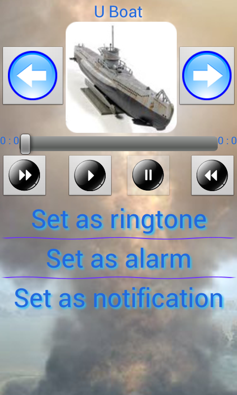 Let your favorite mobile phone sounds as your favorite alarm. If you are a exotic sound lover, this is the best ringtone collection for you! Do not let anybody be faster than you; be the first among your friends to have this lovely, amazing collection containing about 30 ringtones. If you are an admirer of alarms such as police, fire truck,submarine, tornado, air horn, train, bike or ambulance, download this incredible app for your super Samsung Galaxy S, Sony Xperia S, HTC, Huawei, Motorola, LG, Alcatel, Spice, and enjoy these sounds on your android mobile phone every day and set it either as ringtone, sms, contact or alarm. On the first screen of this application, you can choose: Ringtones - here is the list of all ringtones and every name is the link to appropriate sound, which you may play, pause, rewind, forward and set either as ringtone, alarm or notification. By using the left or right arrows, you may jump to previous or next sound. About - text about this application. Privacy Policy More Apps - from where you can search for other applications directly. In order to be free, this app may contains ads.