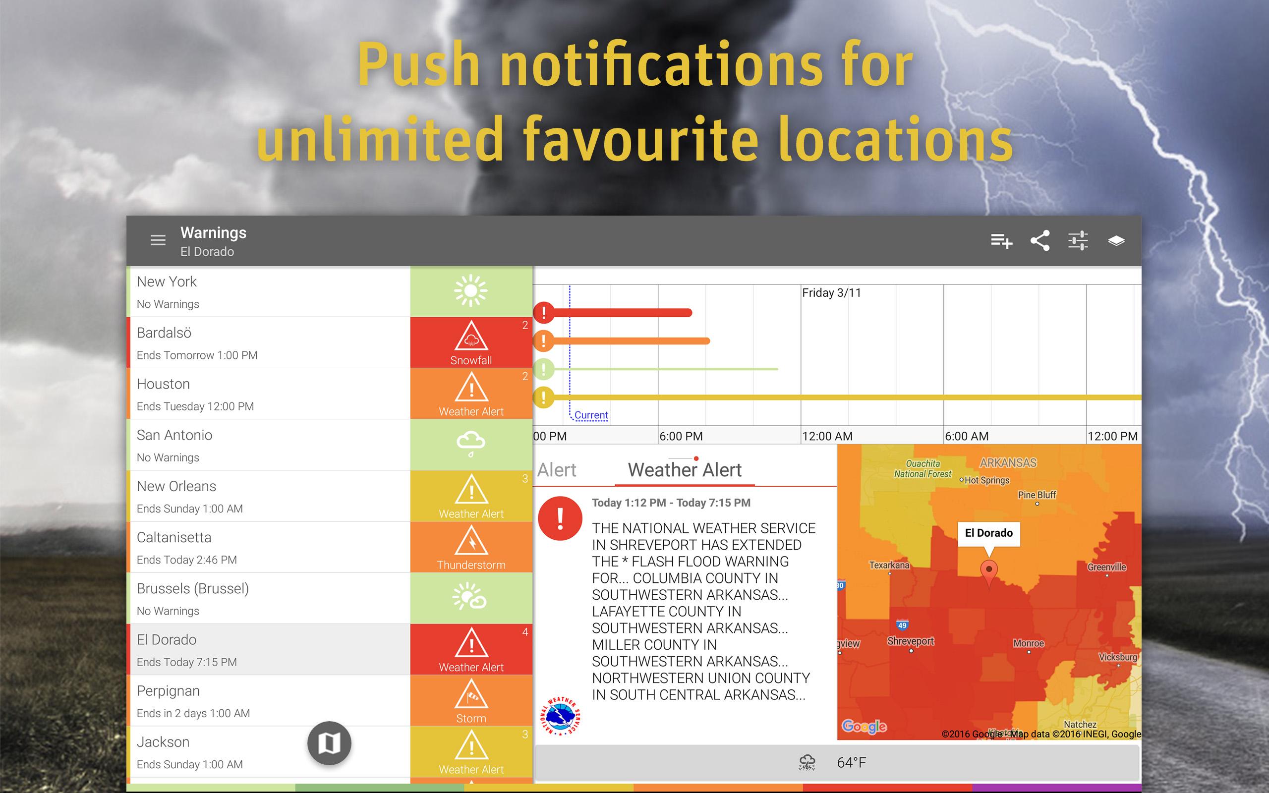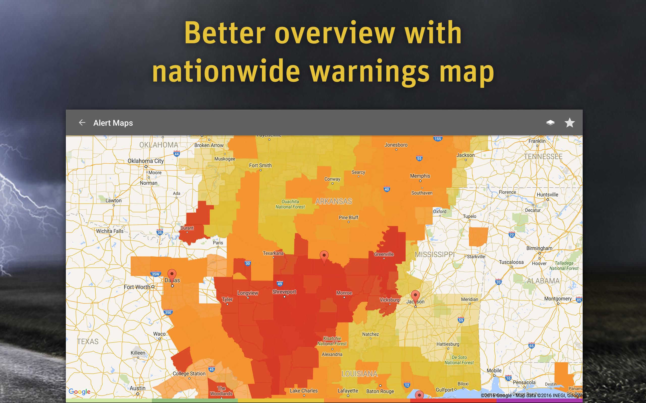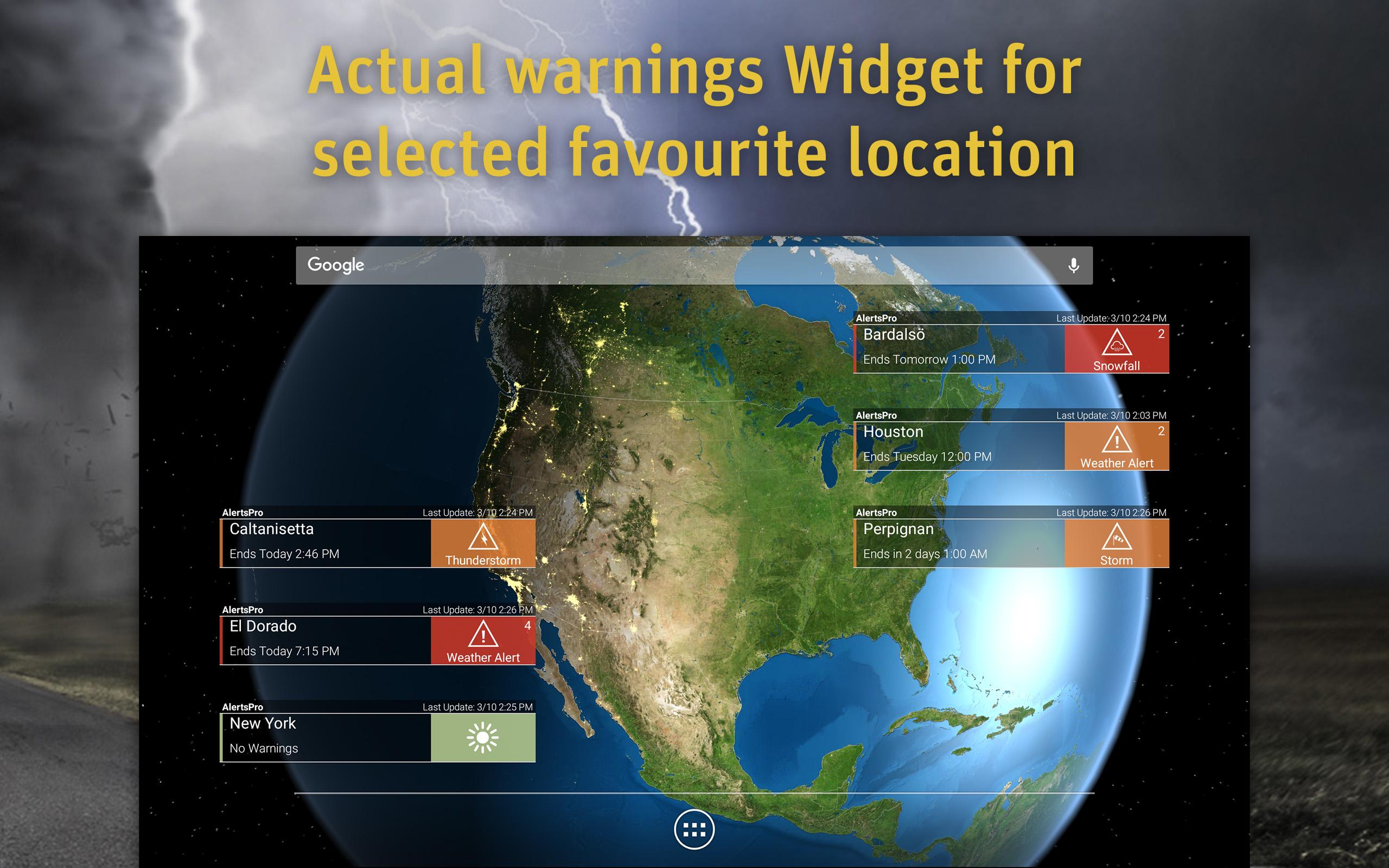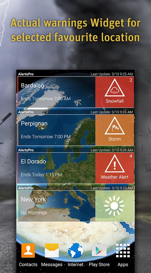 Be warned and be prepared! AlertsPro is the innovative app from MeteoGroup which forewarns of severe weather conditions such as storms, heavy rain, thunderstorms, hail, heavy snow, freezing rain and extreme temperatures. Also behind the best selling WeatherPro app, MeteoGroup is one of the few private weather companies to operate its own Severe Weather Centres – including the very popular www.severe-weather-centre.co.uk. AlertsPro now brings this online warning service direct to your portable device with coverage of most of Europe (Austria, Belgium, Denmark, Germany, Finland, France, Ireland, Italy, Liechtenstein, Luxembourg, the Netherlands, Norway, Portugal, Sweden, Switzerland, Spain and the United Kingdom) and the USA (National Weather Service). • Get push notifications whenever there are alerts • Accurate, dependable warnings • Warnings clearly displayed on a nationwide map • Widget which displays the latest warnings for the chosen favourite • Unlimited favourite locations and ‘Locate me’ function • Social media share feature • High-definition radar and satellite view The Premium option allows you to choose which alert level you would like to be notified of, for each severe weather condition. You can activate the lightning layer, and animate the radar and satellite maps. When you long press on any coloured area on the warning map, further details of the severe weather for that location will be displayed. The Premium version also gives users a better viewing experience by removing all ads! One subscription covers Premium services on all weather apps by MeteoGroup: WeatherPro, MeteoEarth and AlertsPro. For more details please visit www.alertspro.com or our help center https://meteogroup.zendesk.com.