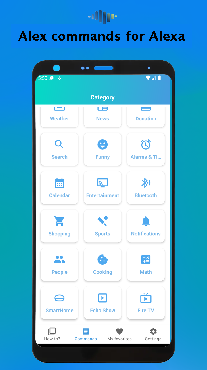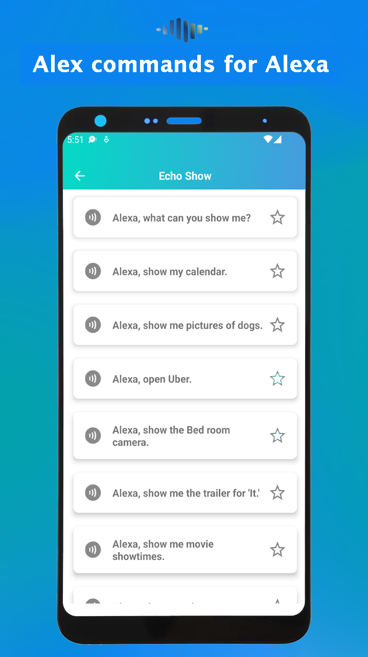 Alex for Amazon Alexa commands app is a powerful Android application that features Alexa’s virtual assistant voice for your Echo. Use your personal assistant while you entertainment, travel, sports, work, study, playing, shopping or relax. Setup Alexa for Alarms, timers, media playing, call and messages, calendar, weather, traffic, travel and news informations. It is the number one app to find the top voice commands for Alexa echo dot, Sports, search, phone settings, podcasts, music, kitchen and cooking, Alexa for kids and family, photos and videos, maps, localization and more. Alex Voice commands for Amazon Alexa virtual assistant will search for you what you wish to know or listen, in few moments. You can also use Alexa commands to control your alarms, timers, echo dot fire tv, smart home and echo show with amazon Alexa app. Features of Alex for amazon Alexa commands app: - Bookmark you favorite commands - Learns over 975 commands (organized by categories) in text and voice for your device. - Setting up alexa, echo dot, Plus, smart home and Echo Show. Search for voice commands Disclaimer: This “Alex for Amazon Alexa commands app” app is not affiliated with Amazon Inc and other trademarks mentioned here such as: “Amazon”, “Alexa”, “Echo dot” and “Amazon Alexa”.