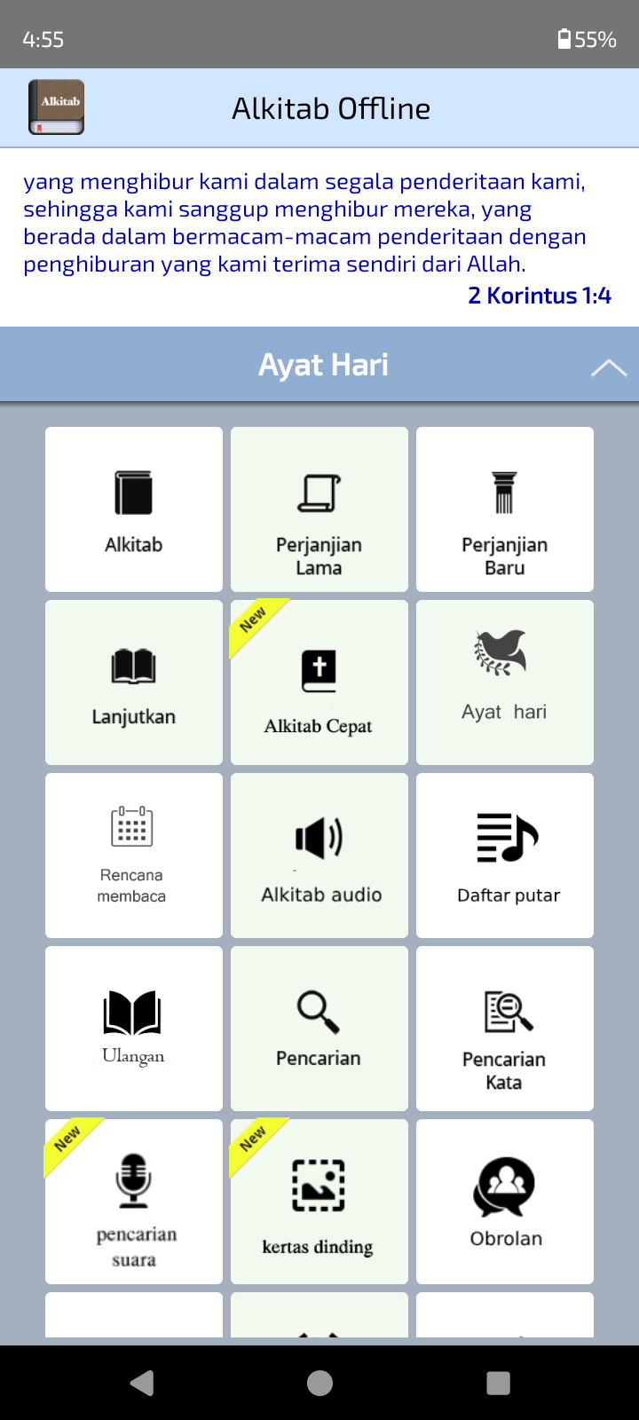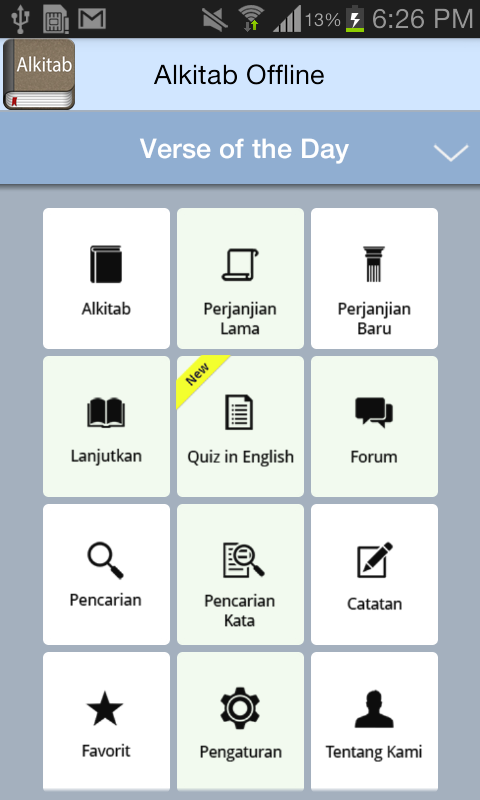 We are extremely proud and happy to release Alkitab - for Android phones completely offline loaded with user friendly features. The app contains both "Old Testament" and "New Testament" in Indoensian language. We sincerely hope that this app will rejoice you and will be more useful in reading the Bible.