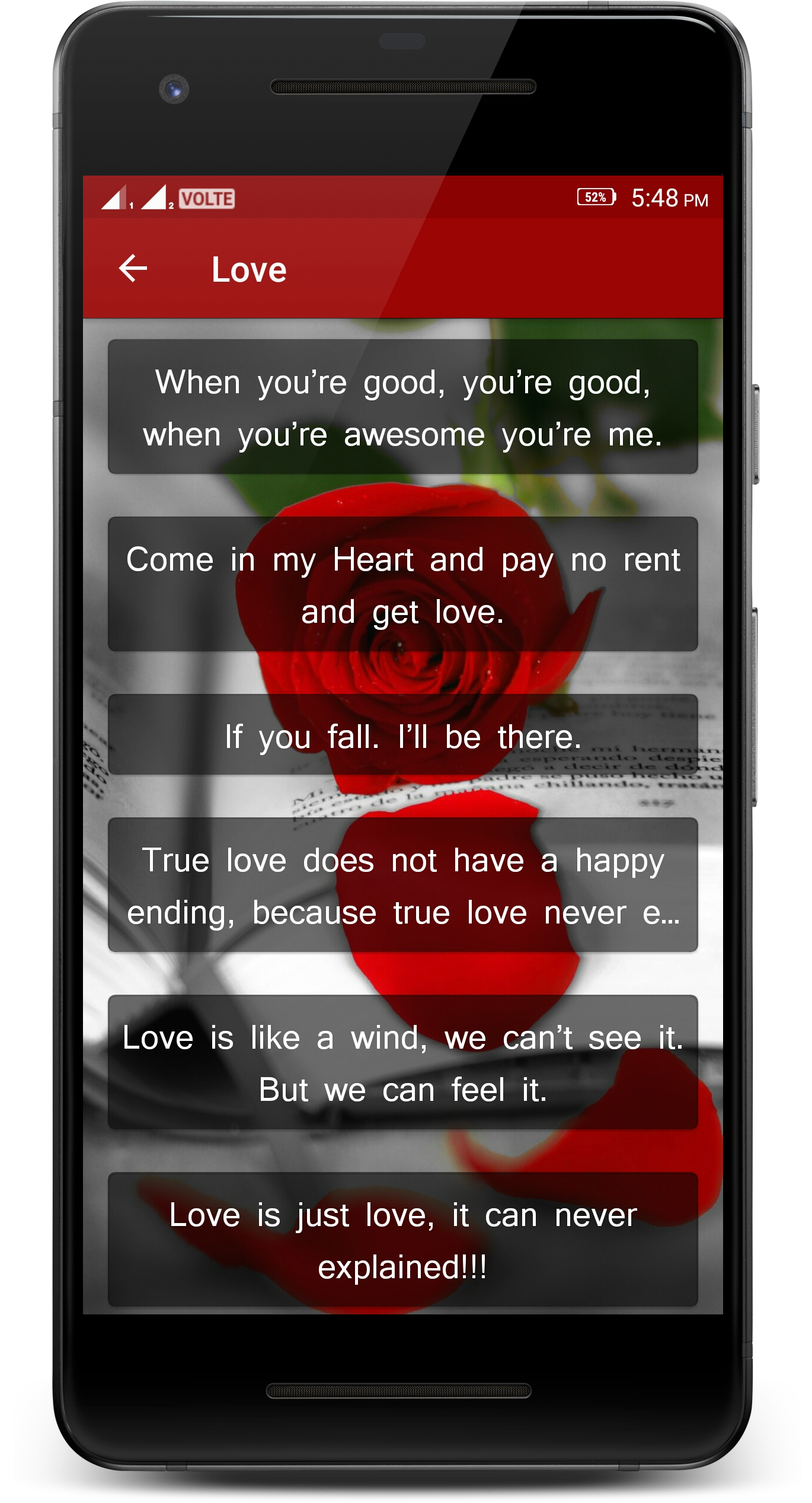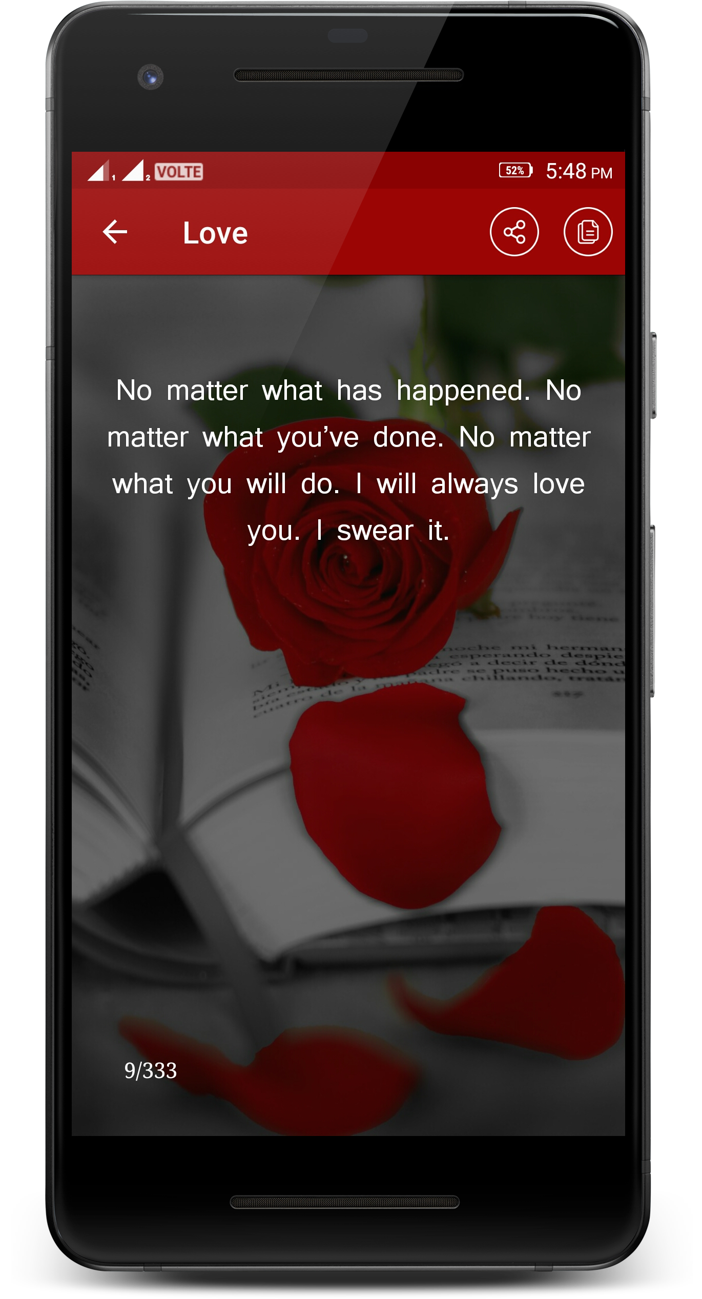 Shayari application contain the all categories shayari in hindii language. Shayari lets you explain sentiments in all their forms through rhythmic words. Shayari is used to convey the sentiment of love. Beautifully written and narrated Shers makes it easy for a lover to pour his or her heart in front of the lover. There are many languages to express yourself and to display your feelings, but the effective best and most powerful way is through the world of sher-o-shayaris. Shayri is a unique poetic way to express yourself and your feelings. This application contain the different category Shayari like: Love Shayari, Urdu Shayari, Bewafai Shayari, Dard Shayari, Dosti Shayari, Marathi Shayari, Hindi Shayari, Best Shayari, Latest Shayari, Comedy Shayari, Lovers Shayari, Bollywood Shayari Valentine Shayari English Shayari Romantic Shayari Funny Shayari Friend Shayari Miss u Shayari Sad Shayari Funny Attitude Shayari Attitude Shayari Propose Shayari Birthday Shayari Love Shayari Hindi Romantic Shayari Hindi Sad Shayari Hindi Friend Shayari Hindi Bewafa Shayari Hindi Funny Shayari Hindi Valentine's Shayari Hindi Judai Shayari Hindi Morning Shayari Hindi Night Shayari Hindi Also Contains A Huge Set Of New Status, Love Status Attitude Status Friend Status Funny Status Sad Status Breakup Status Life Status Hindi Shayari Shayari 2017 and many more. Application contain almost all Status, Shayari categories like Hindi, Love, Dard, Bewafa, Valentine, Urdu, Sad, Dosti, All. This application contain approx more than 5000 Shayari in it. With this application user can easily share the Shayari to another. This application contain best Shayari and Status message for Valentine.
