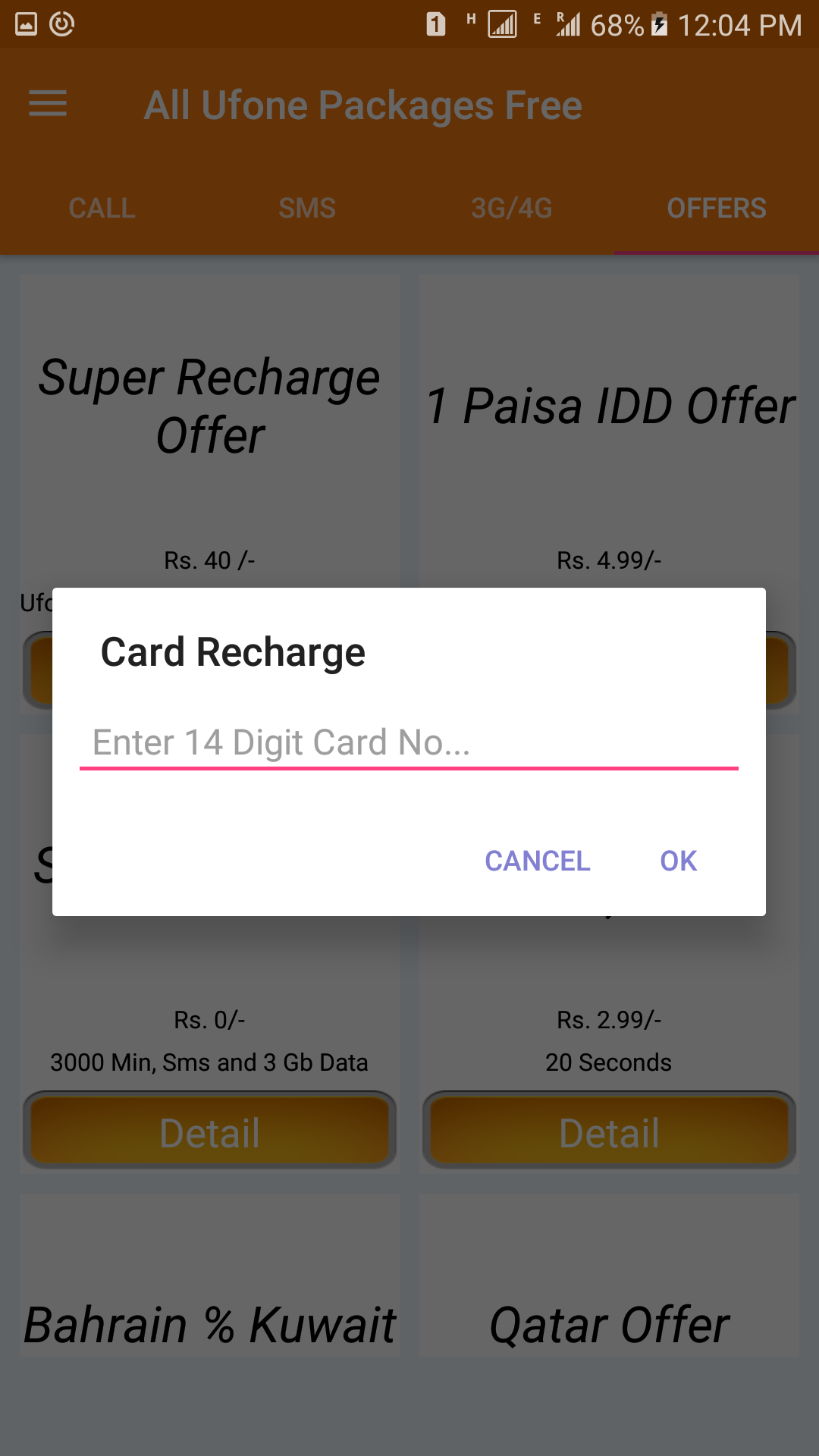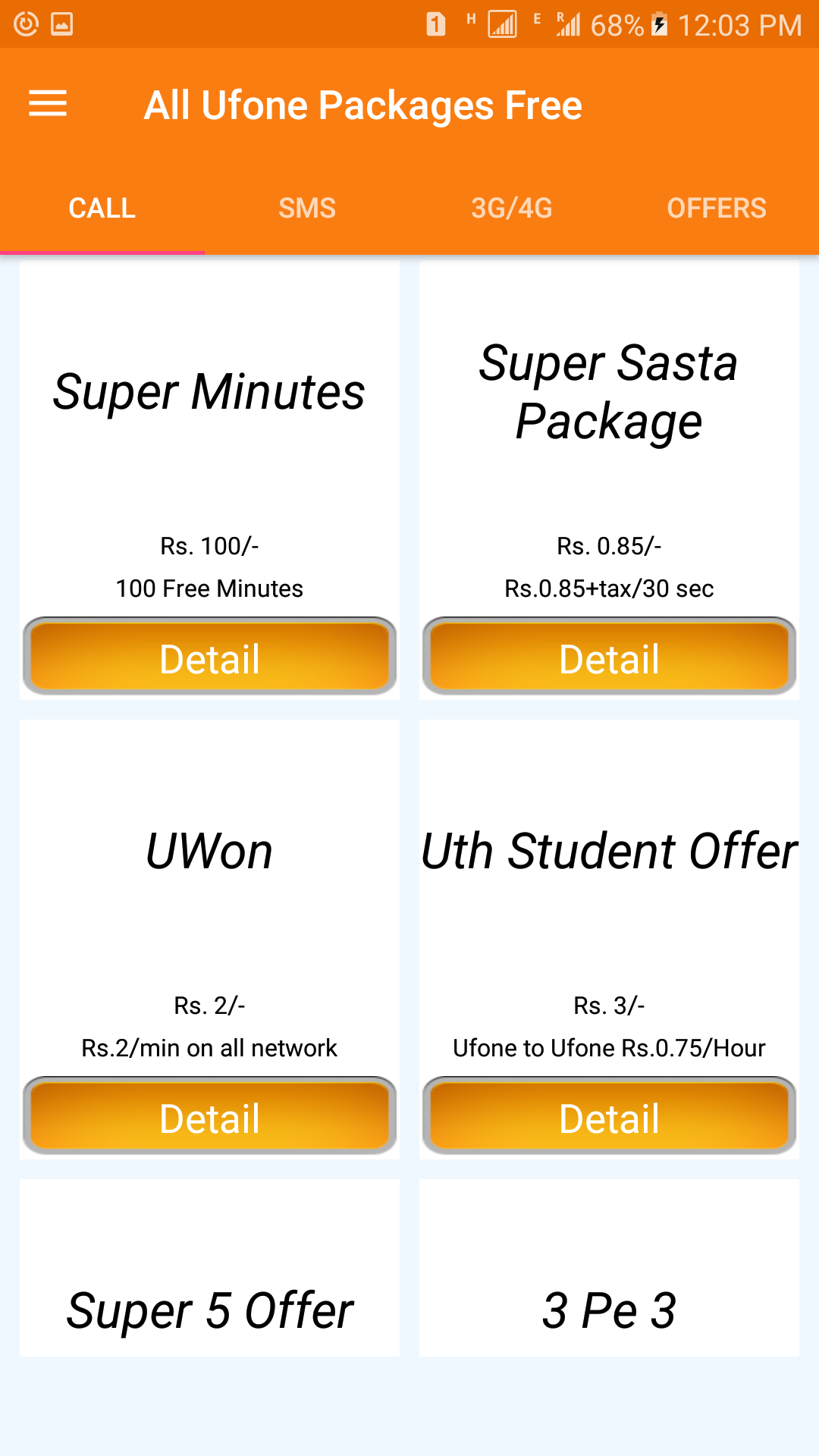 All Ufone Pakistan app provide all Packages information’s containing Sms, Call, Internet 3G,4G and international offers and other offers like Sim lagao offer. User can easily find the information about all types of Ufone offers. It also provide remaining sms, minutes, internet , account balance. You can recharge card by just one click. Someone can subscribe all packages by just clicking the desire package. Ufone Packages 2019 are free and Updated. All Ufone packages and bundles are updated regularly.It Contains All detail , price, validity and codes of Packages. Free Packages Free whatsapp Free facebook You can find following Ufone packages and offers information in this app: • Sim Lagao Offers • Internationals Offers • Ufone 3G Packages • Ufone 4G Packages • Ufone Internet Packages and net offers • Ufone SMS Packages • Ufone Call Packages and bundles All Ufone Offers: Power Hour Asli Chappar Phaar Offer Daily Pakistan Offer Beyhisaab Offer Super Minutes New offers Super Recharge Offer Mini Super Card Super Card Super Card Plus Super Load Daily Package DAILY CHAT International SMS Bucket Unlimited Package Yearly SMS Package Weekly SMS Bucket 45 Day SMS Bucket 2-in-1 SMS Offer Unlimited SMS Bucket SPECIAL DAILY DAILY LIGHT MEGA INTERNET SOCIAL DAILY 3 DAY BUCKET WEEKLY LIGHT SUPER INTERNET WEEKLY INTERNET PLUS MONTHLY LIGHT MONTHLY HEAVY SOCIAL MONTHLY Now, you don't need to remember tough and complicated packages subscription codes and their details.You have to install All Ufone packages free app once, and you will have information about all latest packages in your hand without any additional Internet connection. These packages consist of Hourly, Daily,weekly,monthly and yearly offers, also consist of other prepaid offers and postpaid offers. Free Packages that are offered by Ufone are also available in the app according to Ufone policy. It Provide Services offline. Its contains Sudia Arabia, Bahrain,India,UAE, Afghanistan, UK,USA,Canada,France, Spain,Iraq,Iran and other Internationals Packages. Download and enjoy and Say Tum he to Ho.