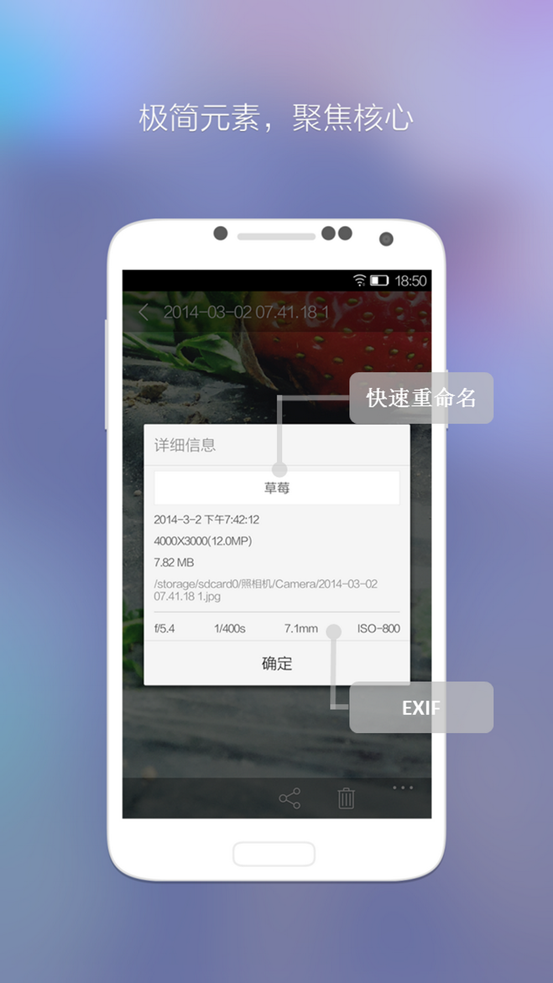 Picture details focus on most important information. File name can be modified in this interface.