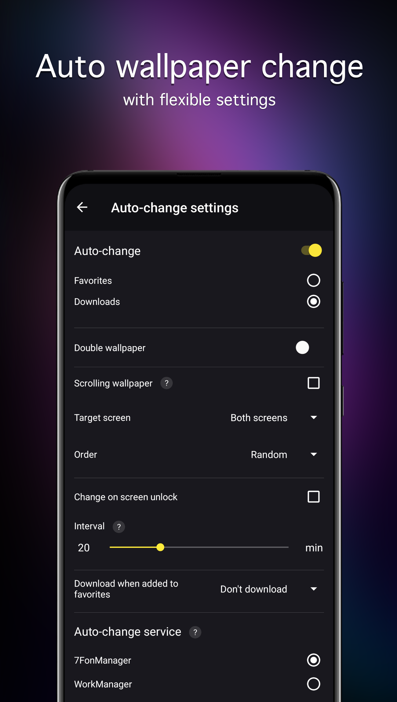 AMOLED wallpapers in 4K for Android Dark and black backgrounds curated for a clean, high-contrast look. Categories, tags, and color search help you find the right wallpaper fast. This is a dark-focused wallpaper app for anyone who wants a clean, consistent setup. Explore AMOLED backgrounds, dark wallpapers, and black wallpapers in one curated catalog. Match wallpapers to your theme, icons, and style, then set or download in one tap. Keep a few favorites and rotate them automatically—no need to search again every time you want a fresh background. Why people choose AMOLED wallpapers • Dark and black backgrounds highlight the contrast that AMOLED displays are known for. • A dark wallpaper makes it easier to keep a consistent "dark" style across themes and icons. • With curated selections, it’s simple to pick a background that looks clean and intentional. What you’ll find in the catalog • Dark wallpapers and black backgrounds across dozens of categories. • Space wallpapers, abstract wallpapers, nature wallpapers, animal wallpapers, car wallpapers, and more. • Curated selections for fans of dark aesthetics, including AMOLED-friendly collections. Curated and moderated (no random dumps) Every image is reviewed before it goes into the catalog. This collection is curated and moderated by the 7Fon team, which helps keep the library clean, relevant, and consistently updated. Resolution and quality • Full HD (1080p) and higher: QHD, UHD, and 4K (availability depends on the image). • High-resolution files help when you preview details, crop, and set a wallpaper. • The catalog is updated regularly, so you’ll always have new options to browse. Browse, search, and filter Use whichever workflow is fastest for you: • Categories for quick discovery. • Tags and keyword search in your language. • Color search to match an accent color or overall palette. • Sorting: newest, rating, and popularity. Set, crop, download • Preview and crop before you set a wallpaper. • One-tap set and one-tap download. • Download wallpapers for deferred installation and keep them saved locally. • Save images to your gallery or an SD card (if supported by your device). Scheduled wallpaper changer Want automatic changes? Add wallpapers to Favorites, pick a source (Favorites or a category), choose the interval, and your wallpaper updates automatically on schedule. How to build your own rotation 1) Find a few wallpapers you like (use categories, tags, or color search). 2) Add them to Favorites. 3) Enable the scheduled changer and set your interval. 4) Download your favorites if you want them saved locally. Wallpaper notifications • Wallpaper of the Day notifications. • Wallpaper of the Week notifications. Data-friendly browsing Adjust preview quality to help reduce mobile data usage while browsing. Also suitable for OLED displays. Use wallpapers in chats Use a selected image as a WhatsApp chat wallpaper and in other messengers (WhatsApp is a third-party app and is not affiliated with this app). Main features at a glance • AMOLED wallpapers and dark backgrounds in Full HD and above (up to 4K when available). • Categories, tags, and color search. • Favorites + scheduled auto-change. • Sort by newest, rating, and popularity. • Preview, crop, download, and save (gallery/SD card if supported). Note: Saving to an SD card depends on device support and may vary by Android version. Tip: Save a few matching wallpapers to Favorites and enable scheduled changes for an always-fresh dark setup.