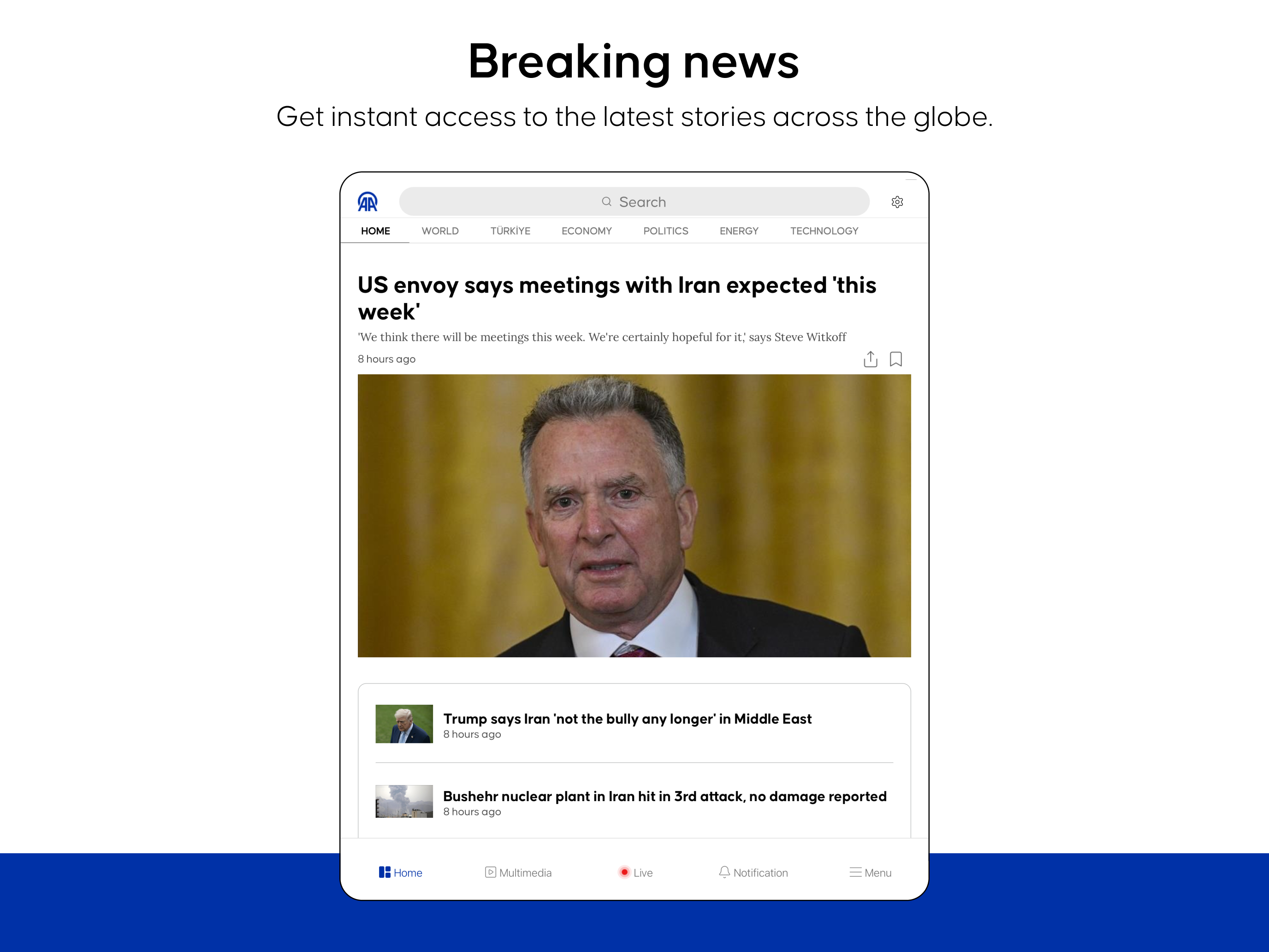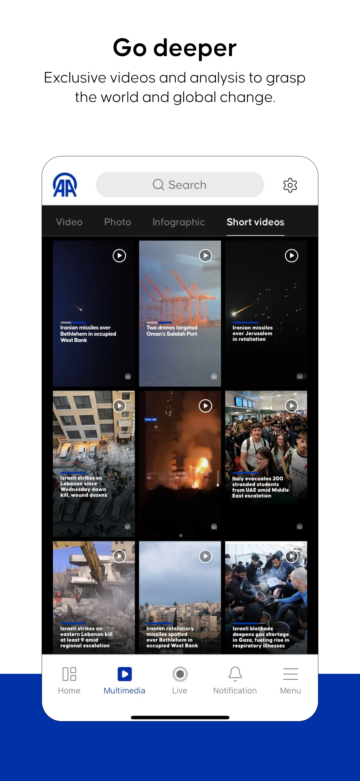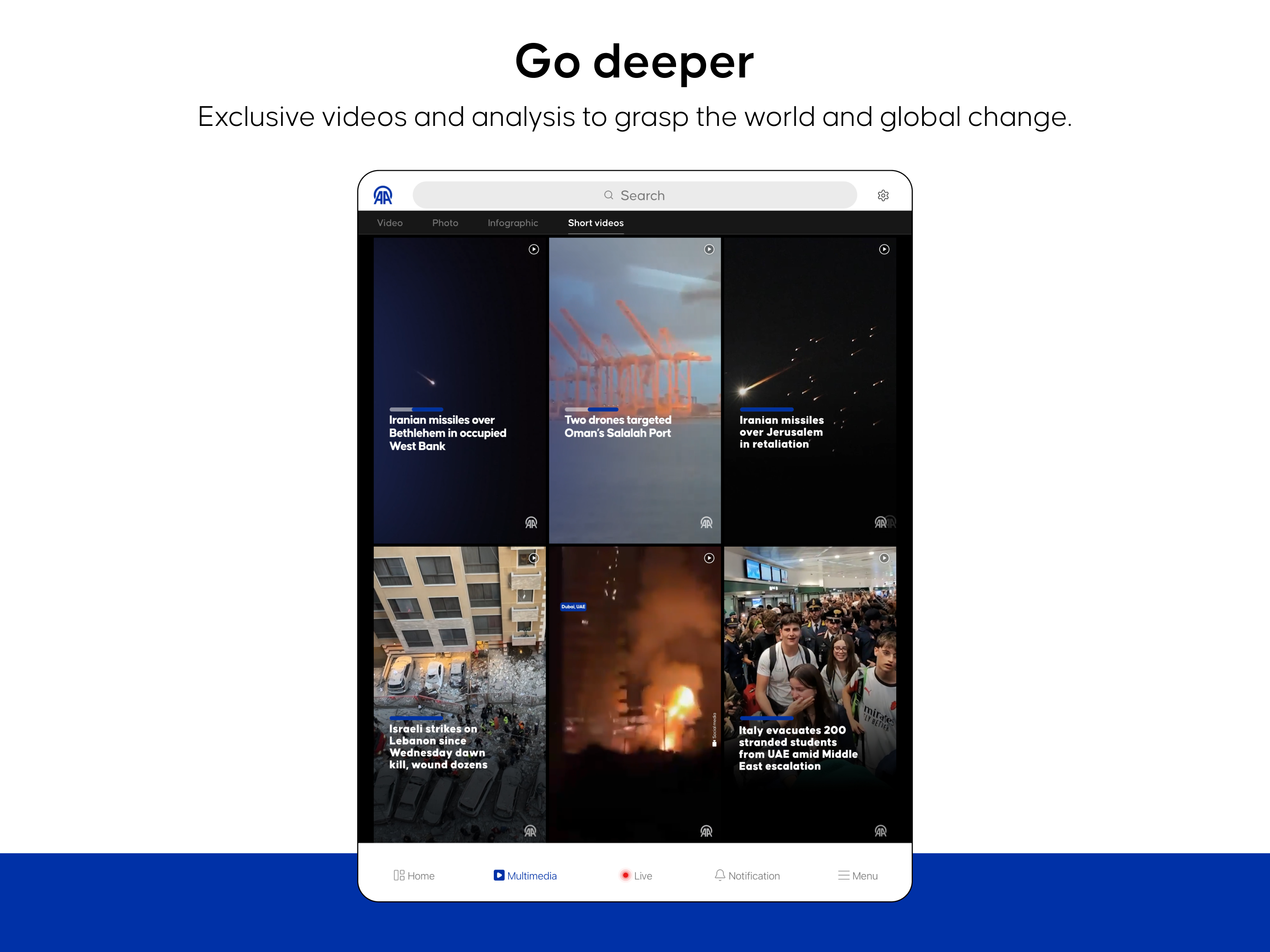 REPORTING THE CHANGING WORLD Discover original reporting and understand the events shaping the world with the Anadolu app. Follow breaking news and get live updates as they happen. Go beyond the headlines with expert analysis, award-winning photography, and in-depth special reports from our global network of correspondents. BREAKING NEWS AND LIVE UPDATES Instant Notifications: Receive push notifications for the latest headlines and developing stories across the globe. Live Coverage: Witness history in the making with live broadcasts and a seamless flow of news from every corner of the world. ORIGINAL REPORTING AND IN-DEPTH ANALYSIS Global Perspective: Access reliable news from our extensive network, delivering local depth with global reach. Expert Insights: Understand not just the "what," but the "why" through investigative reporting and strategic commentary. VISUAL JOURNALISM: VIDEOS AND PHOTOGRAPHY News Videos: Watch high-definition reports, short documentaries, and videos that provide essential context to top stories. Award-Winning Photography: See the world through the lens of our photojournalists, capturing the human story behind the news. INSIGHTS THROUGH DATA Visual Storytelling: Unravel complex global events through exclusive infographics and data-driven reports. Clarity in Data: Don’t just read the numbers—visualize the trends with clear, informative, and impactful graphics. SAVE AND PERSONALIZE Reading List: Easily save and access articles or special reports to read later, even when you’re offline. Personalized Feed: Customize your news experience by following the topics and regions that matter most to you.