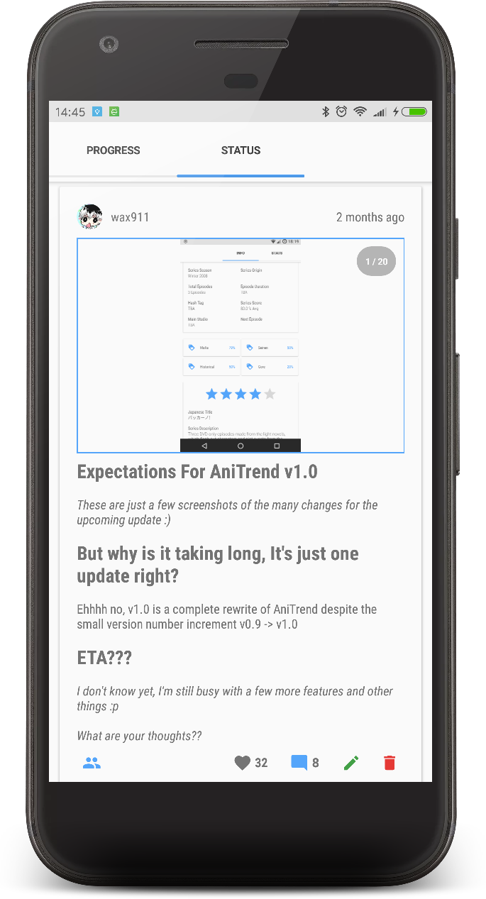π What's New with AniTrend? AniTrend, is committed to enhancing your anime discovery and tracking experience with every update! π β οΈ A Quick Note: Updates will be slow as we are working hard behind the scenes on v2 β We appreciate your patience and support. π π Have questions or need support? Visit our FAQ: docs.anitrend.co/project/faq Thank you for being a part of the AniTrend community! Your feedback helps us improve. πΈ