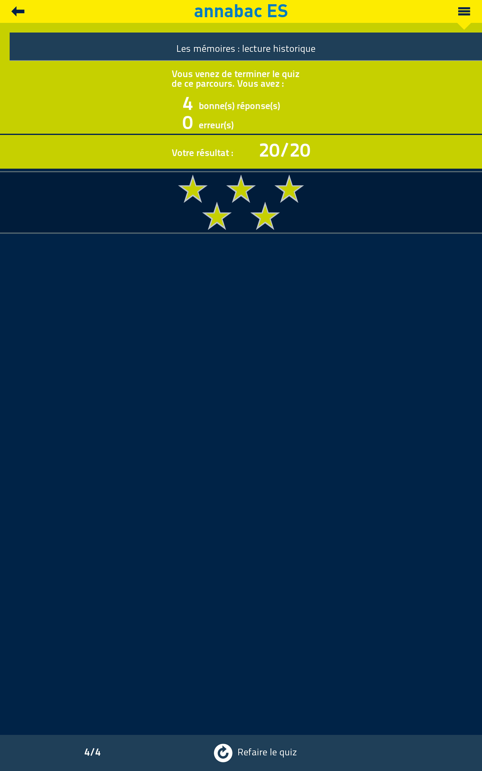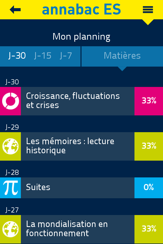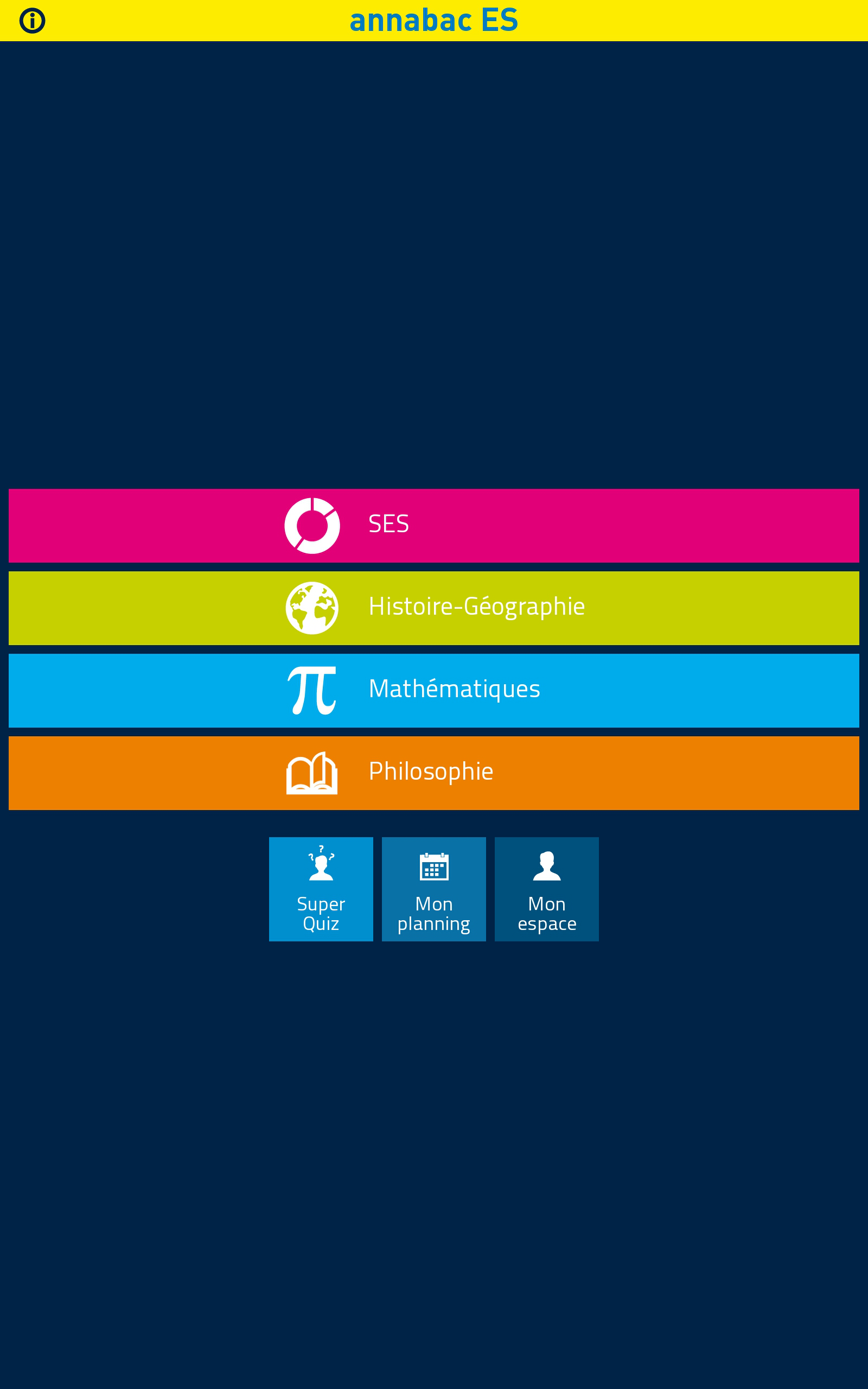 -- L'application de référence pour réviser et réussir son Bac, entièrement gratuite. Vous êtes en Terminale ES : Annabac, n°1 de la préparation aux examens, vous propose son application pour réviser et réussir votre bac. > 47 parcours de révision interactifs. - Réalisée par des enseignants de terminale, conforme au programme du bac 2018, cette appli vous permet de réviser de manière efficace, dans les quatre matières à forts coefficients du bac ES : SES, Histoire-Géographie, Maths et Philosophie. - Sur tous les thèmes du programme, vous pouvez accéder à des parcours de révision progressifs comprenant : -- des cours audio -- des fiches de révision -- des quiz de 5 à 10 questions -- des sujets de bac corrigés Également, en philosophie, des vidéos sur des problématiques clés du programme. > Un planning de révision personnalisé. Le bac se rapproche : vous êtes à 30 ou 15, voire à 7 jours de l’examen. L’application annabac Bac ES vous propose un planning de révision personnalisé en fonction du temps dont vous disposez et des matières que vous souhaitez réviser. > Un super quiz pour estimer vos points forts et vos points faibles dans toutes les matières. > Un tableau de bord pour suivre vos résultats et votre progression. * L’appli Annabac 2018 Bac ES fonctionne hors connexion internet, pour pouvoir réviser n’importe où, n’importe quand. -- Description des contenus de l'application : SES : 7 parcours de révision avec des cours audio, des fiches de révision, des quiz, des sujets corrigés. - Science économique : Croissance, fluctuations et crises / Mondialisation et intégration européenne / Économie du développement durable / Classe, stratification et mobilité sociales / Intégration, conflit, changement social. - Regards croisés : Justice sociale et inégalités / Travail, emploi, chômage. Histoire-Géographie : 16 parcours de révision avec des cours audio, des fiches de révision, des quiz, des sujets corrigés. - Histoire : Les mémoires : lecture historique / Socialisme, communisme et syndicalisme en Allemagne depuis 1875 / Médias et opinion publique depuis l’affaire Dreyfus / Les États-Unis et le monde depuis 1918 / La Chine et le monde depuis 1949 / Le Proche et le Moyen-Orient, depuis 1918 / Gouverner un État-nation : la France depuis 1946 / Gouverner à l’échelle continentale : le projet d’une Europe politique depuis 1948 / Gouverner à l’échelle mondiale : la gouvernance économique depuis 1944. - Géographie : La mondialisation en fonctionnement / Les territoires dans la mondialisation / Le continent américain / États-Unis et Brésil / Le continent africain / L’Asie du Sud et de l’Est / Japon et Chine. Mathématiques : 9 parcours de révision avec des cours audio, des quiz, des sujets corrigés. - Analyse : Suites / Notion de continuité sur un intervalle / Fonctions exponentielles / Fonction logarithme népérien / Convexité / Intégration. - Probabilités et statistiques : Conditionnement / Notion de loi à densité / Intervalle de fluctuation - Estimation. Philosophie : 15 parcours de révision avec des vidéos, des cours audio, des fiches de révision, des quiz, des sujets corrigés. - Le sujet : La conscience / L’inconscient / Le désir. - La culture : L’art / Le travail et la technique / La religion. - La raison et le réel : La démonstration / La matière et l’esprit / La vérité. - La politique : La société / L’État / La justice et le droit. - La morale : La liberté / Le devoir / Le bonheur. Site web : www.annabac.com Assistance : Annabac 2018 Bac ES