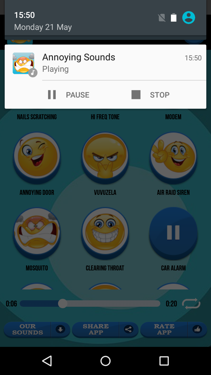 Annoying Sounds is a remarkable new app that offers peculiar collection of the most irritating and annoying sounds for your smartphone. Here you will find the loudest unpleasant sounds you can imagine. Your smartphone will attract attention every time someone contacts you! We have the best SMS notification tones, amazing ringtones and loud alarm sounds that will blow your mind! There are all kinds of infuriating sounds here: mosquito, sirens, irritating laughs, alarms, nails on a chalkboard, burp and fart sounds and so much more! You can now use these annoying sounds to annoy others. Vex your friends and family with these crazy loud sounds and soon they will laugh out loud when they realize you are pulling pranks on them. * All ringtones are preloaded inside the app and FREE to use. * Set as ringtone, SMS/e-mail notification, alarm sound or assign as ringtone to specific contact in your contact list (PRESS AND HOLD PLAY). * Easy to use UI, Annoying Sounds App works in landscape and portrait mode, optimized for all tablets and smartphones. * Top new & funny ring tones and SMS sounds! * Share your favorite sounds via social networks using the simple SHARE button. Everyone around you will freak out every time someone contacts you on your mobile phone. “Annoying Sounds” is a loud, amusing and cool way to show your exceptional sense of humor every day! You can choose from an extensive selection of various “top free ringtones” which will make you burst out laughing and set different message alert tone for each contact from your phone! Annoying Sounds will definitely put a smile on your face every time you get a text message or e-mail. It is an amazing new app for your Samsung Galaxy or any other Android™. Annoying Sounds offers tremendous selection of message tones, alarm sounds and best ringtones you can imagine! Check it out and you will be amazed by a fantastic selection of loud crazy sounds! Annoying Sounds are just what you need to brighten every day! Laughter is healthy for you, and with these funny Annoying Sounds, you will have tons of fun so use them as stress relief daily! Everyone around you will LOL every time someone contacts you on your mobile phone. You will have a blast with your friends every time your phone goes on! Enter the world of displeasing and awkward ringtones with these free new Annoying Sounds. Assign special annoying ringtone sounds for the most irritating people in your contact list and you will know exactly when you don’t want to answer the phone. Download Annoying Sounds for free now and discover sounds that annoy you the most! There is something for everyone’s taste, funny odd SMS notifications, amusingly loud ringtones, energizing and bizarre alarm sounds. Show everybody how strangely cool and hip you are. Feel free to contact us for any questions or feedback.