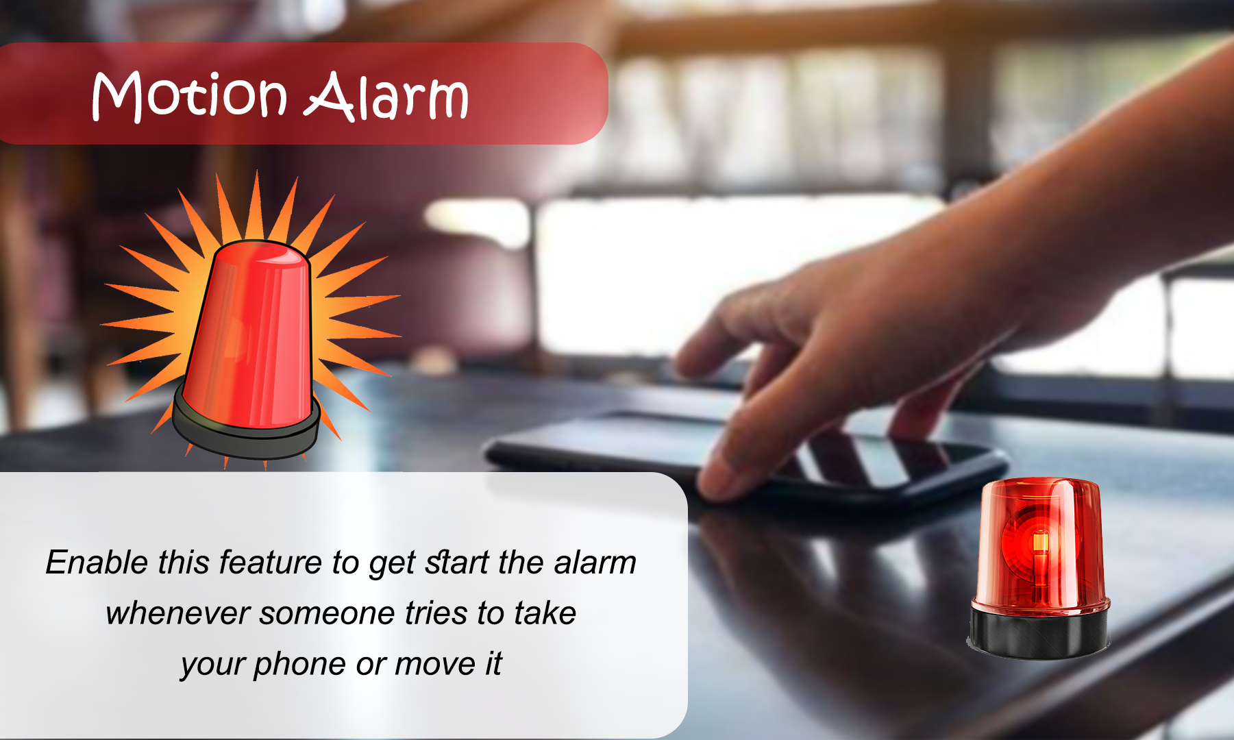 Don't Touch My Phone: Ultimate Anti-Theft & Security App Are you tired of worrying about your phone being stolen or tampered with by unauthorized individuals? Look no further than Don't Touch My Phone, the ultimate anti-theft and security app for Android devices. This powerful app is designed to protect your phone from thieves, pickpockets, snoops, and anyone else who tries to mess with your device. With a range of advanced security features, Don't Touch My Phone ensures that your phone remains safe and secure at all times, whether you're at home, in the office, or on the go. Key Features: Motion Detector Alarm: Activate this feature to detect any motion or movement. If someone tries to pick up your phone, a loud alarm will sound, deterring potential thieves and alerting you instantly. Charger Removal Alert: Ensure your phone stays charged and secure. If someone disconnects your phone from the charger without your permission, the app will trigger an alert, notifying you of the unauthorized action. Pick Pocket Snatching Alarm: Protect your phone from being stolen in crowded places. This feature sounds a loud alarm if your phone is removed from your pocket, making it impossible for thieves to get away unnoticed. misplacing your phone all the time and don't know where to look at? No worries activate the clap to find my phone, and whenever you don't see your phone you just need to make a 2 hand claps to make your phone rings on loud alarm sound even if you phone is on "do not disturb mode" Customized Alert Tones: Personalize your security experience by choosing from a variety of sounds for your alerts. Make sure your phone's security system matches your style and preferences. Easy-to-Use Interface: With a user-friendly design, setting up and using Don't Touch My Phone is a breeze. Simply activate the features you need and let the app take care of the rest. Privacy Protection: Keep your personal data and sensitive information secure from unauthorized access. Don't Touch My Phone ensures that your privacy is never compromised. Background Operation: The app continues to work even when your phone's screen is off, providing continuous protection without draining your battery. Sensitive Touch Detection: Detects even the slightest touch on your phone, ensuring no one can tamper with it without setting off an alarm. Intruder Selfie: Captures a photo of anyone who attempts to unlock your phone, providing you with evidence of unauthorized access attempts. Password Protection: Secure the app itself with a password to prevent anyone from disabling its features without your permission. Why Choose Don't Touch My Phone? Top-Rated Security App: Trusted by millions of users around the world, Don't Touch My Phone is a top-rated security app that delivers effective theft prevention and peace of mind. Free to Download: Enjoy the ultimate phone protection without any cost. Don't Touch My Phone is available for free on the Play Store, with optional in-app purchases for additional features. Effective Theft Prevention: Deter thieves and protect your phone with loud alarms, flashing lights, and personalized alert tones. The app is designed to make it impossible for thieves to steal your phone unnoticed. User-Friendly Design: With its simple setup and intuitive controls, Don't Touch My Phone is easy to use for everyone, regardless of technical expertise. Additional Benefits: Multi-Language Support: Available in multiple languages to cater to users around the globe. Regular Updates: The app is continuously updated with new features and improvements to ensure your phone remains protected against the latest threats. Download Don't Touch My Phone today and experience the ultimate protection for your Android device. Say goodbye to phone theft and unauthorized access, and enjoy peace of mind knowing your phone is secure at all times.