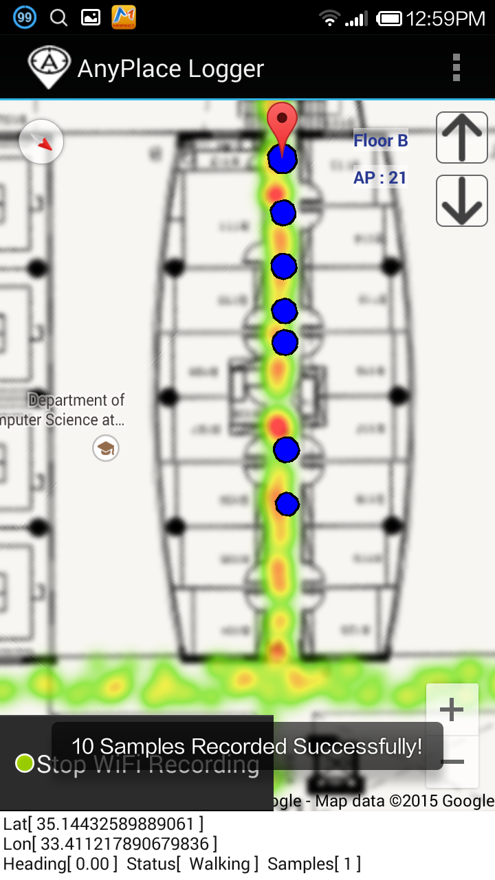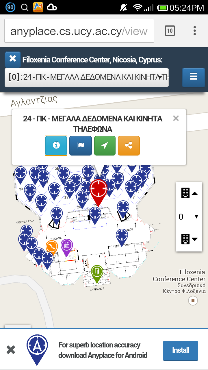 People spend 80-90% of their time in indoor environments such as offices, undergrounds, shopping malls and airports. On the other hand, the uptake of interesting applications in indoor spaces (e.g., navigation, inventory management and elderly support) has so far been hampered by the lack of technologies that can provide indoor location (position) accurately, in real-time, in an energy-efficient manner and without expensive additional hardware. Anyplace is a first-of-a-kind GPS-less localization and navigation service working in indoor and outdoor space using ordinary smartphones. It has been developed by researchers and students at the Data Management Systems Laboratory (DMSL), Department of Computer Science and the KIOS Research Center, both at the University of Cyprus. Anyplace deploys a number of innovative concepts, including crowdsourcing, big-data management, energy-aware processing, multi-device optimization and mobile data management, in order to realize a power-efficient indoor localization and navigation technology that recently won several international research awards for its accuracy (less than 1.96 meters)! Our Web 2.0 Service allowing entities (users, companies, organizations, etc.) to map buildings for private or public use. Entities get a full scope of map management utilities contrary to major counterparts that acquire the data for public use only. Additionally, we seamlessly integrate GPS (for outdoor), WiFi and Sensory technology (for indoor) to realize a power-efficient localization and navigation technology that is extremely accurate.
