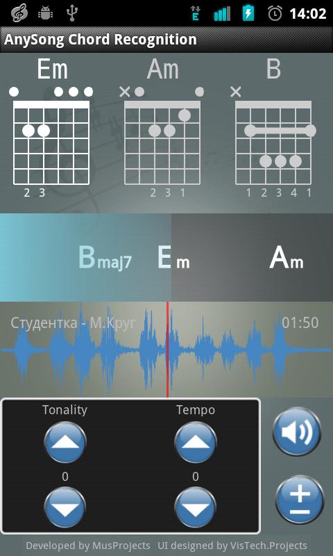 With this application you will be able to recognize guitar chords (first 40 seconds) extracted from any song stored on your android device. Upgrade to PRO version (from main menu) enables full song processing. Imagine that you have a guitar and burn with the desire to play one loved song. But you don’t know the chords. One of the first ideas that can come up to your mind is to surf the Internet. If the song is quite popular, it is likely that you will find numerous versions of guitar chords and tabs. But sometimes, the quality of the chords produced by an amateur leaves much to be desired. You can find yourself in a more difficult situation if the song is not among the latest hits from the top charts, or has just been released. There is always an alternative solution – to ask a professional musician to pick up the guitar chords by ear, or to do it yourself. Fortunately, there is a better, faster and more reliable solution now! Recognize guitar chords to your favorite songs on your Android device with a new application - AnySong Chord Recognition. Just choose an audio file from your music collection, wait a little, and get the desired guitar chords! AnySong Chord Recognition automatically analyzes audio, extracts the chords and shows the appropriate guitar tabs on the screen while the track is playing! For sure, you will be amazed with the user friendly interface and appreciate the quality of the recognized chords! AnySong Chord Recognition! Any song, any place, any time!