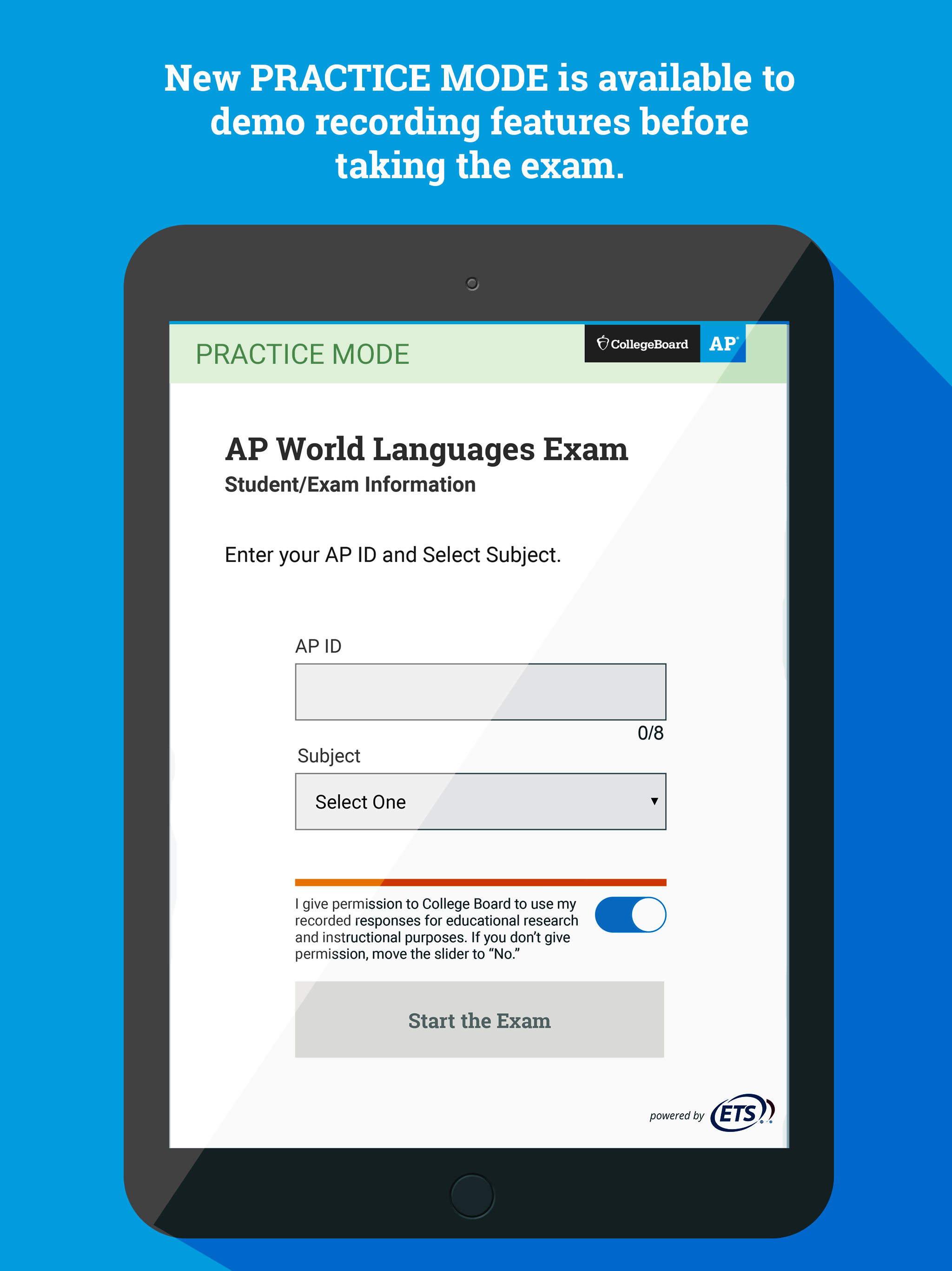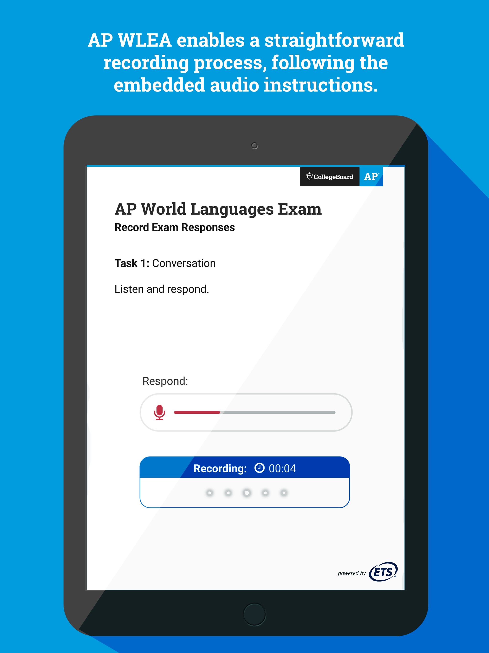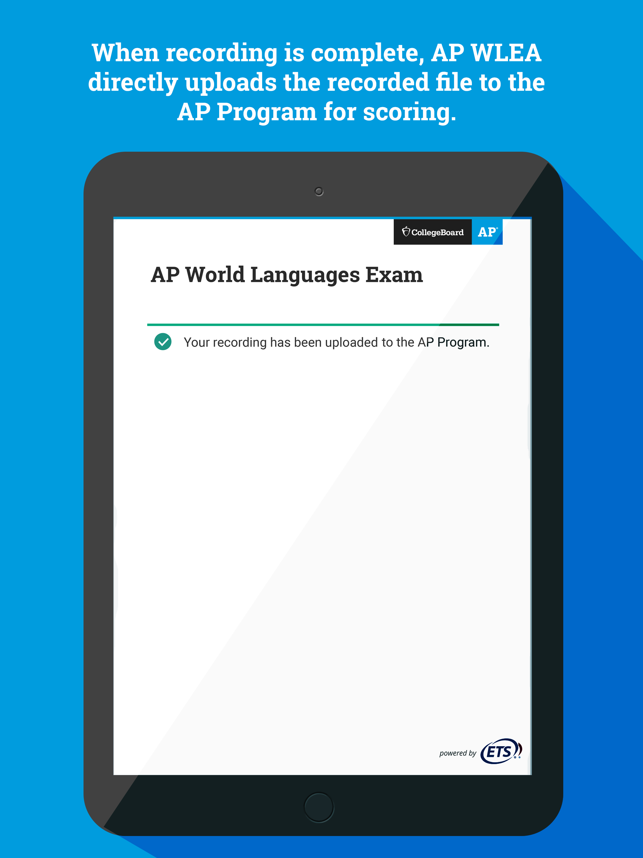 The AP World Languages Exam App (AP WLEA) is a free app developed by College Board and ETS for AP students to take their 2020 AP Chinese, French, German, Italian, Japanese, and Spanish Language and Culture online exams. The app includes audio instructions and prompts to guide students through the exam, and records their responses. Recorded responses will automatically upload for scoring. AP WLEA also has a practice mode, for practice prior to exam day. NOTE: The AP WLEA is new for the 2020 AP online exam. It is the ONLY recording option that can be used to record world language audio responses in 2020. Previous recording options such as handheld digital recorders, computers with recording software, digital language labs, or the DAC app may not be used.