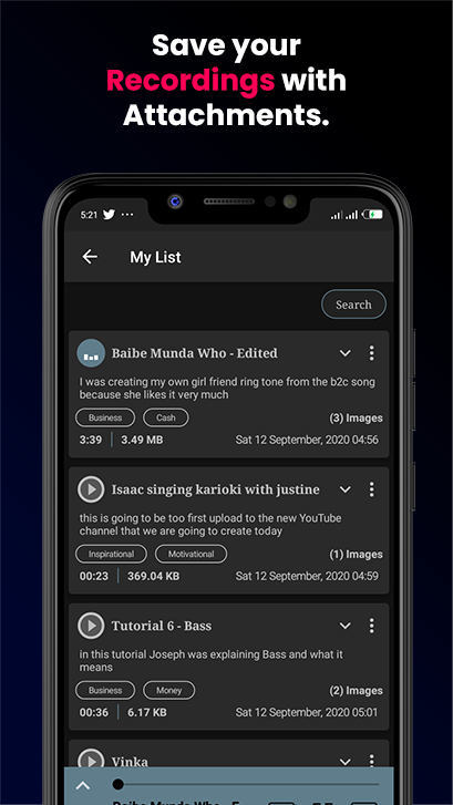 Voice recorder, Voice editor, Audio editor, Sound recorder, Notes, Memos, To-Do List, Password Manager, and Flashlight (6 in 1). Simply the best app for real professionals! This is the only voice recorder, audio editor, notes, To-Dos, Password Manager, Reminders and flashlight application that needs to be on your phone. A 7 in 1 app that will help you be more organized and more professional. Use this app to record meetings, speeches, ideas, lectures, songs with just one tap. Organize your notes, pictures, and recordings in a beautiful timeline. Organize your tasks with Apex Reminders and our smart To-Do List. Never lose your passwords, keep them safely with Apex Password Manager. Are you a thinker or a musician who wants to record a new idea, a journalist who wants to record interviews. You need to write or record it before you forget it and Apex is perfectly capable of handling it for you. Why Apex? -: Audio recorder, Voice editor, notes, To Dos, Password Manager, Reminders and Flashlight (7 in 1) -: Secure your notes and voice recordings with a password -: Save time and increase your productivity -: Be more organized and sound professional with your best recorder -: Voice recording for people who value efficiency and accuracy -: Intuitive, creative, and efficient -: Back up unlimited recordings and notes safely with Apex Cloud -: Access recordings anytime from any device -: Record with great quality, attach images and notes and organize your recordings into a beautiful timeline -: Never lose your passwords - Keep them safely with Apex Password Manager -: Make a daily to do list -: Set reminders Features: -: High-quality recording -: Simple user interface -: Background recording -: Import audio files -: Record Wav, Mp3, m4a, mp4, aac -: Files backup -: Pause recording during phone calls -: Trim, cut, noise reduction, fade in, fade out, add music -: Karaoke music recorder -: Bass boost, change speed, equalizer -: Pause during phone calls -: Trim audios easily -: Merge two or more audios/ audio merger -: Reminders -: Password manager -: To do Lists Get this amazing app today!