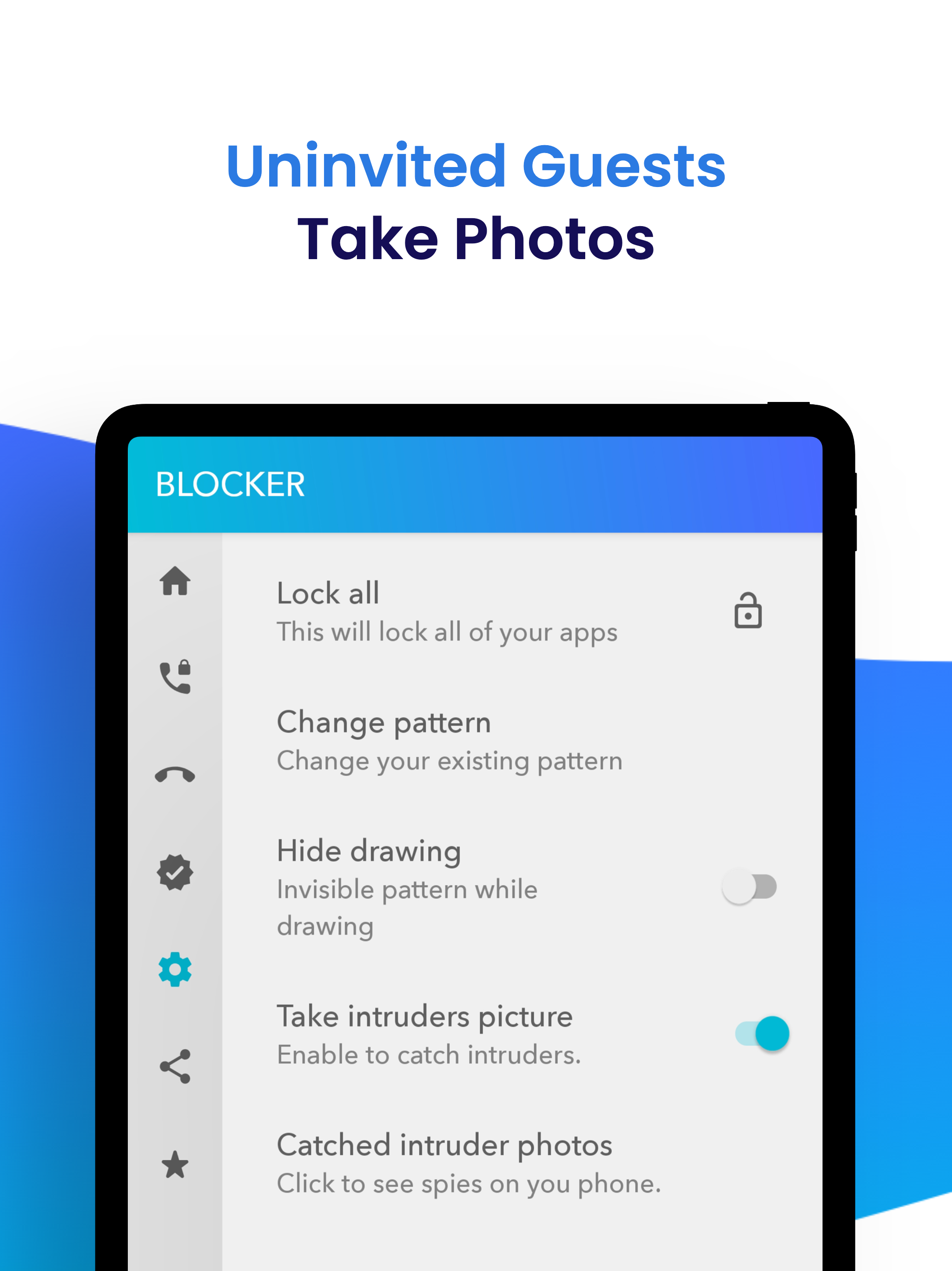 App Locker - Blocker App Lock is your all apps. Choose a lock pattern, lock apps you want. Blocker (App Locker) is the best way to prevent intruders who want to open your locked apps without your permission. Your privacy is important to us. Keep your apps safe with this lockdown app! ► App Lock - World's first and most reliable AppLock Blocker for Android Locks your photos, gallery and messages against cunning people and inquisitive friends Prevent your kids from downloading unwanted apps and games with App Lock feature You want: ? Secure application locking ? App lock with app lock pattern ? App lock pin ? App lock fingerprint ? Photo locker, privacy lock for videos and gallery ? Protect private messages on your phone Apps lock and protect privacy - Support app locker fingerprint, PIN and pattern - Picture locker, gallery lock Identify intruders - App photo lock software takes photos of people who open your phone deliberately and save them to your gallery. - Keep your phone safe Instagram, Snapchat, WhatsApp, Hangouts, WeChat, Facebook, Twitter, Gmail, Camera, Gallery, Photos, Videos etc. Protect your security by locking all your other apps! An Android application that must be on your device for the security of your personal data. ★ Lock your apps with a pattern or fingerprint that is safe and easy to open. ★ Does not consume battery life and system resources like other apps. ★ Keep your social life private by locking your messaging and social media apps. ★ Protect your photos by locking gallery and photo apps. ★ Hide your data from prying eyes. ★ Cool Themes, Cool Colors! ★ Works flawlessly even on the latest Android versions. Spy Camera ★ Why are permissions required? (AppLock) Blocker includes advanced features. All necessary permissions are required to apply Advanced features. For example, "Photos / Media / File Permissions", a background image. ★ How does the spy camera feature work? In the locked app and (Applock) Blocker app, whenever people who want to enter the (Applock) Blocker app without permission, each time they enter the password incorrectly, a photo is taken from the front camera and saved to the gallery. This way you can easily know who wants to infiltrate your phone! IMPORTANT NOTE FOR HUAWEI and XIAOMI USERS! Some software on Huawei and Xiaomi devices prevent the Locker service from working. In order for App locker (Blocker) to work, you need to allow Locker from the security options on these devices. Huawei: Phone Manager app> Protected Apps> Add Locker to the list. Xiaomi: Services> Security> Permissions> Auto-start, find Locker and add it to the list. About Subscription Details of our subscription offer: Subscription length weekly, monthly and yearly Blocker (App lock) has the following subscriptions: Blocker (App lock) pro weekly - 11.99 TL Blocker (App lock) pro monthly - 34,99 TL Blocker (App lock) pro yearly- 354.99 TL The fee may vary depending on the packages you prefer. • Payment will be credited to your Google Play account at confirmation of purchase. • Subscription automatically renews unless auto-renew is turned off at least 24 hours before the end of the current period. • A renewal fee is collected within 24 hours from the end of the current period and a renewal fee is given. • Subscription can be managed by the user. Auto-renewal can be turned off by going to the user's Google Play account settings after purchase. • You can cancel your subscription by entering the address below. https://support.google.com/googleplay/thread/19403754?hl=tr Terms of use : http://beyazdislerim.com/term_of_use%20.html Privacy Policy : http://beyazdislerim.com/EULA_PP.html