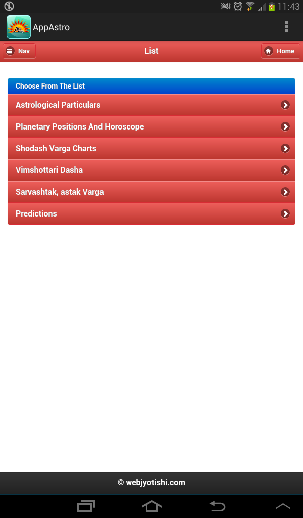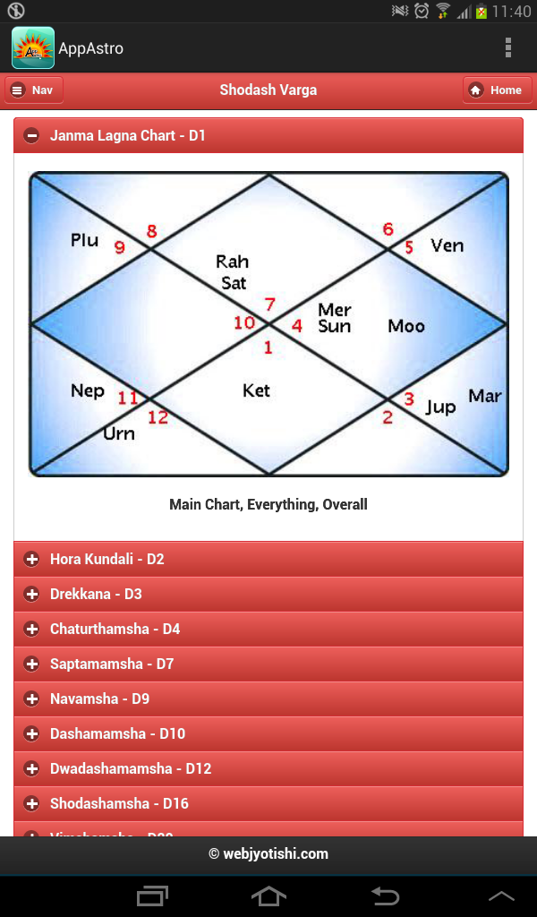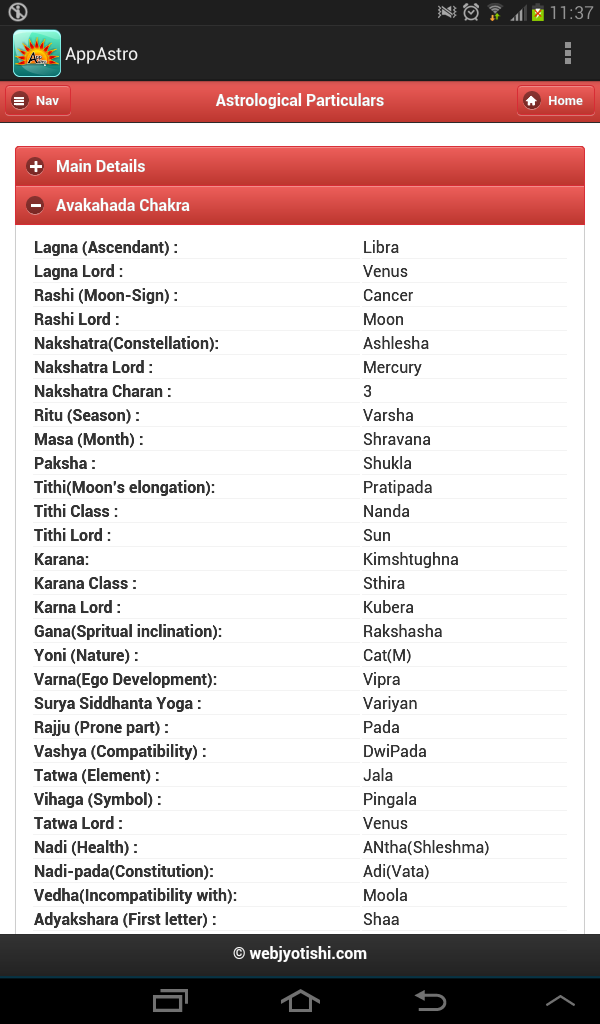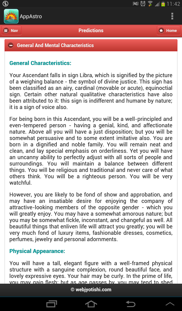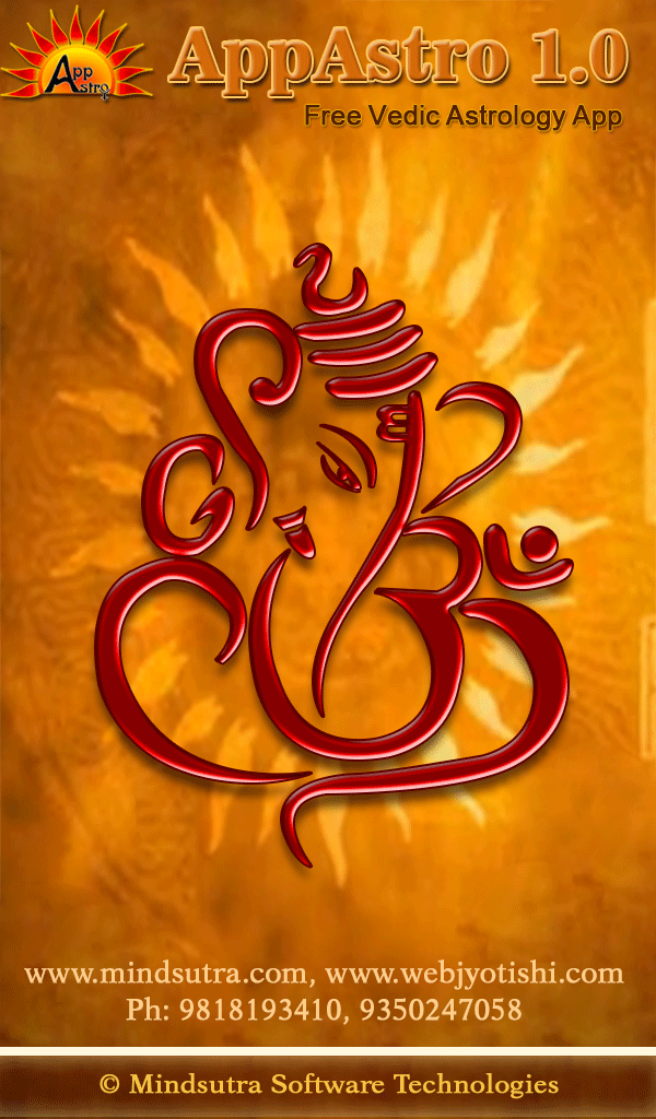 Mindsutra Software Technology, the leading Astrology/Horoscope software development company, presents AppAstro Horoscope (Android based Astrology / Horoscope Application) for absolutely FREE. Get free Horoscope / Kundali with predictions generated in just a few seconds. This is a very powerful Birth Chart (Kundali) software based on Indian / Vedic / Hindu Astrology / Jyotish. List of Contents: Vedic Astrology =============== Astrological Particulars Avakahra Chakra Ghat Chakra Planetary Positions Lagna Kundali, Chandra Kundali, Navamsha Kundali Shodash Varga Kundali – all 16 charts Vimshottari Dasha – Maha dasha, Antar Dasha Bhinna Ashtak Varga Sarvashtak Varga General Prediction (Mental prediction,Physical appearance, Qualities, Negative traits, Specific characters, Occupation, Favourable and unfavourable planets, list of some famous personality having same ascendant (Lagna) as yours Prediction Based on various astrological constants (Samvatsar, Ayan, Season, Masa, Paksha, Day (Vaar), day/Night, Surya Siddhant Yoga, Tithi, Karan, Nakshatra) Planetary Combinations (Yoga) Applicable in Kundali - Important Yogas: Dhana Yogas, Vitta Hani Yogas, Nabhasha Yogas, Anishta Yogas, Ravi Yogas, Chandra Yogas, Pancha Mahapurusha Yogas, Graha Malika Yogas, Arishta Yogas (Coverage of approx 750 Yogas) Details of Rahu-Kaal, Gulik-Kaal, Yamakantak-Kaal, Chaughadiya, Hora Kaal, Muhurth, Panchang Lal-Kitab ========= Planetary Details & Lal Kitab Kundali 35 year's Cycle (Birth Time Planet) Lal Kitab Varsha-Phala Kundali (120 Years) Lal Kitab Varsha-Phala Predictions (120 Years) Numerology =========== Numerological Particulars The "Numeroscope" (or Numerological Horoscope) Composite Predictions from Sun-Sign and Root Number (General, Finance, Health, Favorable Dates, Unfavorable Dates, Favorable Colors, Favorable Gemstones, Climacteric years of your life)