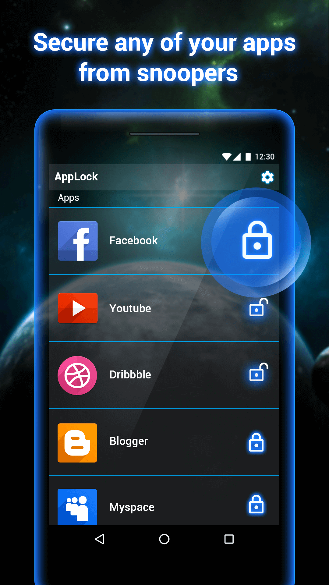 🕋 AppLock Pro protects your privacy 🕋 Worried about girlfriend or boyfriend snooping on your Facebook/Whatsapp/Messenger? Frightened about parents/friends checking your photo gallery? 🎉 Lock them all right now with AppLock - Fingerprint 🎉 🌟 Lock your APPs, which intelligently protecting your privacy safe 🌟 ✅ AppLock can lock any app ✅ AppLock has Beautiful UI design ✅ Simple to use AppLock with password featuring several lock options ✅ AppLock can protect new apps proactively 🌟 Intruder Selfie 🌟 Protect your apps all the time. No one can snoop on your apps without your permission. ✅ Take a photo of who tried to unlock your WhatsApp immediately ✅ Email the snooper's photo to you immediately ✅ The photo will record the date and the time 🌟 Password Type 🌟 AppLock provides you the different password types. ✅ Set your Fingerprint as the password ✅ Use Pattern (draw gesture) ✅ Use PIN code (numbers) 🌟Supports more than 10 languages 🌟 Supported languages: 🇬🇧 English 🇫🇷 French 🇷🇺 Russian 🇦🇪 Arabic 🇵🇹 Portuguese 🇪🇸 Spanish 🇮🇩 Indonesian 🇮🇳 Hindi 🇹🇷 Turkish 🇺🇦 Ukrainian 🇮🇹 Italian 🇻🇳 Vietnamese 🇹🇭 Thai 🇷🇴 Romanian 🇩🇪 German 🇰🇷 Korean 🇲🇾 Malay 🌟 Fingerprint lock password is supported on specific devices 🌟 SAMSUNG devices: 📱 Galaxy S7Galaxy S7 edge - Support Fingerprint Scan 📱 Galaxy A5 (2016)Galaxy A7 (2016) - Support Fingerprint Scan 📱 Galaxy A9 - Support Fingerprint Scan 📱 Galaxy Note 5 - Support Fingerprint Scan 📱 Galaxy Note 4 / GALAXY Note 4 LTE-A - Support Fingerprint Scan 📱 Note 4 S LTE - Support Fingerprint Scan 📱 Galaxy Note Edge - Support Fingerprint Scan 📱 Galaxy Alpha - Support Fingerprint Scan 📱 Galaxy S6 - Support Fingerprint Scan 📱 Galaxy S6 Edge - Support Fingerprint Scan 📱 Galaxy S6 Edge+ - Support Fingerprint Scan 📱 Galaxy S5 / Duos - Support Fingerprint Scan 📱 Galaxy S5 LTE-A - Support Fingerprint Scan 📱 Galaxy S5 Prime LTE-A - Support Fingerprint Scan 📱 Galaxy S5 mini / Galaxy S5 mini Duos - Support Fingerprint Scan 📱 Galaxy A8 - Support Fingerprint Scan Android 6.0 device: 📱 hTc One A9 🌟 Android versions 5.0 and 6.0 are supported 🌟 📲 Android 6.0 is supported 📢 📢 FAQ 📢 📢 ❓ 1 How to stop other people uninstall AppLock? Please enable Advanced Protection in Protect of AppLock, so nobody can uninstall or kill AppLock without password. You can disable Advanced Protection when you don't want it. ❓ 2 How to uninstall AppLock? After you enable Advanced Protection, nobody can uninstall AppLock without password. If you want to uninstall it, please disable advanced Protection first.
