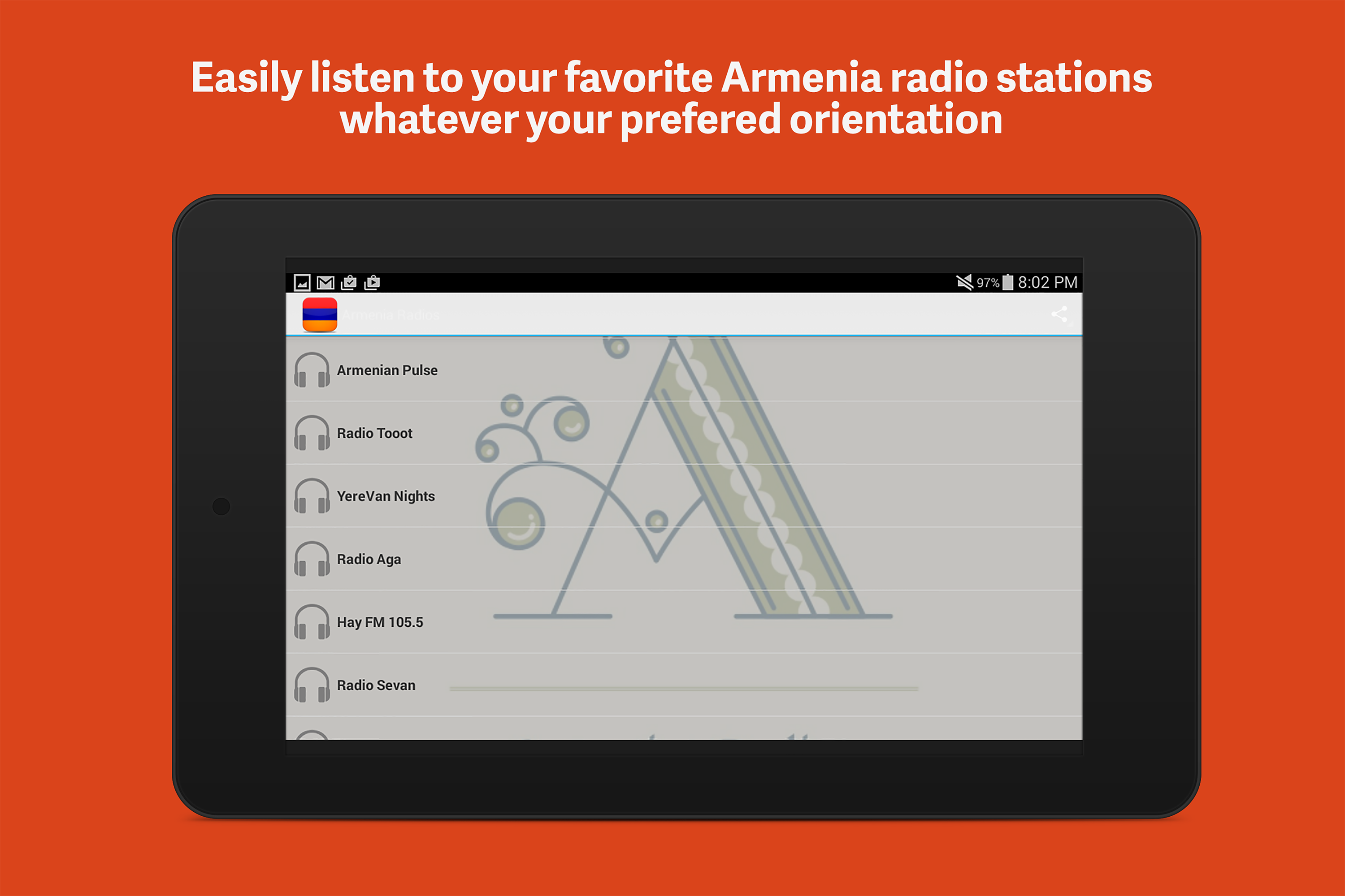 Armenian radios brings collection of your favorite radios and FM stations from Armenia streaming live on your android devices.Now enjoy listening to the online radio broadcasts and music from Armenia live on your android phones and tablet devices with just tap of a button, no matter where you are. . Best of all, you get to access all this for free !! Radios from Armenia include, Radio Armenia Radio Van of Armenia Radio Aurora Radio Mao Armenian Pulse Radio toot YereVan Nights Radio Aga Hay FM 105.5 Radio Sevan Radio Yeraz Radio Ayk Lav Radio PS: All the radios streams are live streams and therefore will only be available 24 hours if the radio stations broadcast 24 hours. Those stations that broadcast limited hours will be available only when it is broadcasting live in local time. Please rate this app and leave any comments or suggestion you may have.