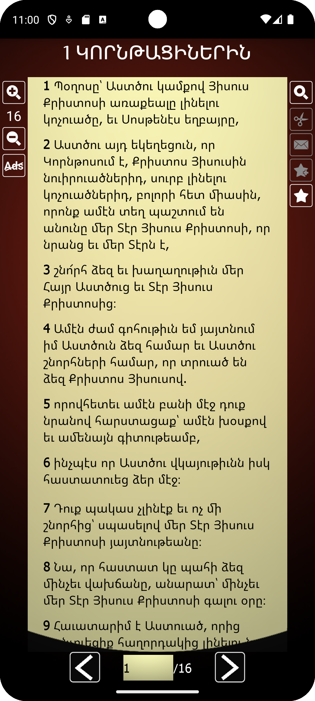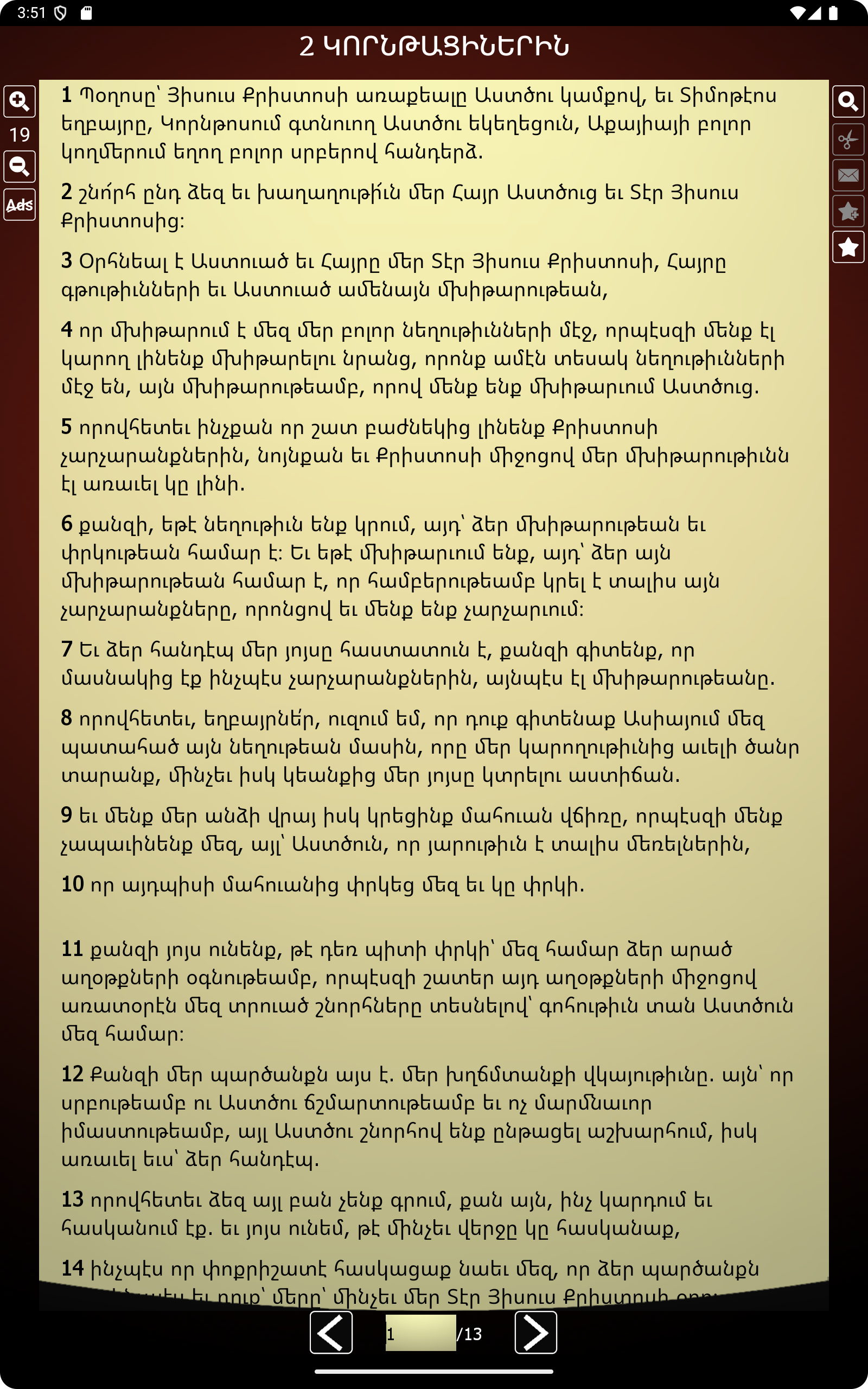 This is a free app that lets you view all the wisdom of the Bible with the help of just a few mouse clicks without the need to connect to the Internet and search for books or testaments. Armenian Bible (Աստվածաշունչը) has got all chapter of Old Testament and New Testament. The Armenian Bible is due to Saint Mesrob's early 5th century translation. The first monument of Armenian literature is the version of the Holy Scriptures. Isaac, says Moses of Chorene, made a translation of the Bible from the Syriac text about 411. This work must have been considered imperfect, for soon afterwards John of Egheghiatz and Joseph of Baghin were sent to Edessa to translate the Scriptures. They journeyed as far as Constantinople, and brought back with them authentic copies of the Greek text. With the help of other copies obtained from Alexandria the Bible was translated again from the Greek according to the text of the Septuagint and Origen's Hexapla. This version, now in use in the Armenian Church, was completed about 434. There are currently four commonly used version of the bible in Armenian. One in Western Armenian, mainly used by Armenians in the diaspora and three translations in Eastern Armenian, commonly used within Armenia, Iran, Russia, Georgia. These translations are "Ararat", published by Armenian Bible Society, "Etchmiadzin translation", published by Armenian Apostolic Church, and "The New World translation", published by Jehovah's Witnesses. Benefits of application: - The application works without an internet connection (offline); - Ability to search; - Ability to increase / decrease the font; - Ability to create an unlimited number of tabs to a particular verse, one of the books; - If you are interested in the allocation of poems you can copy or send a message; - Ability to scroll through the volume buttons. Our team is not in place, and aims to expand its functional applications. User guide: Each menu item is a separate book, and each separate page in one of the books is the head. Place the cursor instead of the chapter number and enter the chapter number. Thus, you will not have to scroll all the chapters, selecting interesting.